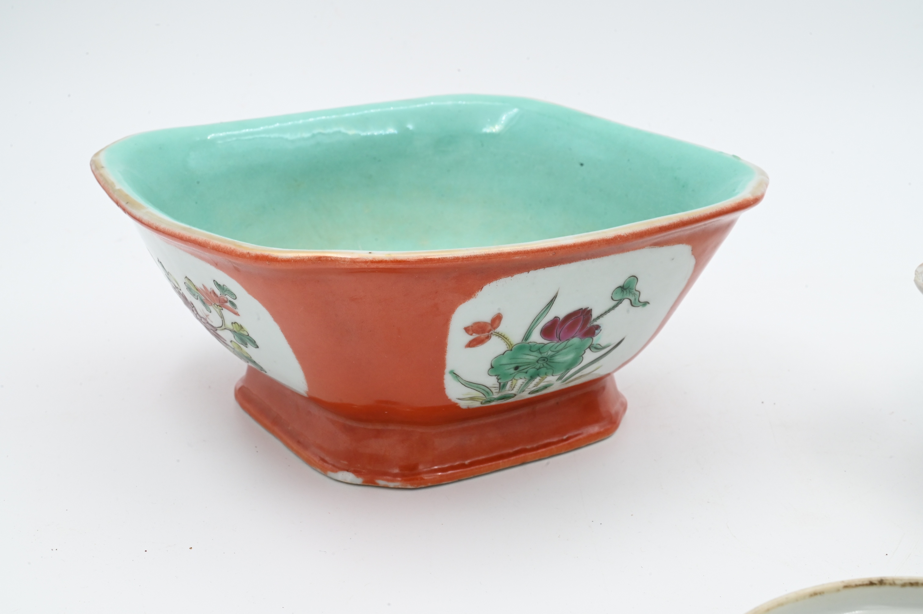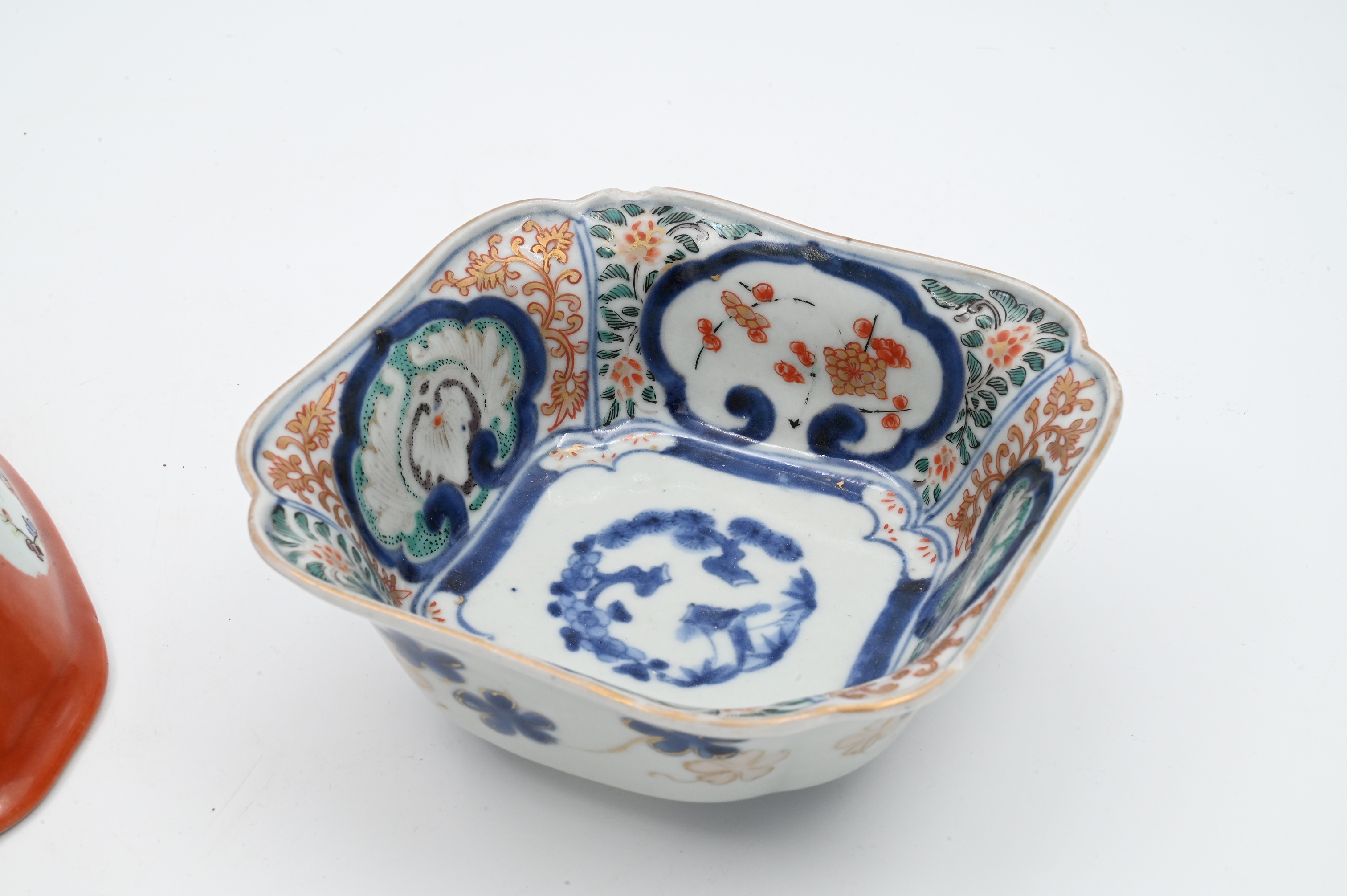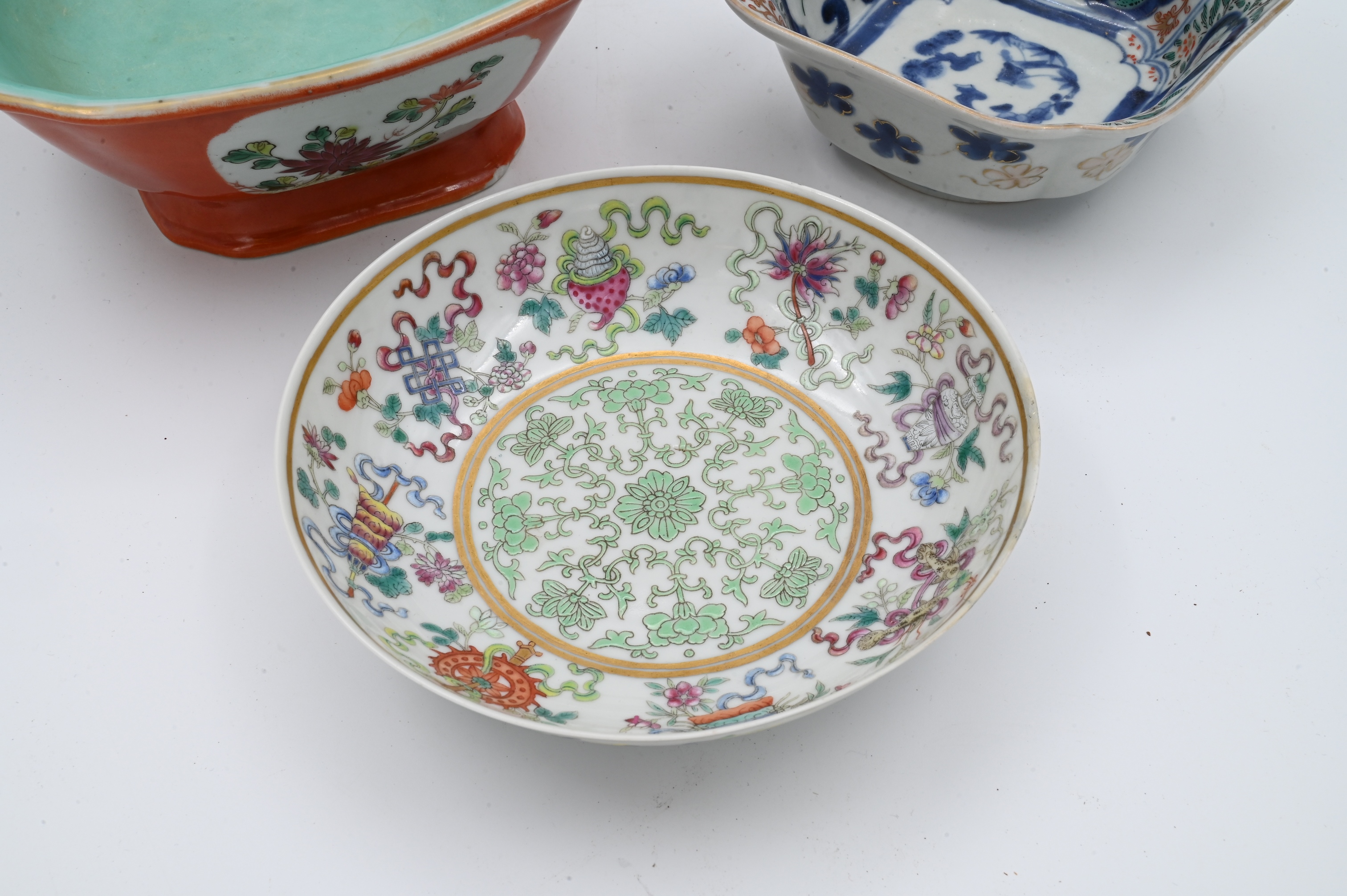 to include square footed orange dish having painted floral panels height 3 1/2 inches diameter 7 1/2 inches, square shaped dish having gilt accents accents and character marks on base, famille rose dish having painted antiques and repairs to rim height 1 5/8 inches, diameter 6 5/8 inches