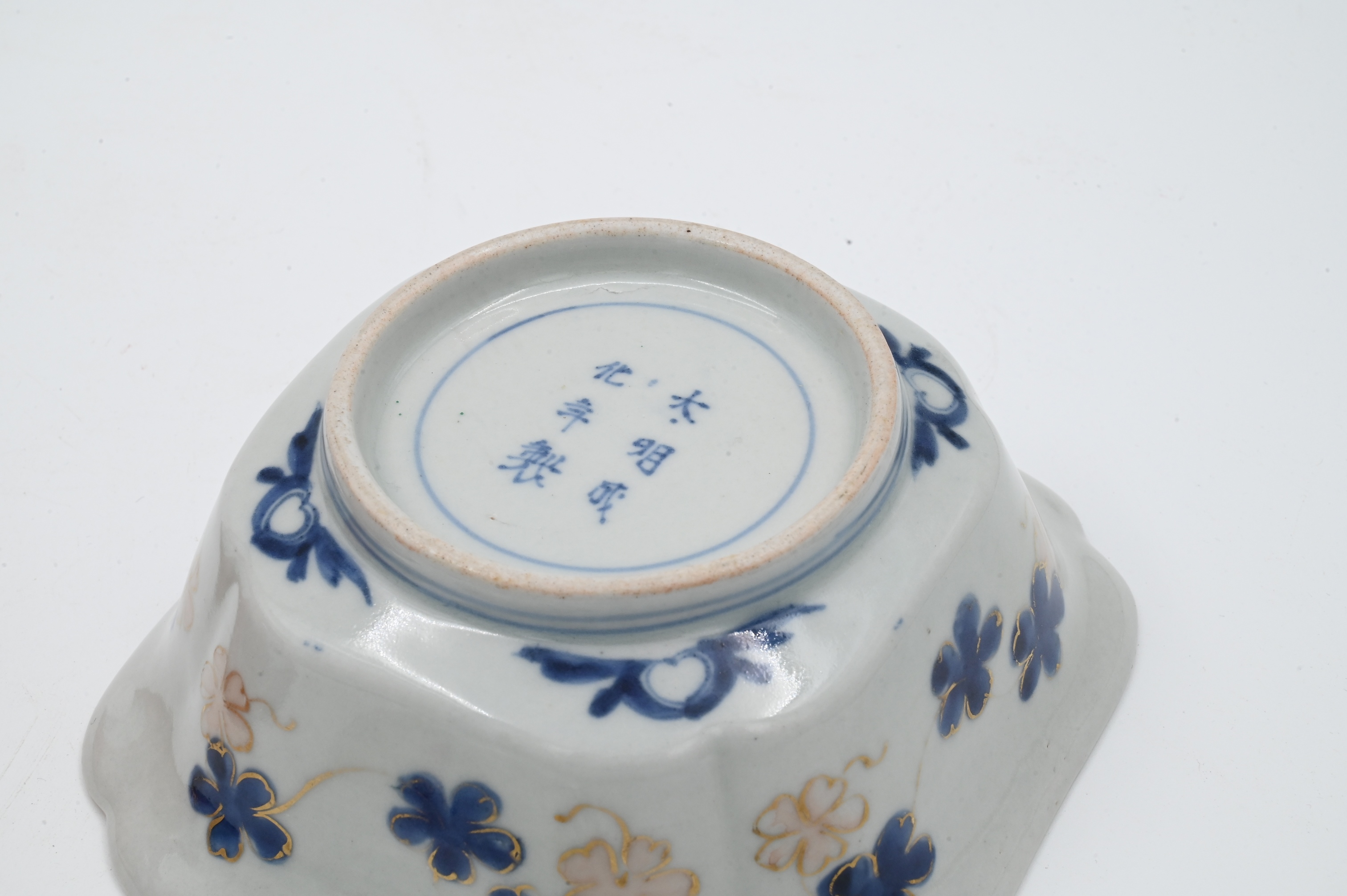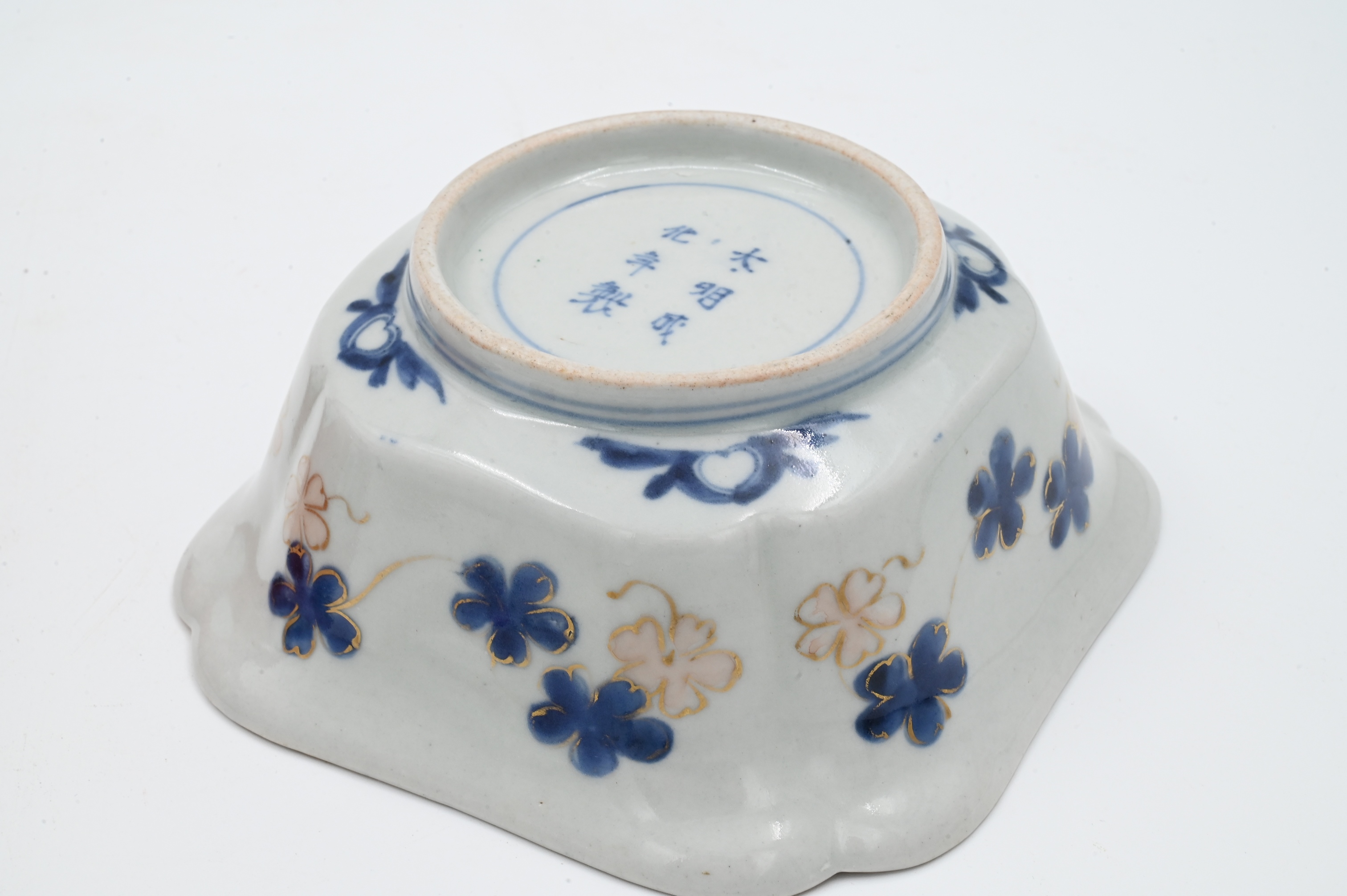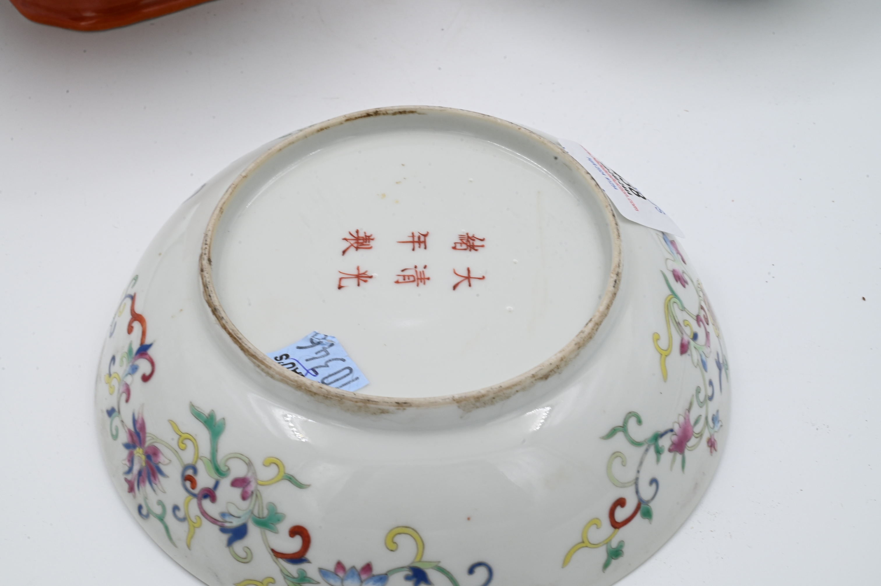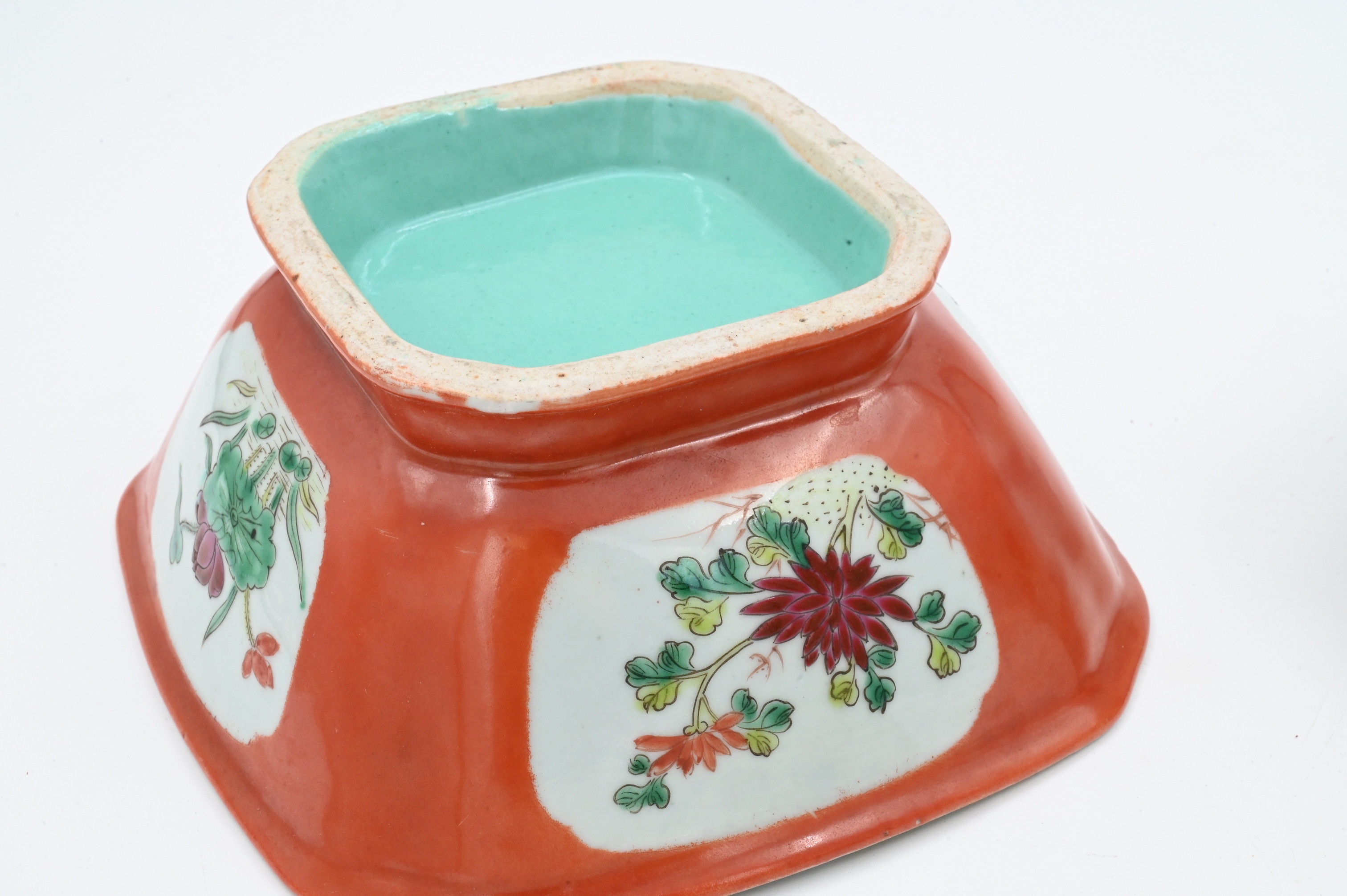 to include square footed orange dish having painted floral panels height 3 1/2 inches diameter 7 1/2 inches, square shaped dish having gilt accents accents and character marks on base, famille rose dish having painted antiques and repairs to rim height 1 5/8 inches, diameter 6 5/8 inches