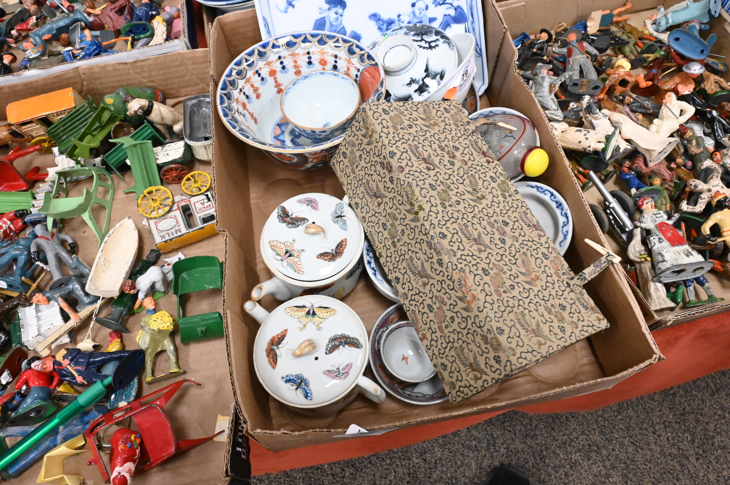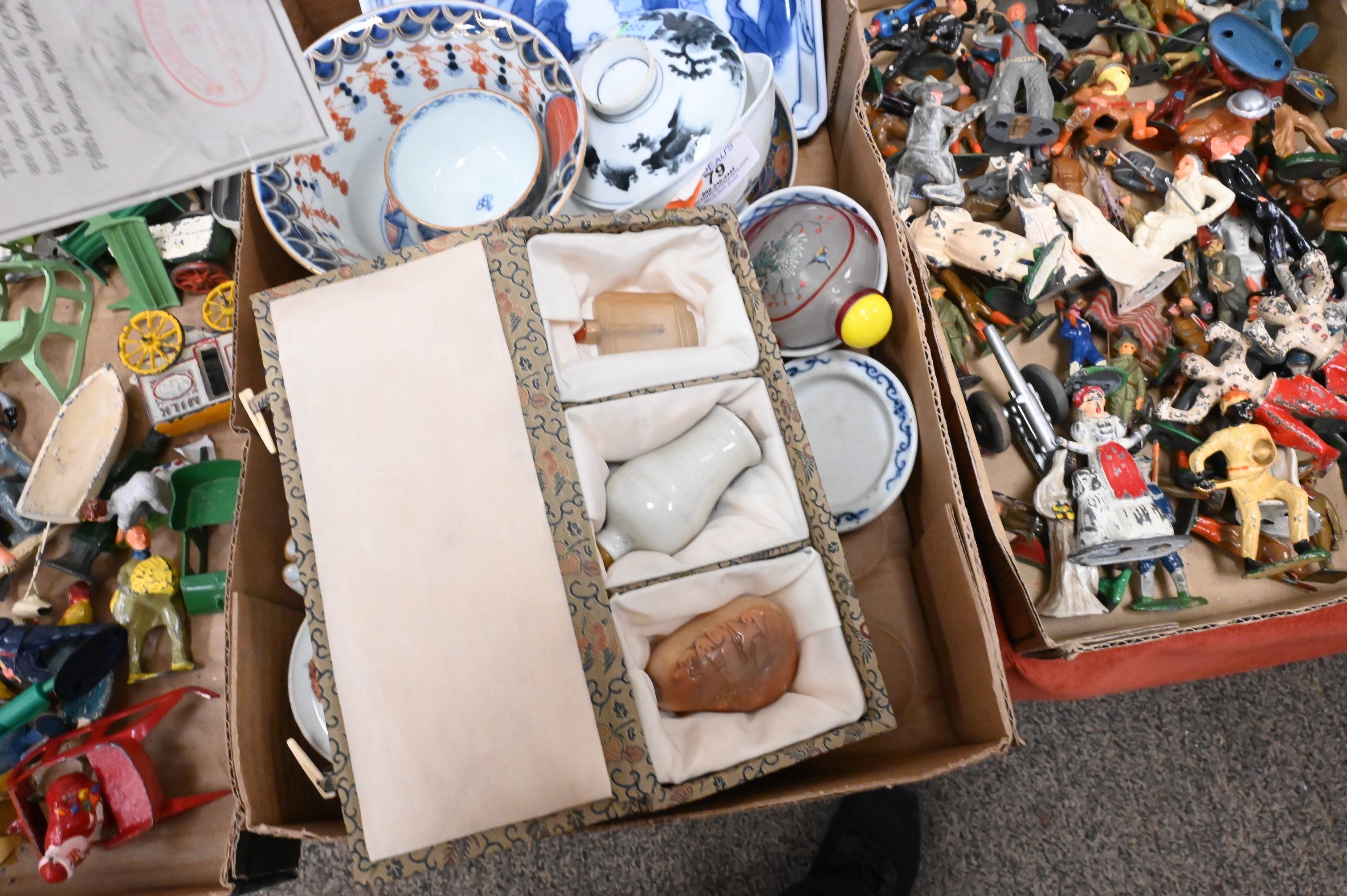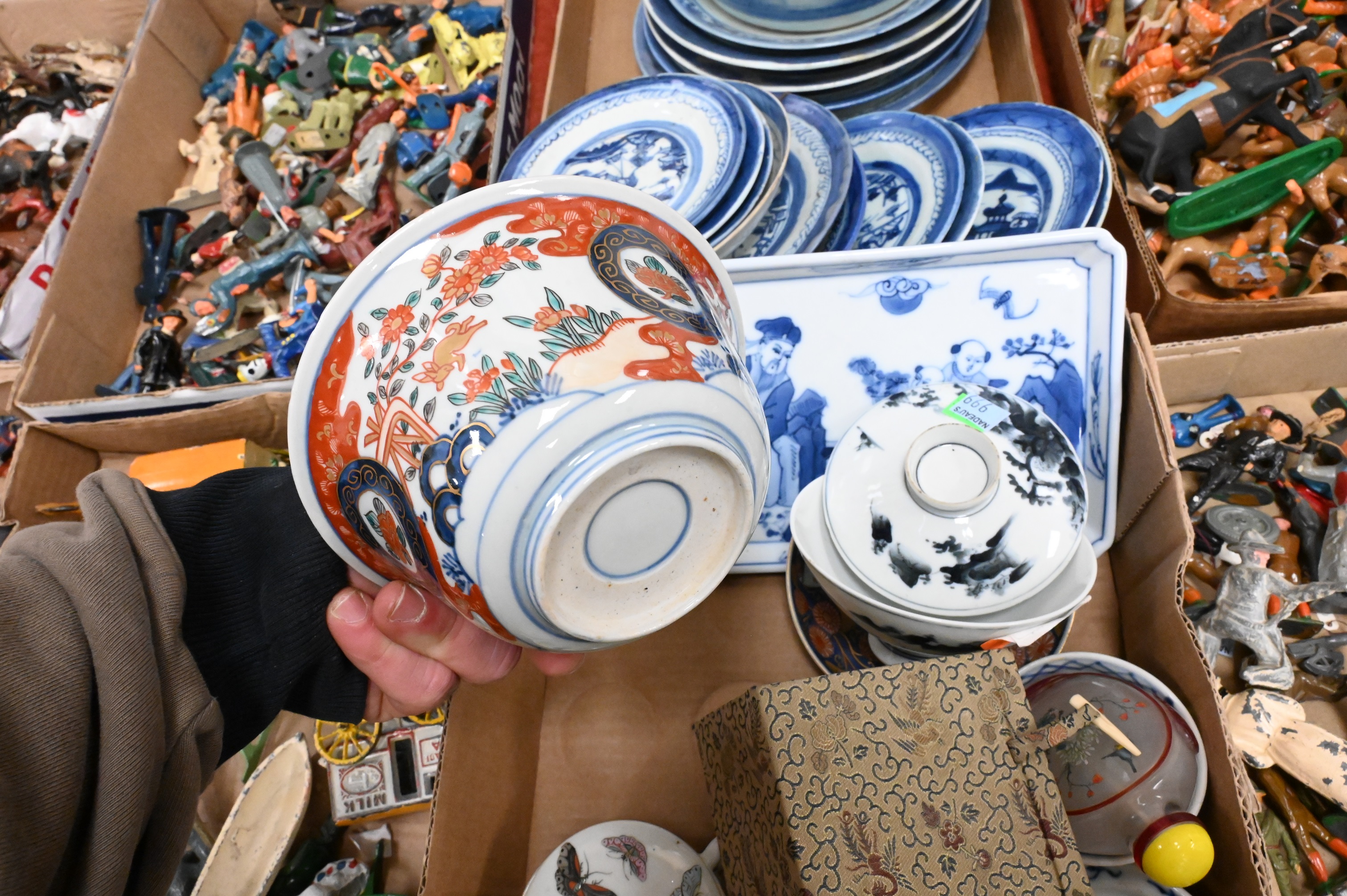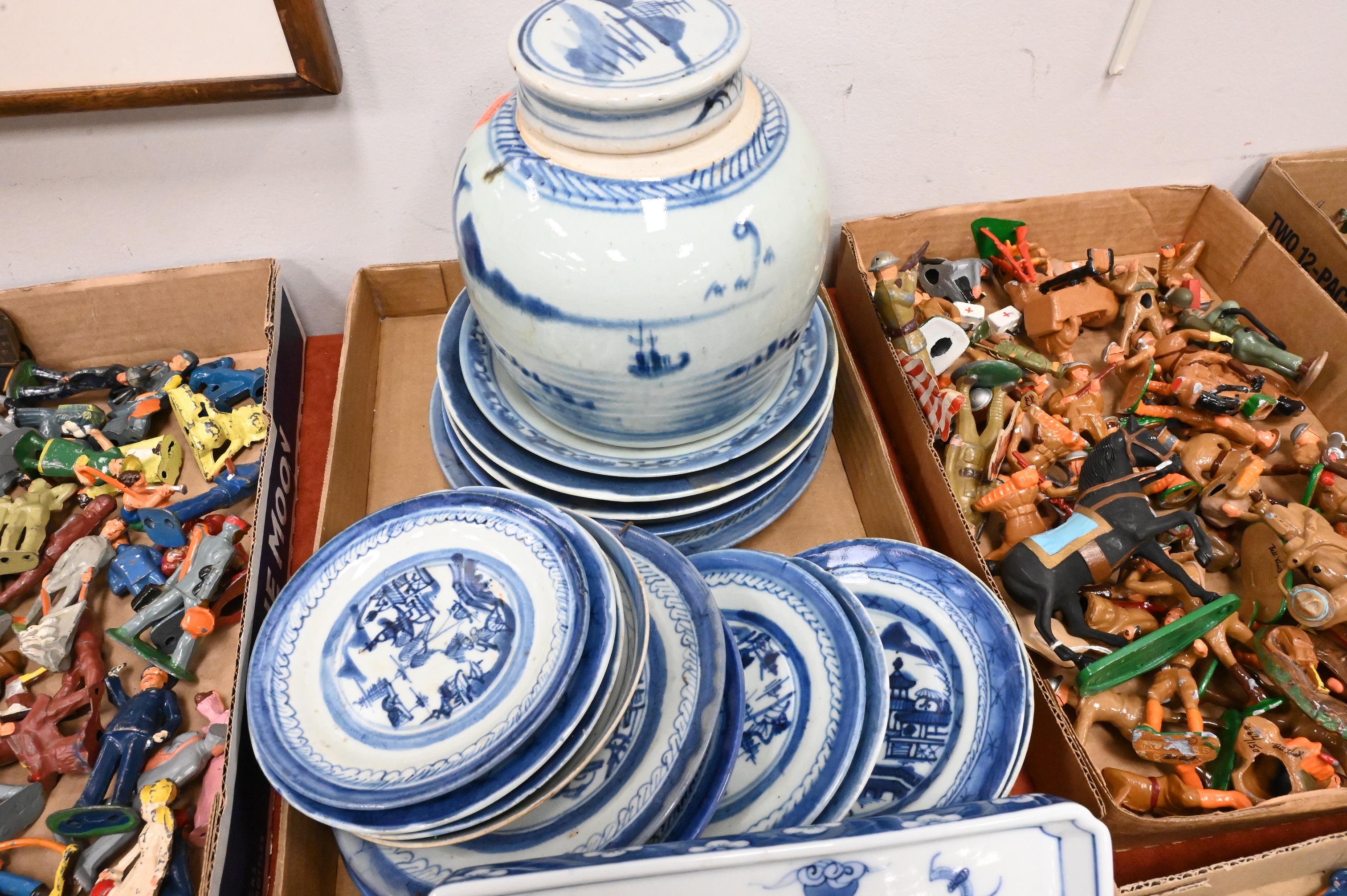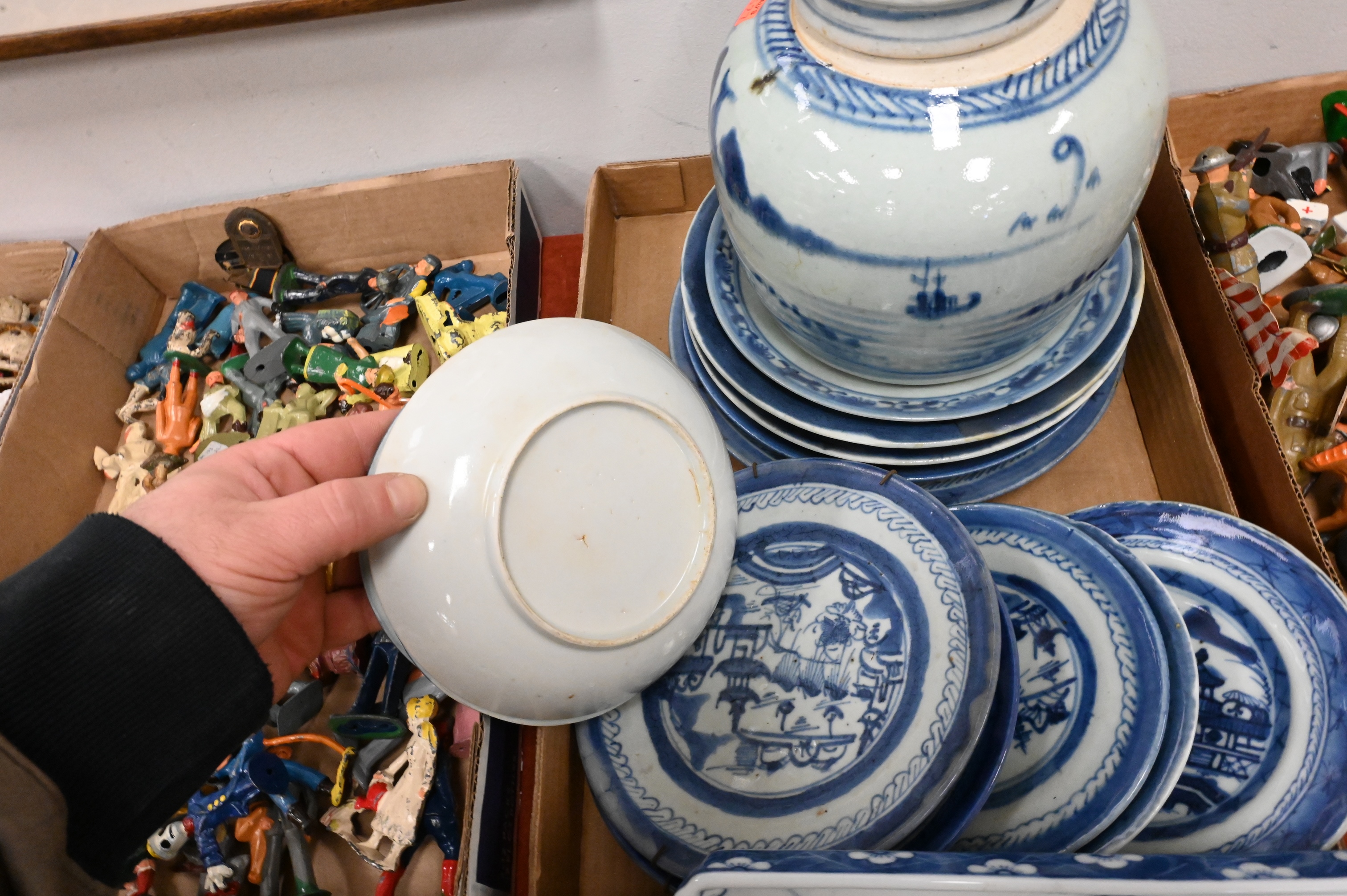 to include Canton plates and jar along with blue and white cups, Famille Rose mini cup, saucers, and snuffs
