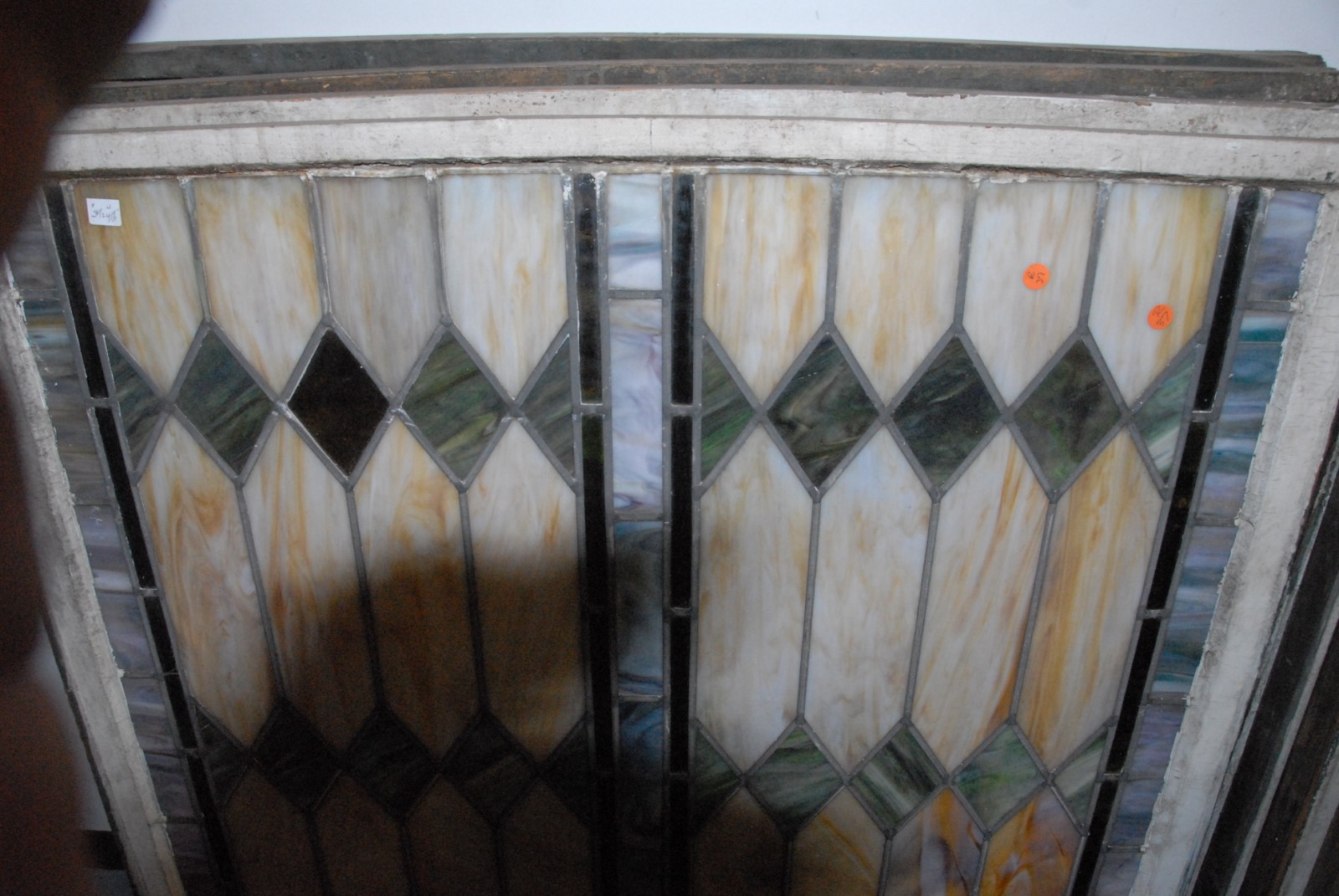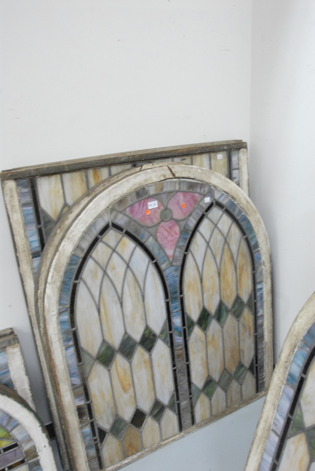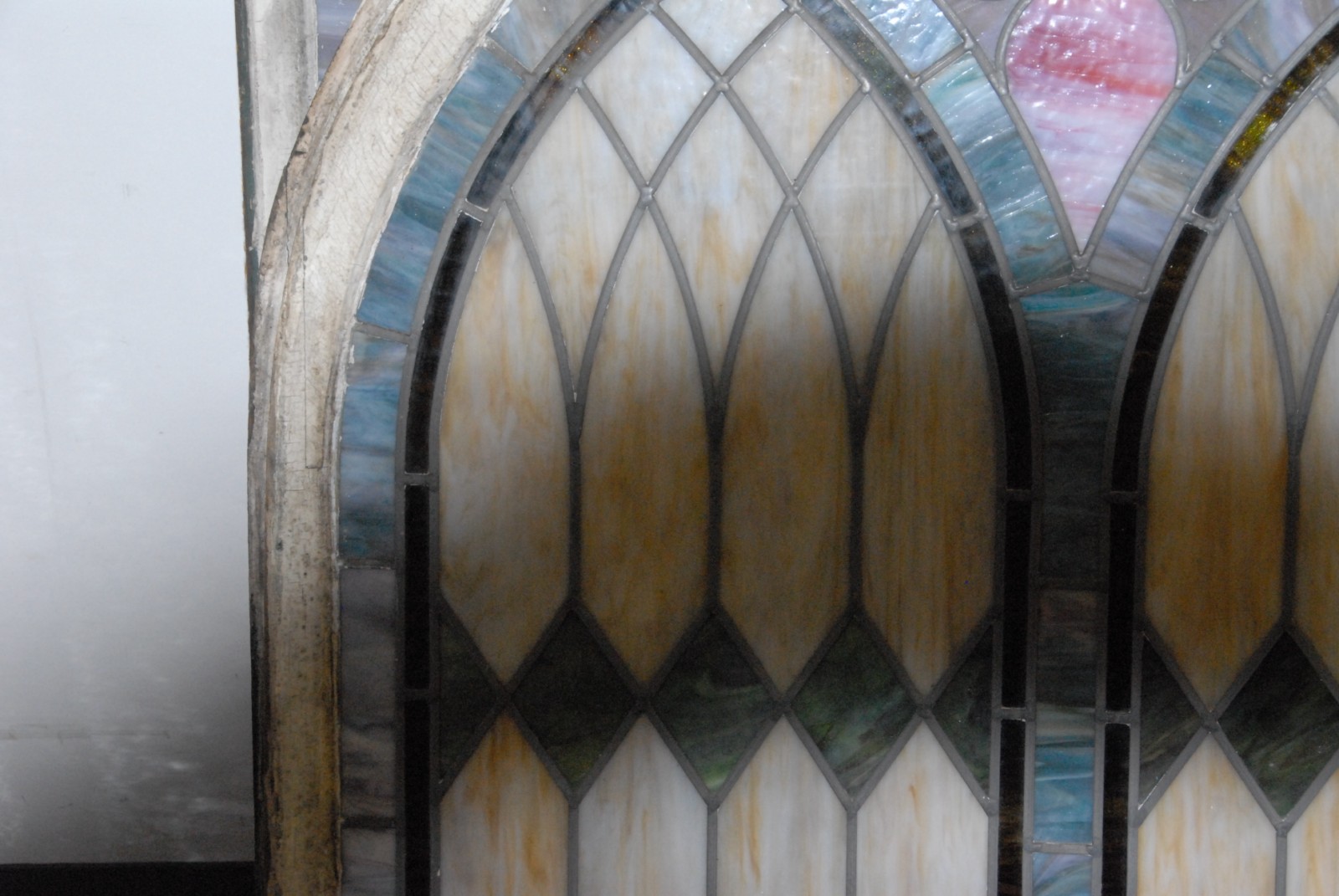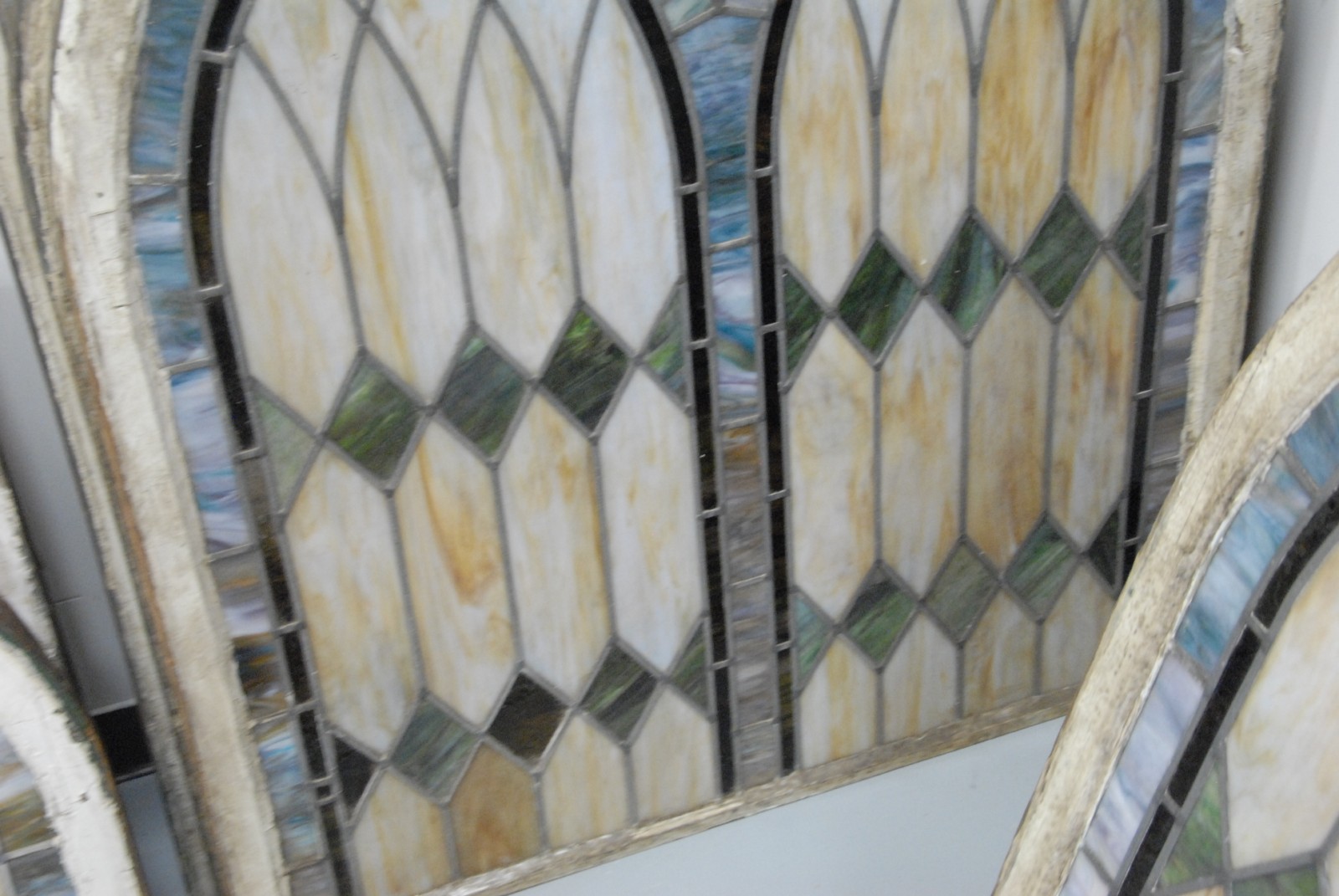 Four pairs of leaded and stained glass windows four rectangle and four with round tops.