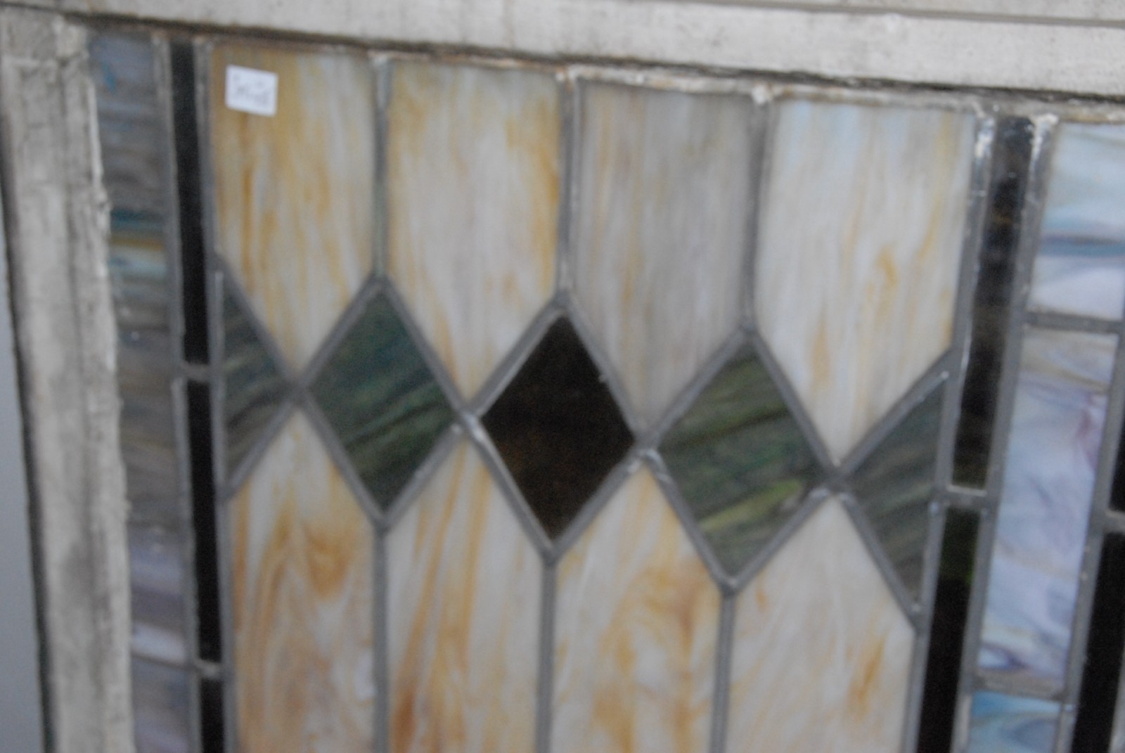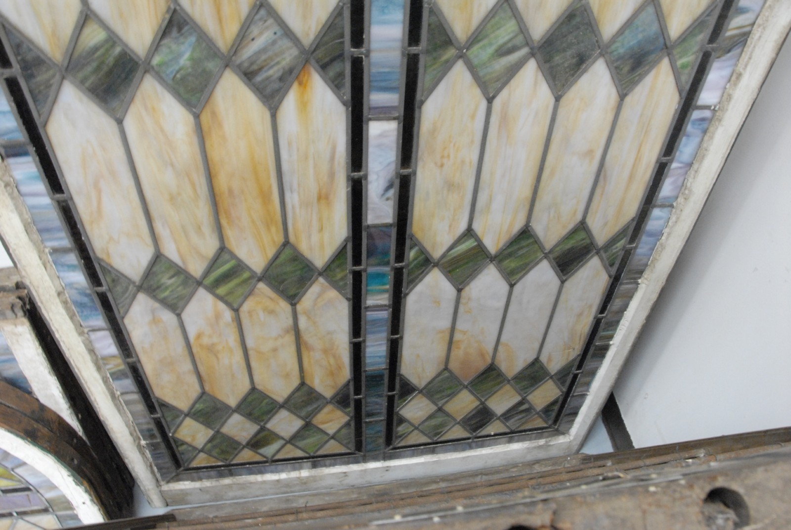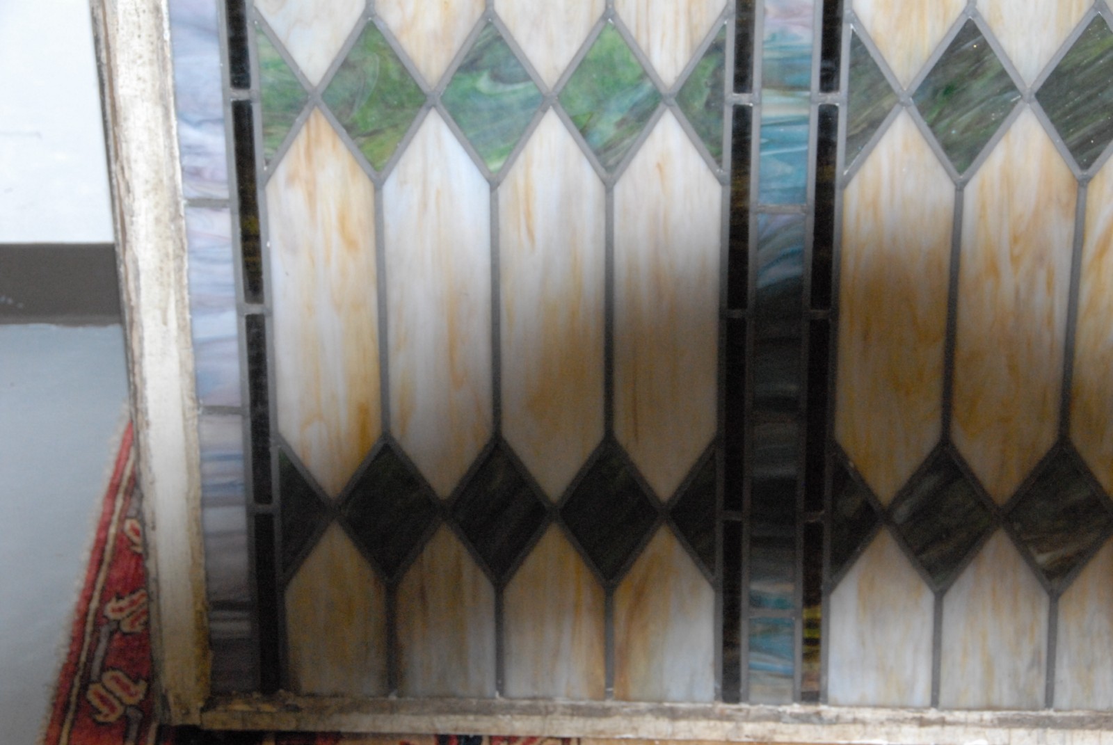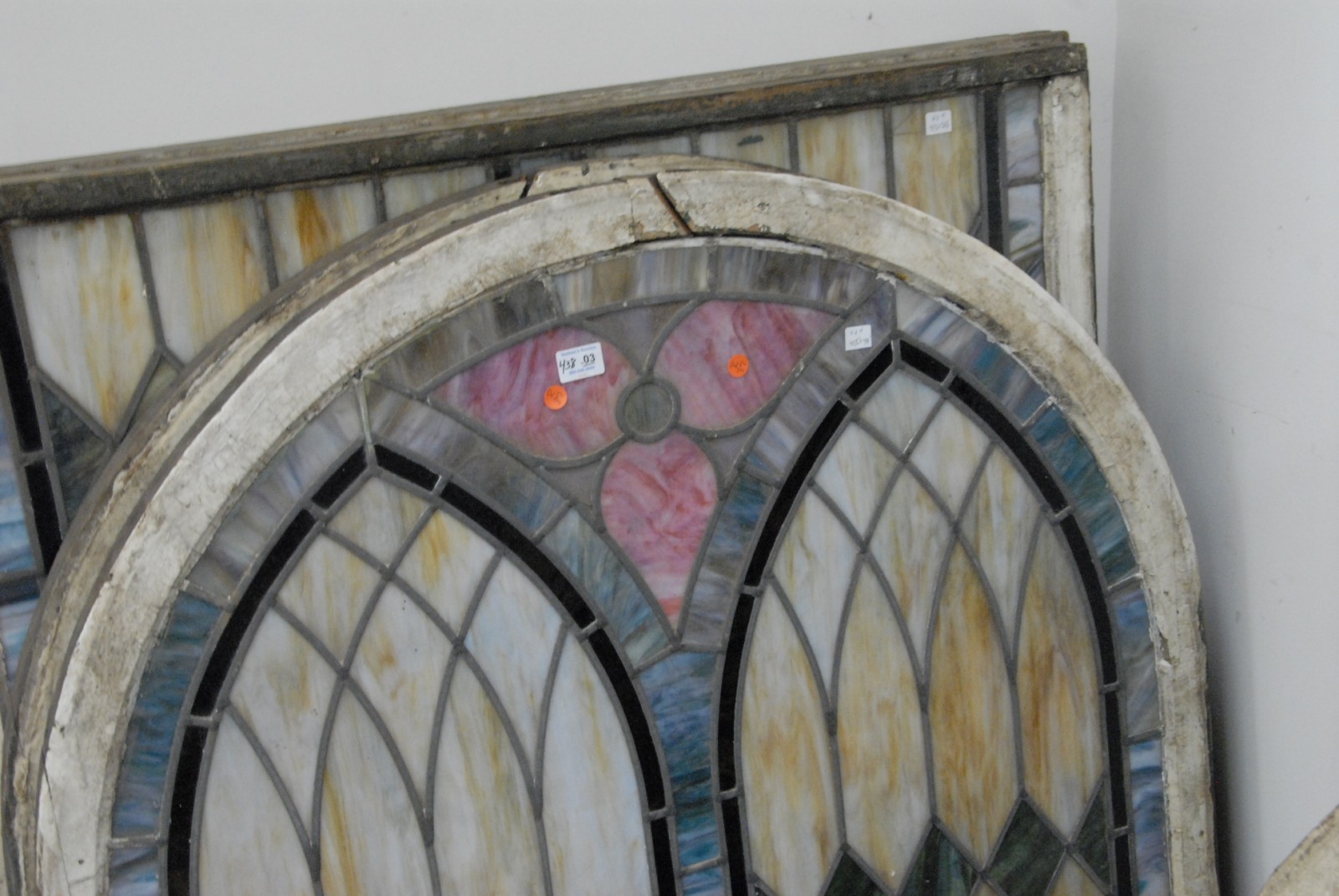 Four pairs of leaded and stained glass windows four rectangle and four with round tops.