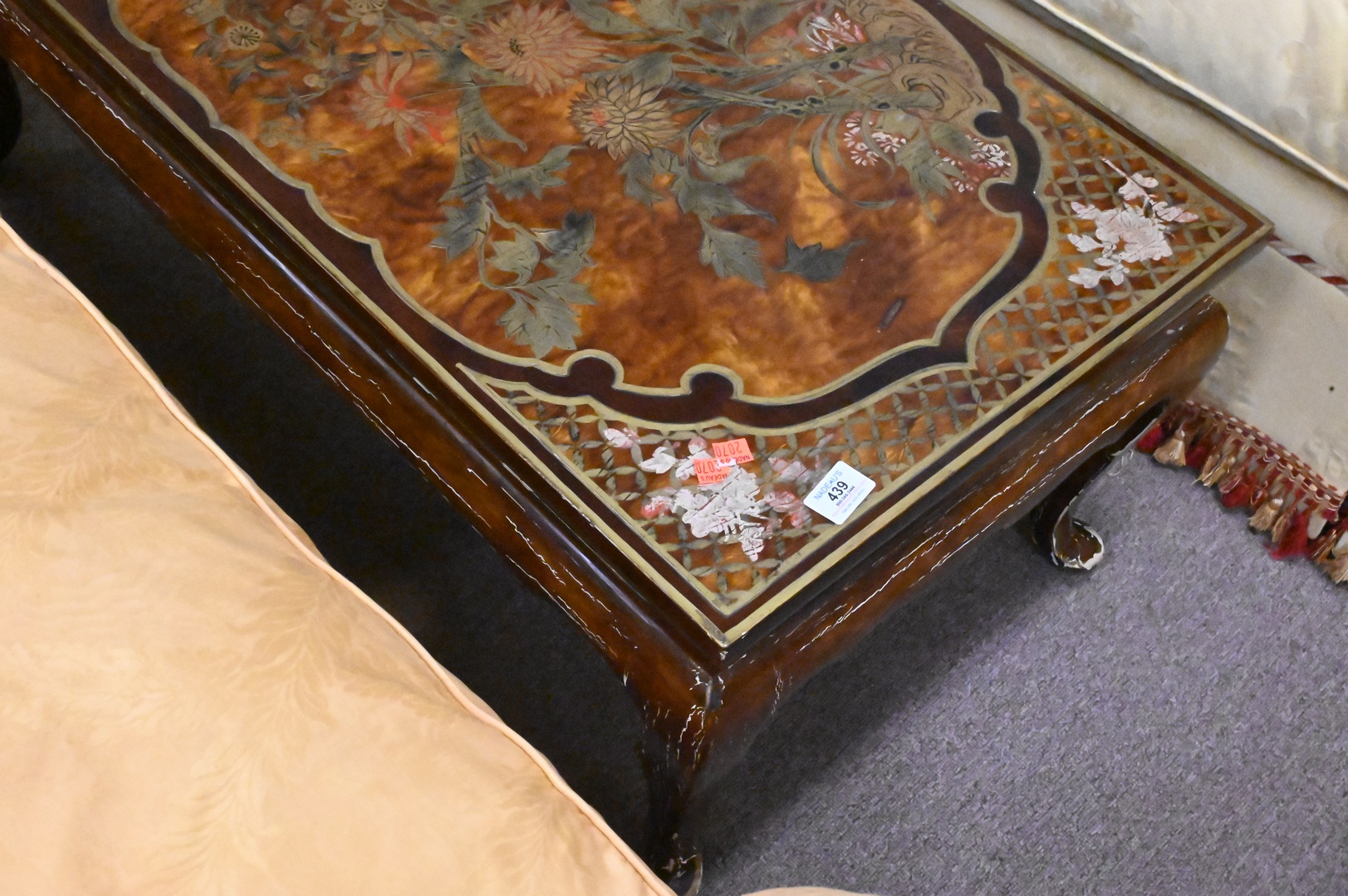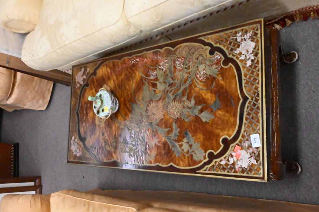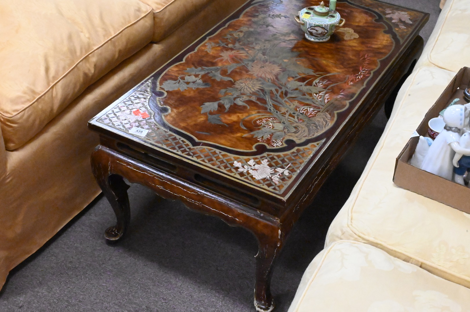 Asian Style Coffee Table, having paint decorated top, with wear, height 15 1/2 inches, length 39 1/2 inches.