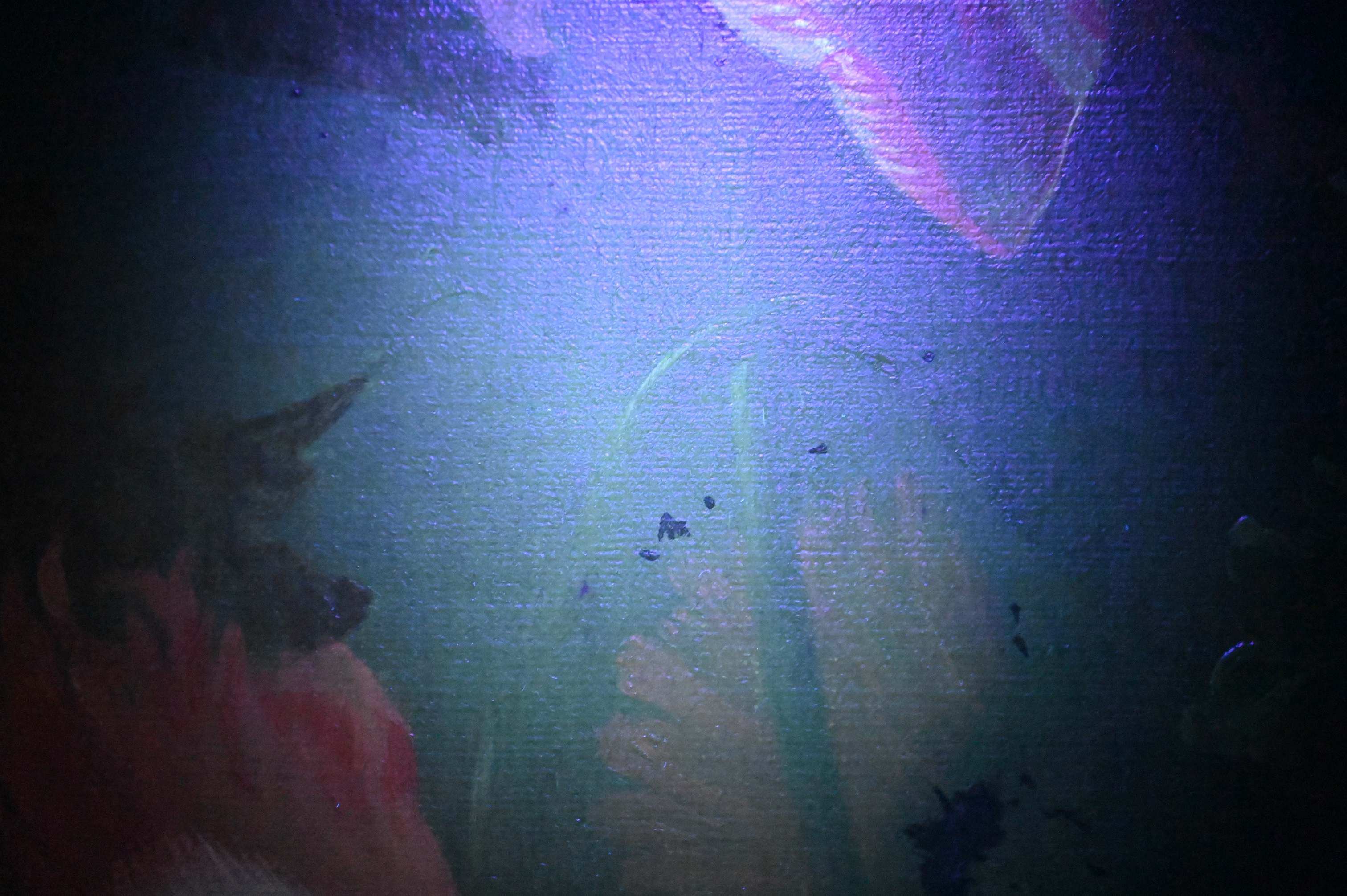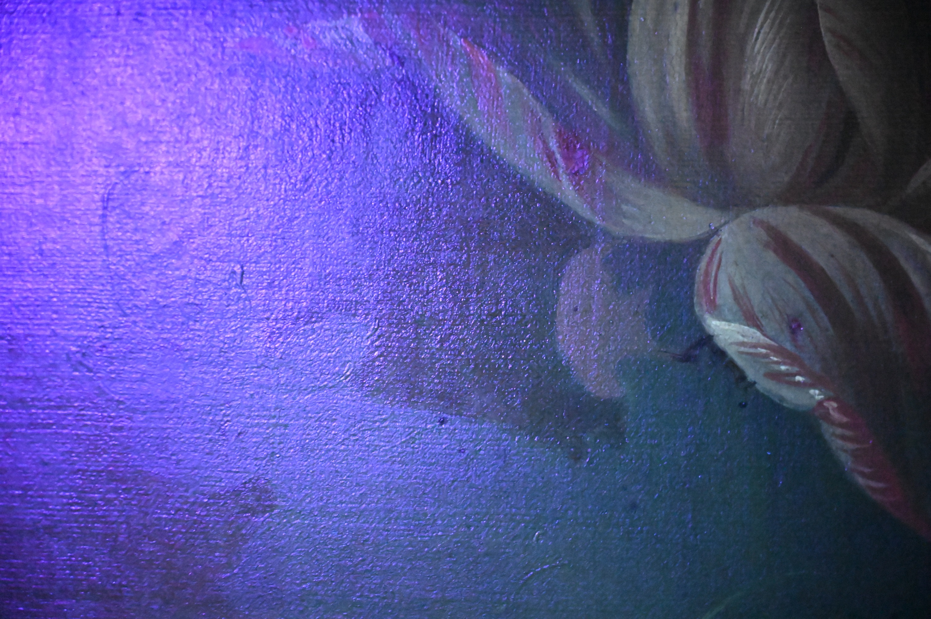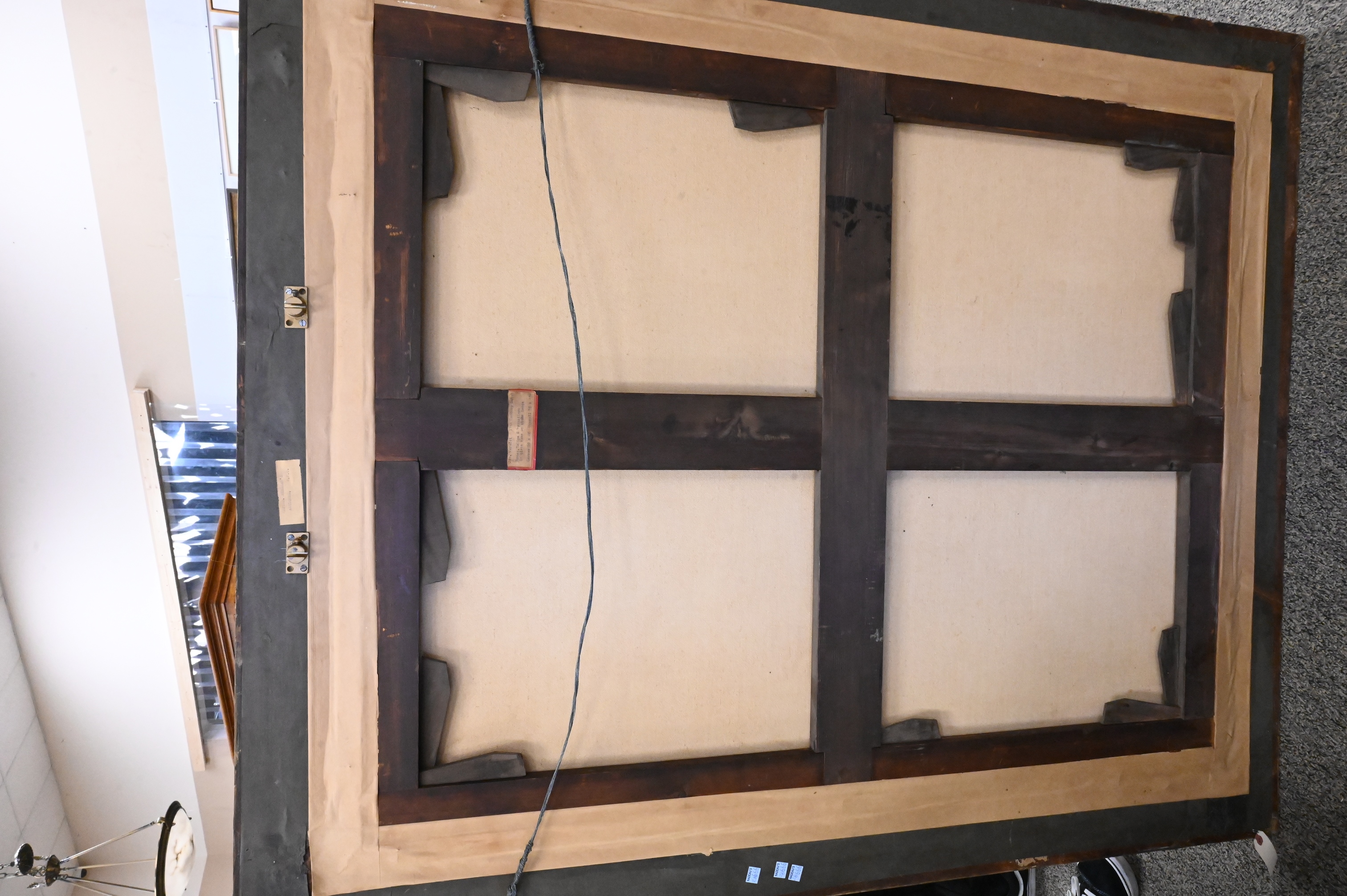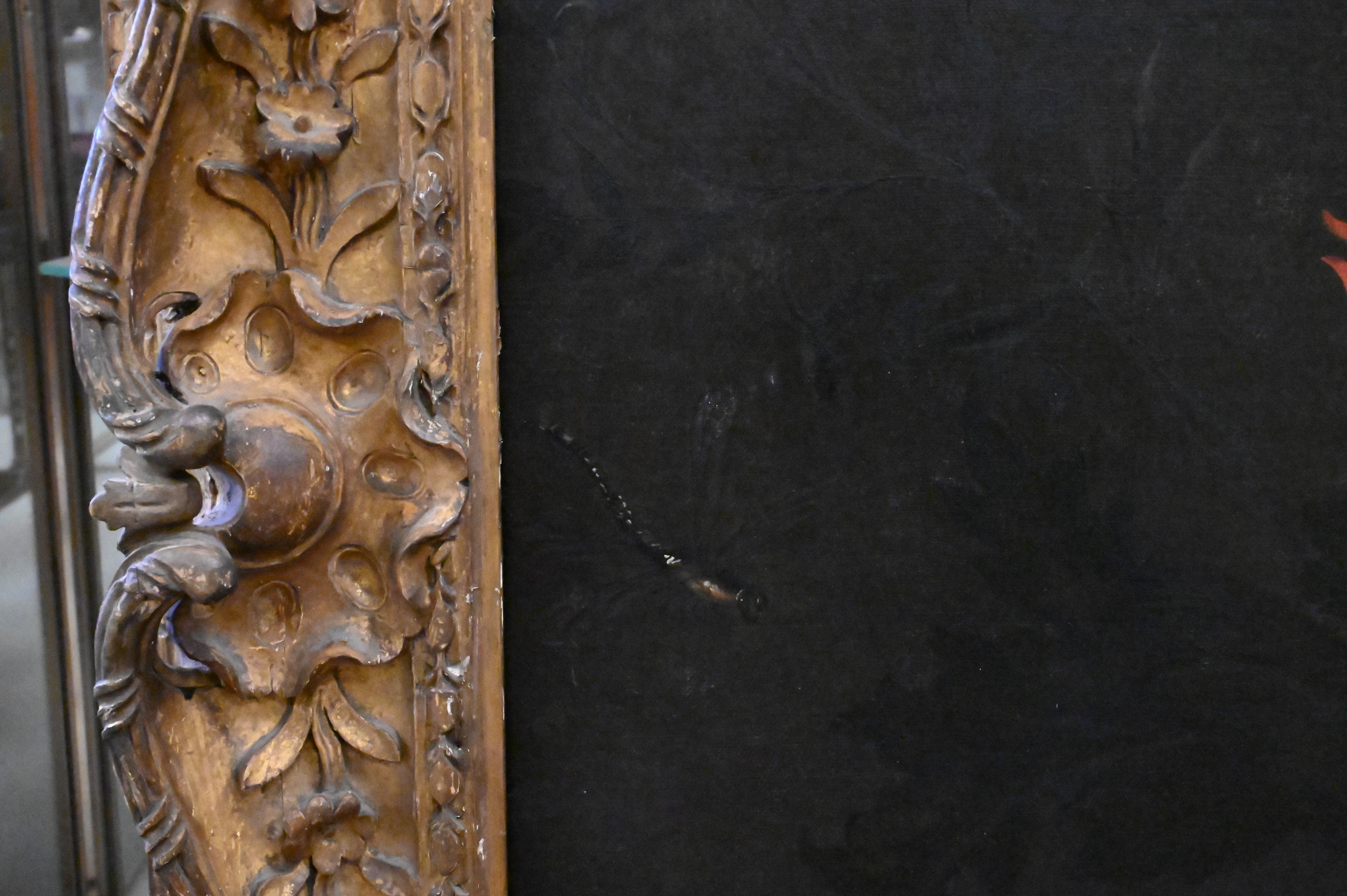 Condition: presents well, relined and restretched canvas, subtle craquelure throughout, repaired central vertical abrasion, small repairs throughout, inpainting throughout.