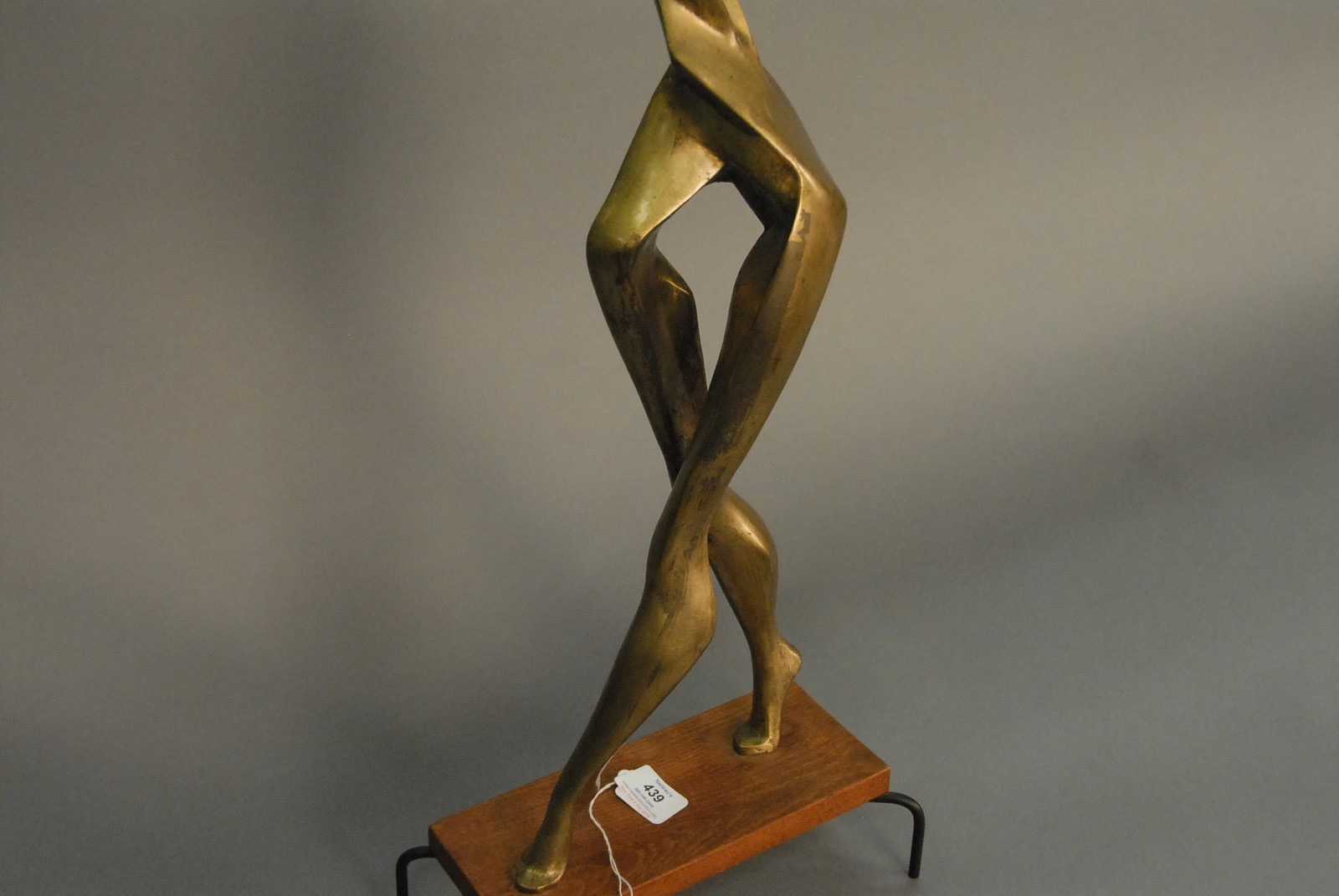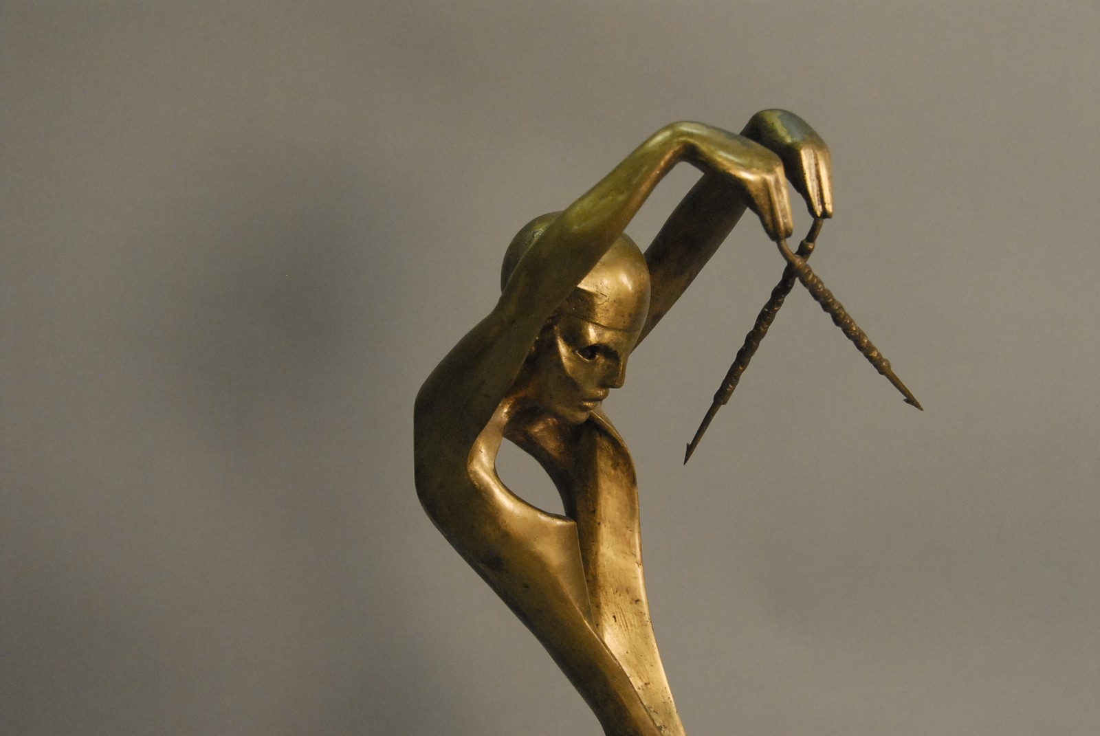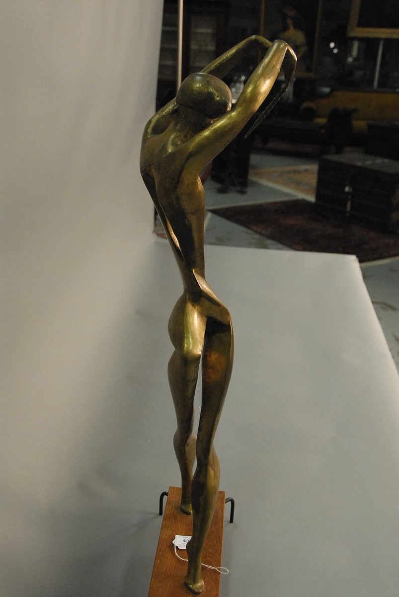 Contemporary bronze figure of dancer with two spears on wood base, height 32in.