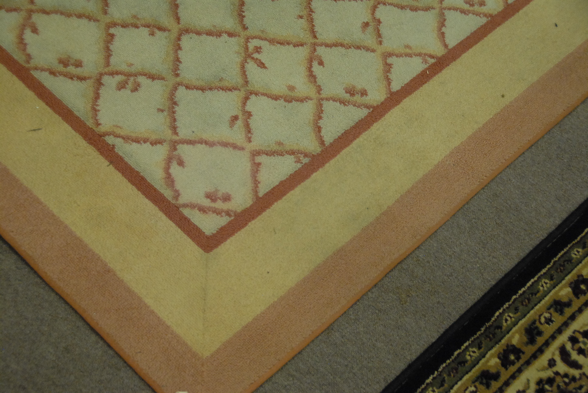 Custom yellow, tan, and white carpet, 8’1 x 14’10.