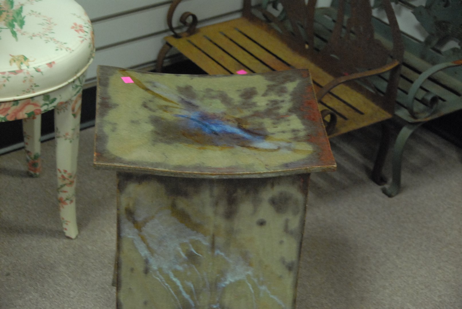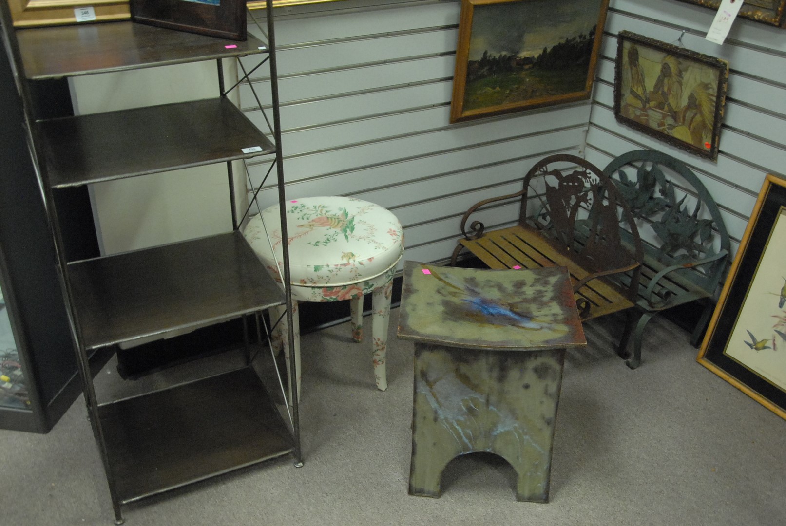 Four piece lot including two child’s outdoor metal benches, stoneware glazed stool, metal and wood stand, and a stool. stand: ht. 49 1/2 in. wd. 18 in. dp. 16 1/2 in. stool: ht. 19 in. top: 13 x 15 1/2