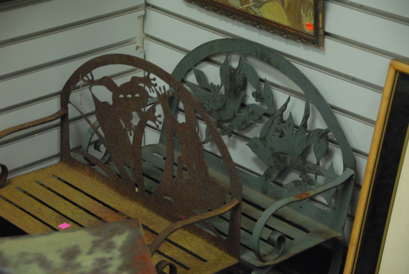 Lot 439: Four piece lot including two child’s outdoor metal benches, stoneware glazed stool, metal and wood stand, and a stool. stand: ht….