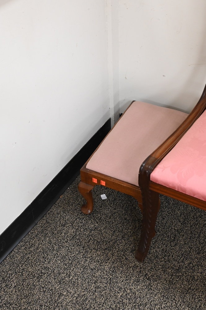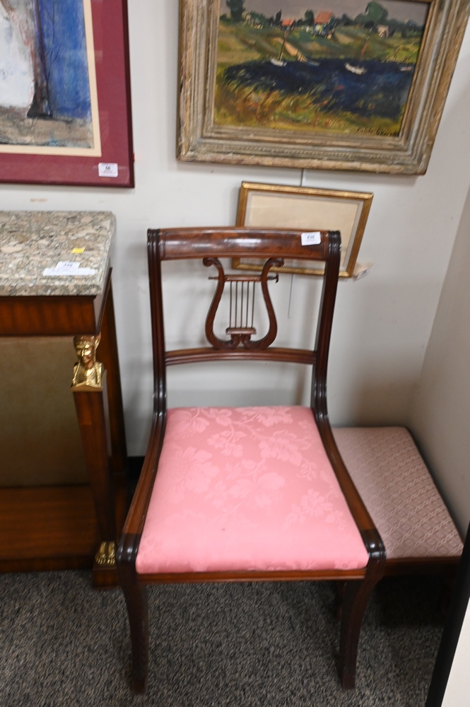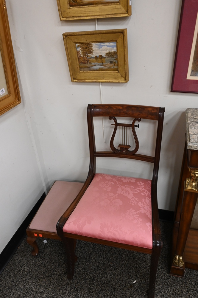 Lot 439: Four Piece Lot of Custom Margolis Mahogany, to include pair of Duncan Phyfe style chairs and pair of foot stools, both chairs and stool signed.