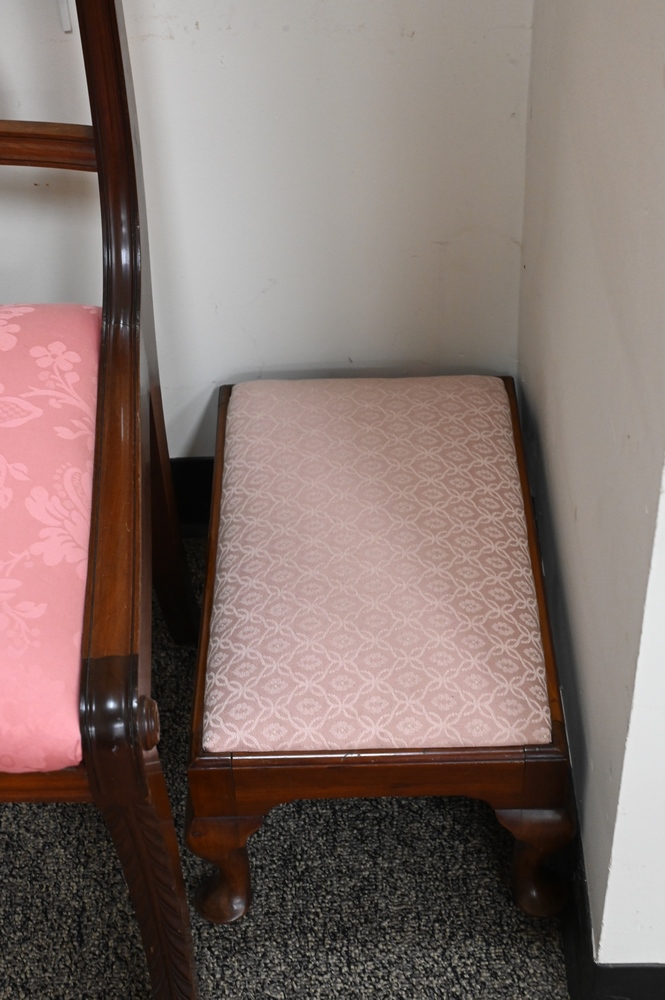 Four Piece Lot of Custom Margolis Mahogany, to include pair of Duncan Phyfe style chairs and pair of foot stools, both chairs and stool signed.