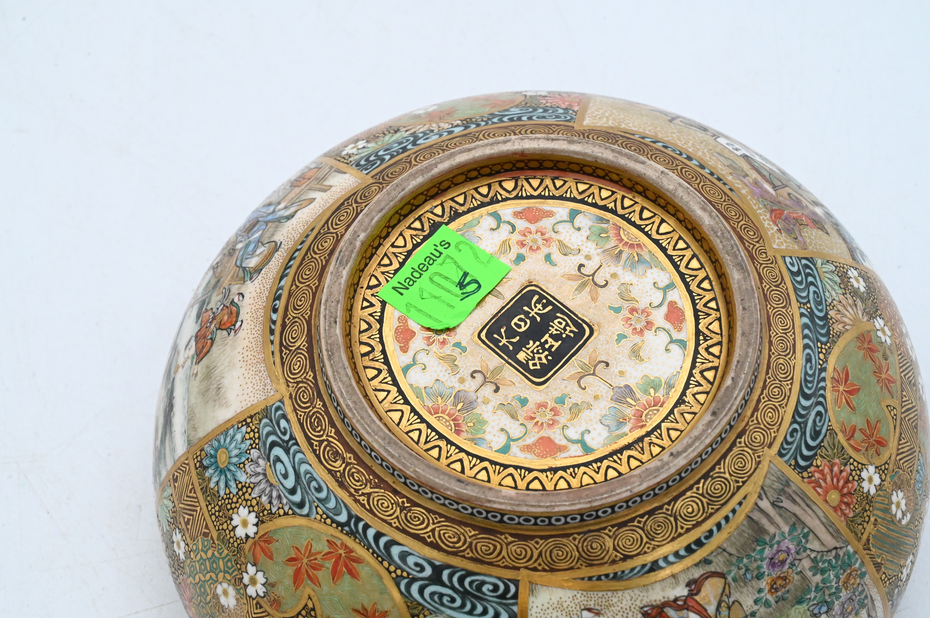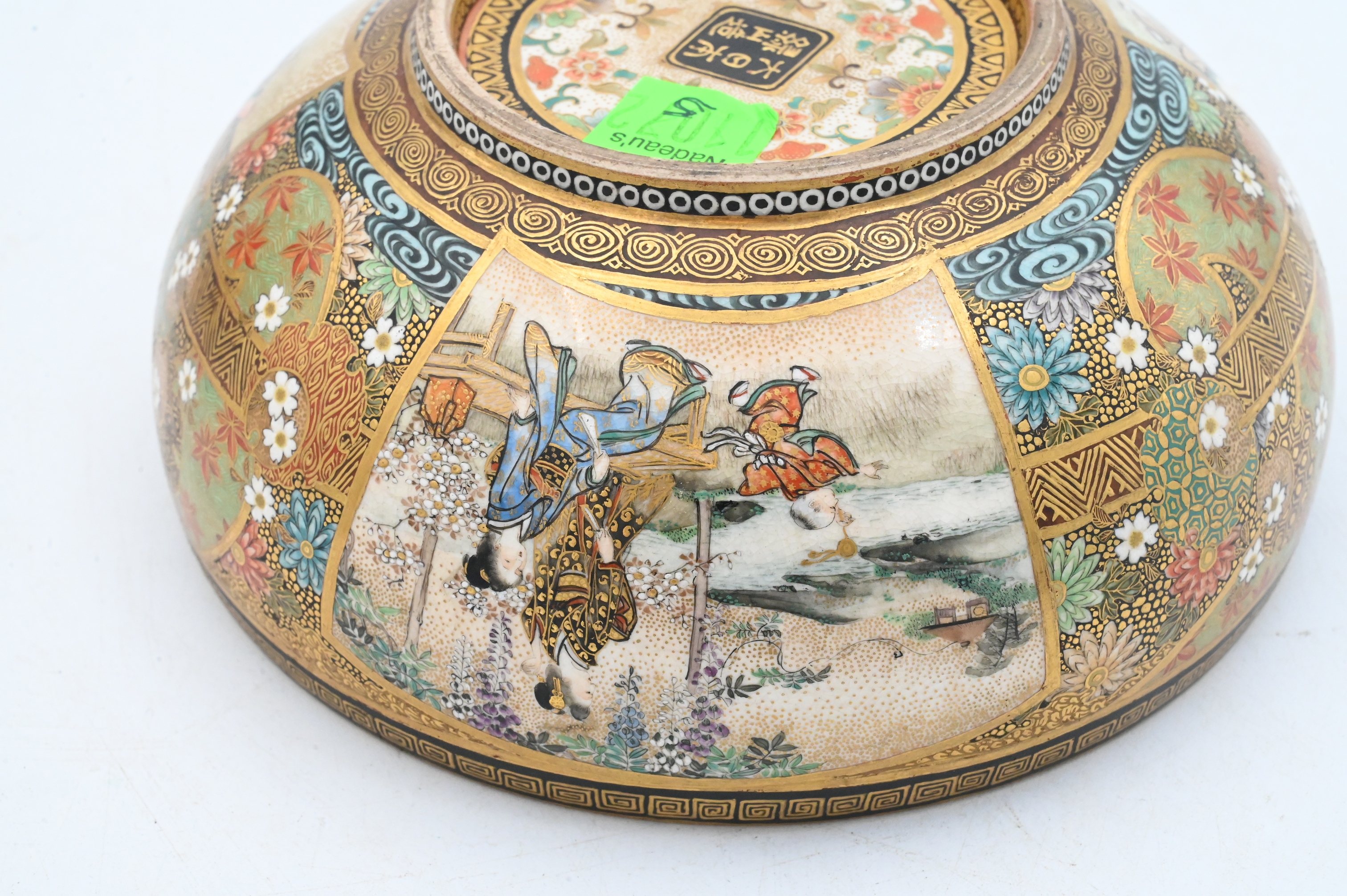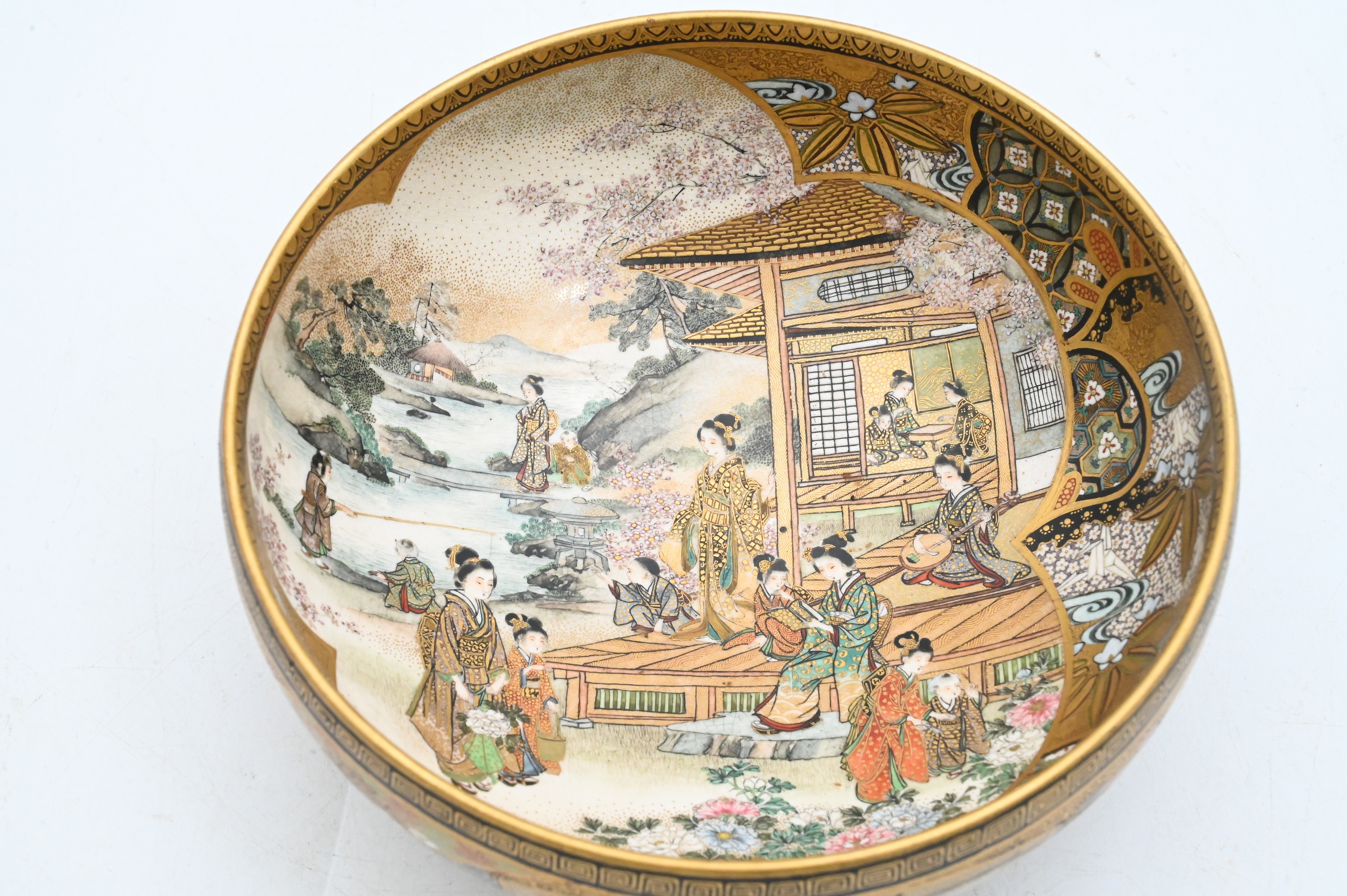 A finely painted Japanese Satsuma bowl, the interior decorated with an elaborate figural scene of scholars and attendants in a pavilion and garden landscape, with gilt and polychrome detailing throughout. The exterior panels with alternating floral and figural reserves, all within gilt borders. Signed on the base in gold characters within a cartouche.