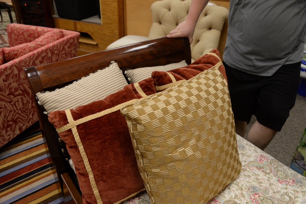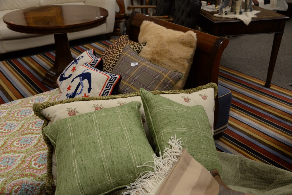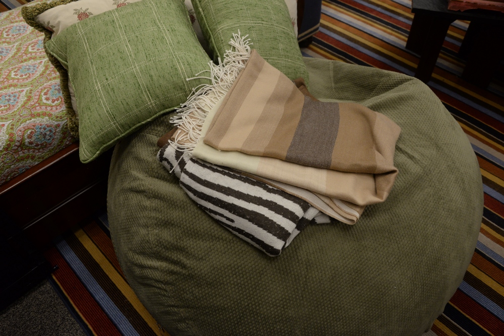 Lot 439: Large Group Lot, to include decorative pillows and blankets along with a CordaRoy’s green bean bag chair, Provenance: David and Cynt…