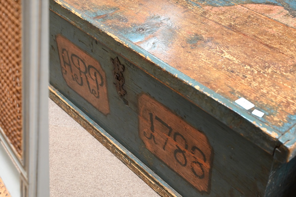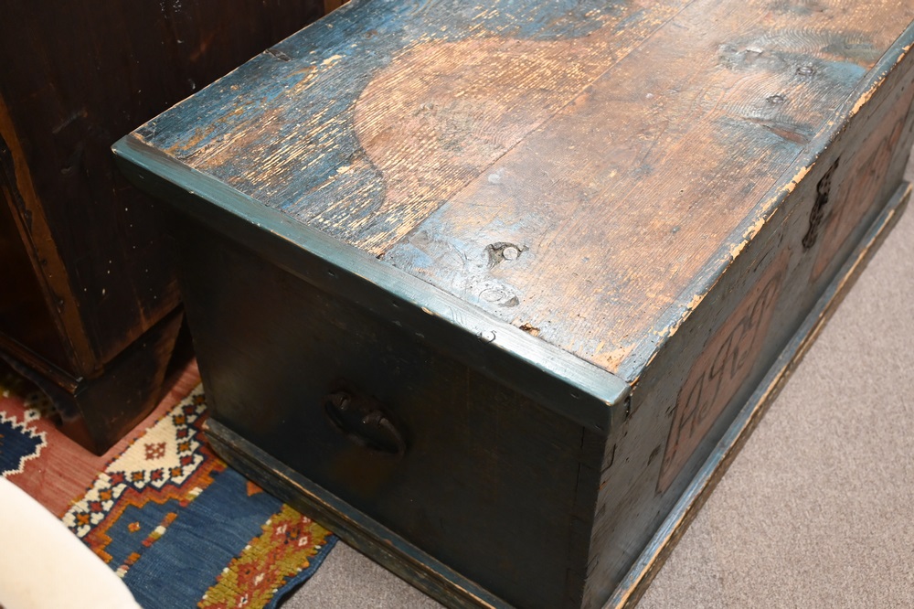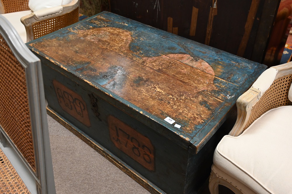 Lot 439: Lift Top Chest, in old paint, marked ARP 1788, having iron handles, 18th century, locked with no key, height 21 inches, top 26 x 46 inches.