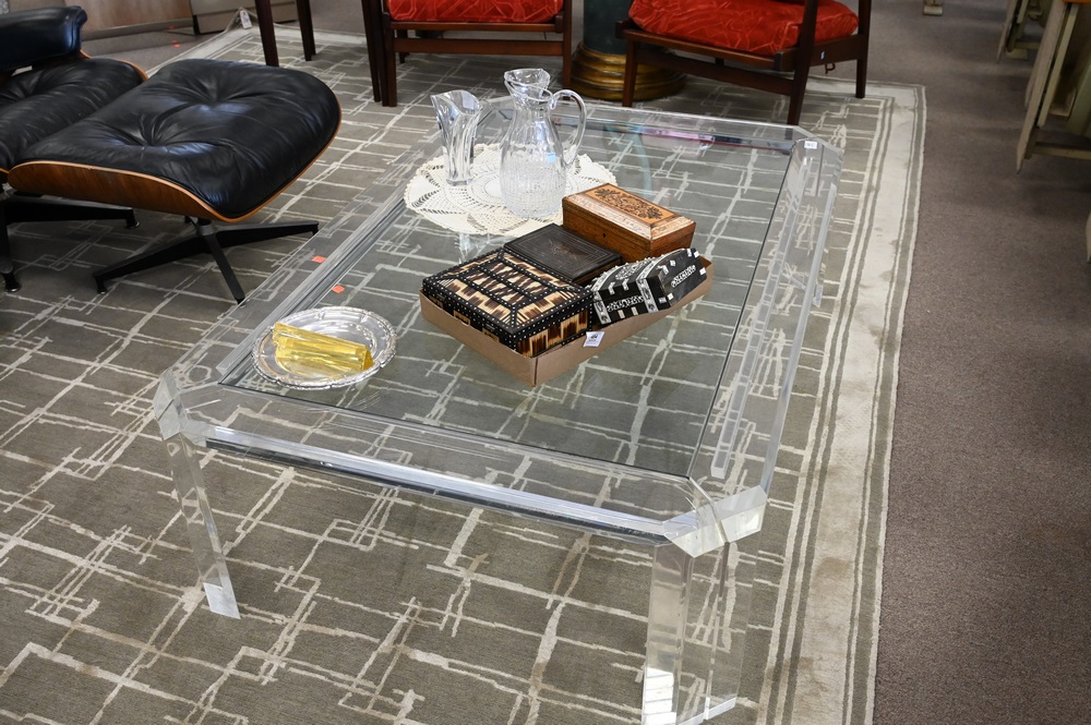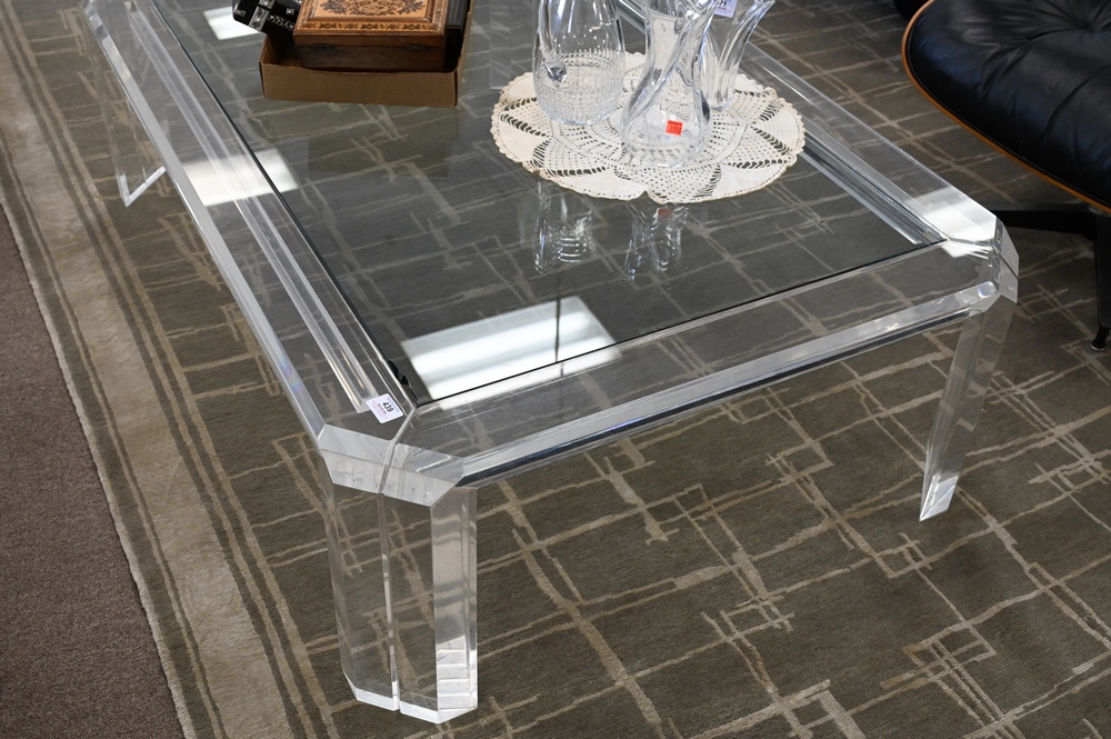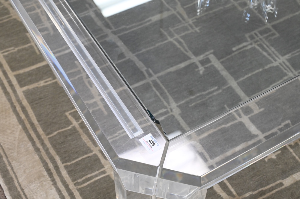 Lot 439: Lucite Glass Coffee Table, rectangle having inset glass with lucite base possibly Karl Springer, chipped glass, height 16 inches, top 36″ x 54″. Provenance: From a private New York City collection.