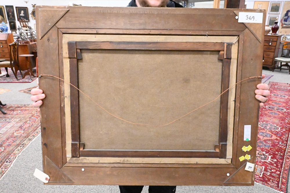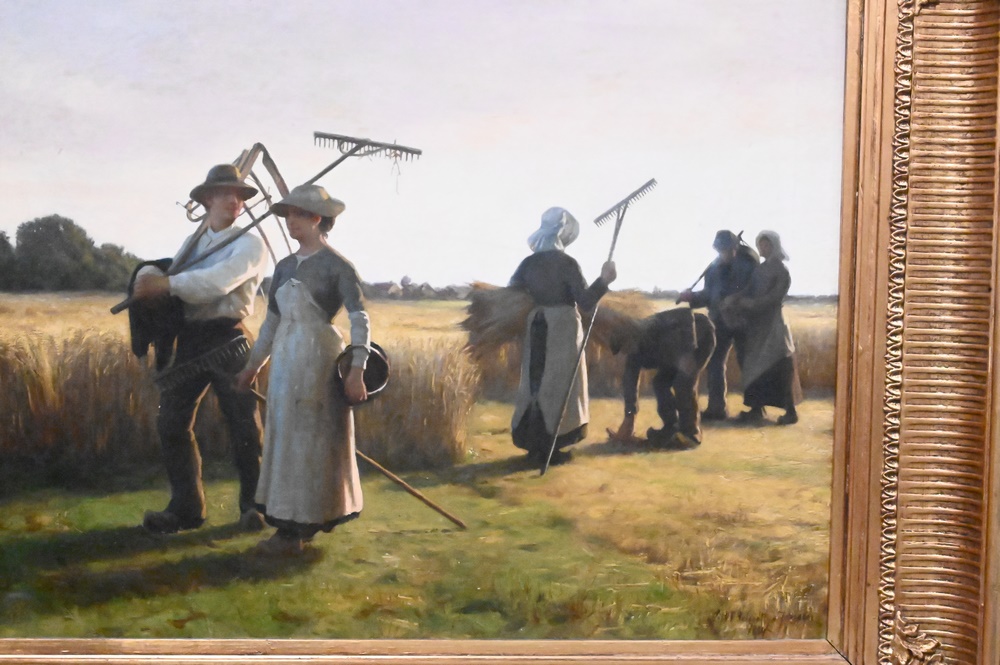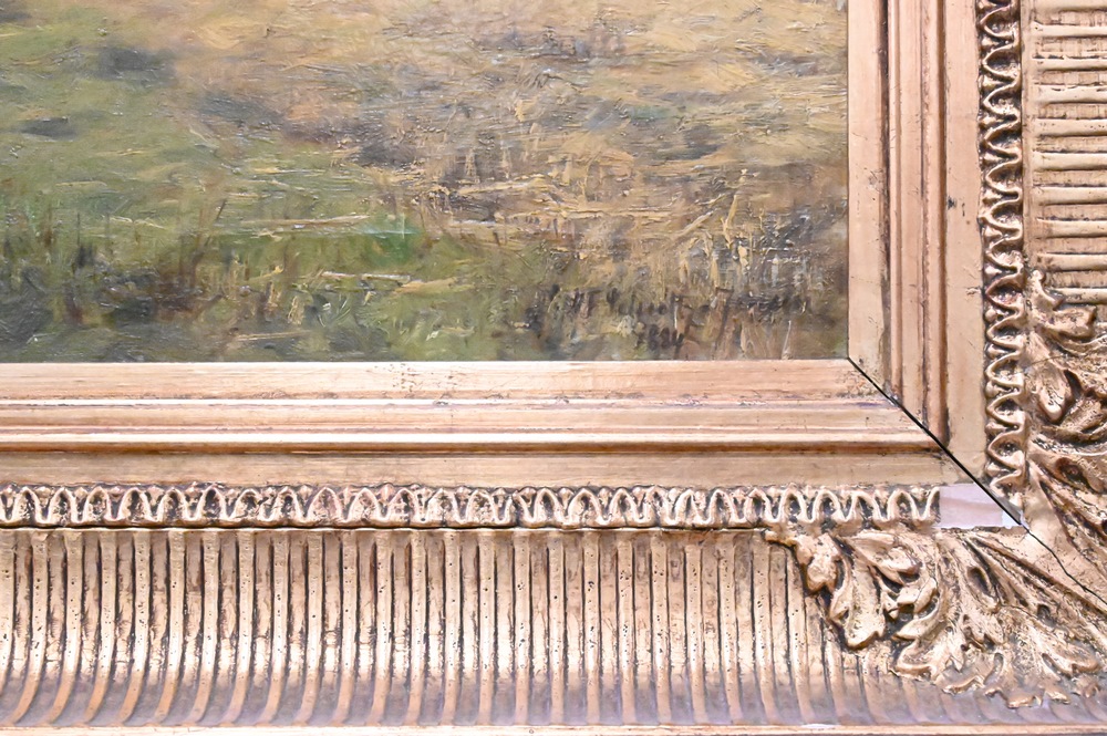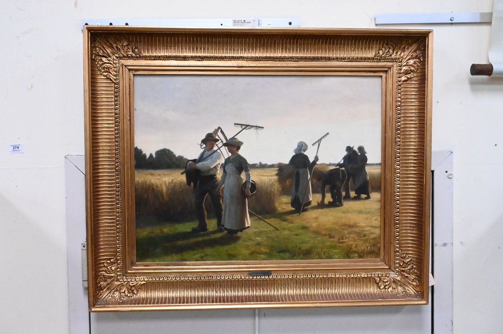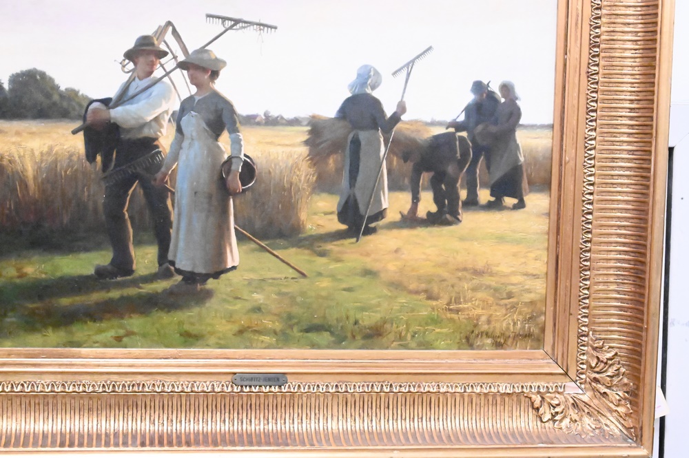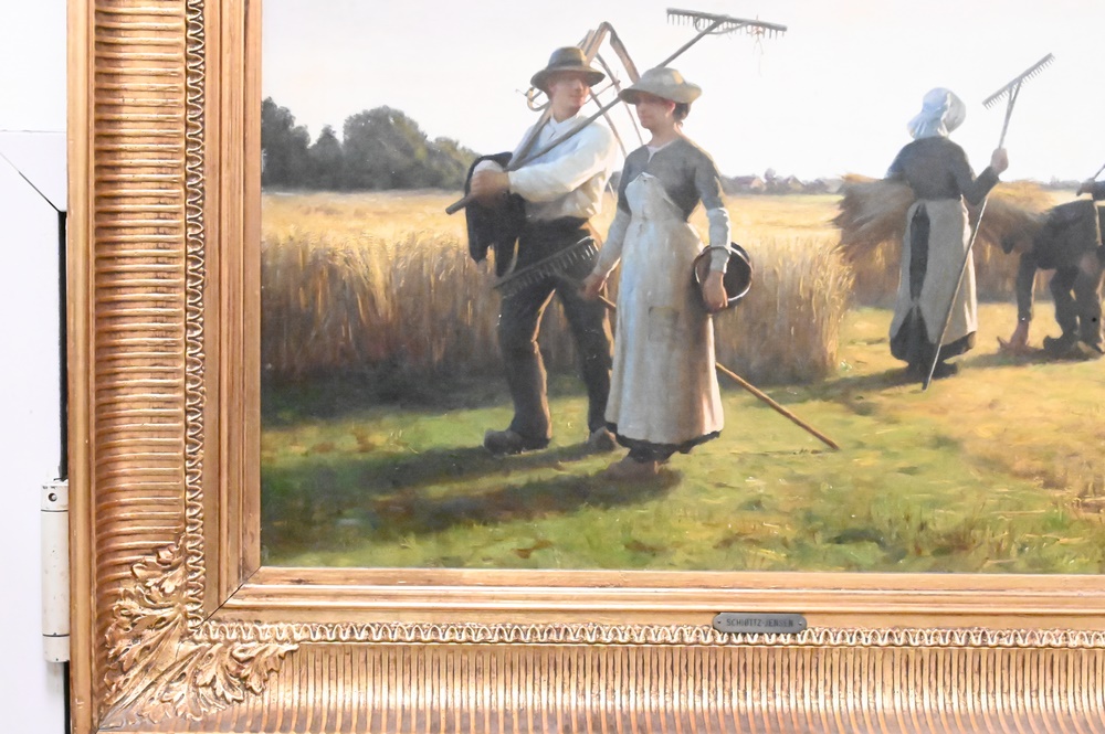 Lot 439: Niels Frederick Schiottz – Jensen (1855 – 1941), End of the Day Haying, hay field, oil on canvas, dated lower right 1884, 20″ x 24″, relined.