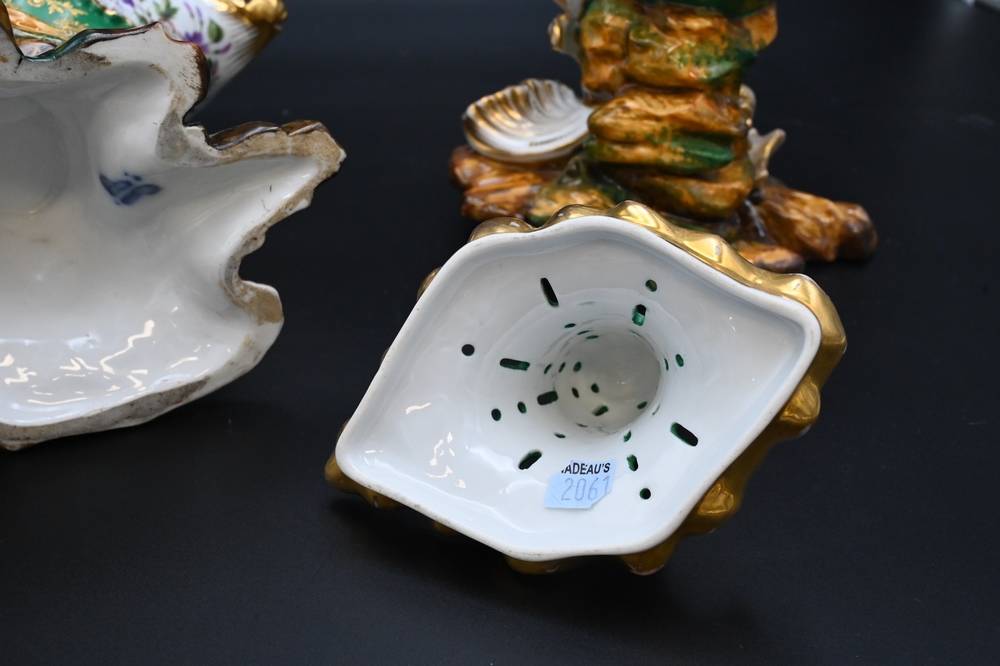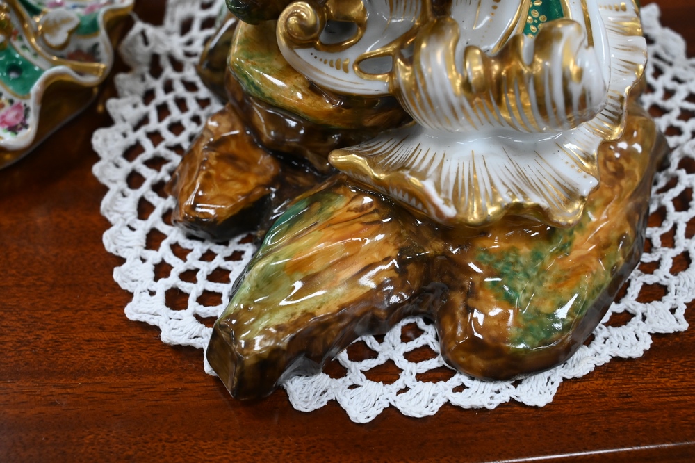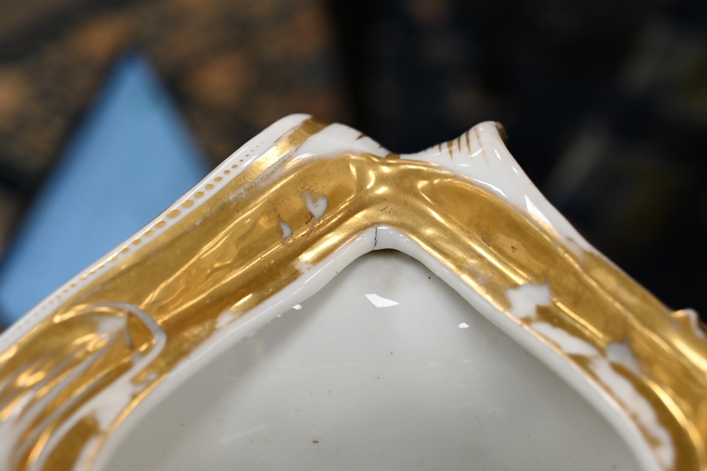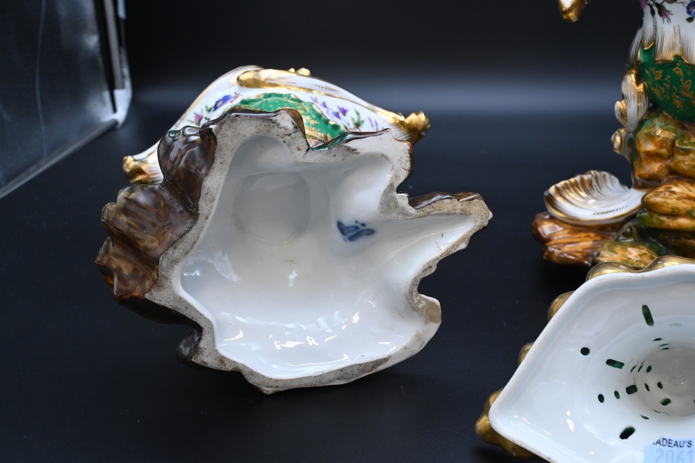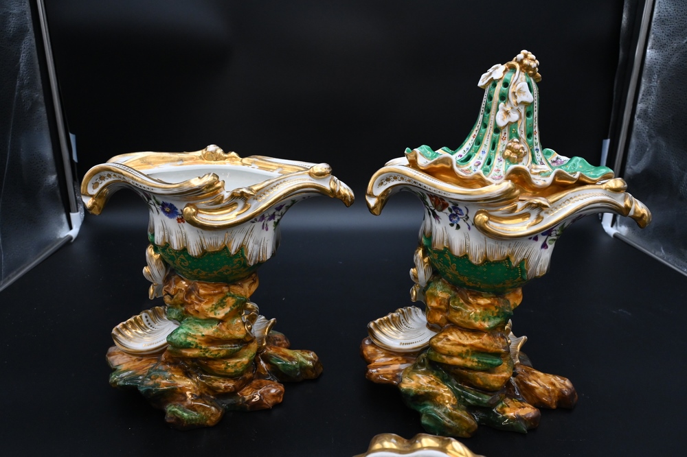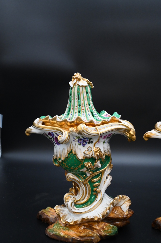 Lot 439: Pair of French Porcelain Potpourri Pots, Vaisseau a mat, having reticulated covers, highly decorated with scroll bases on rock style…