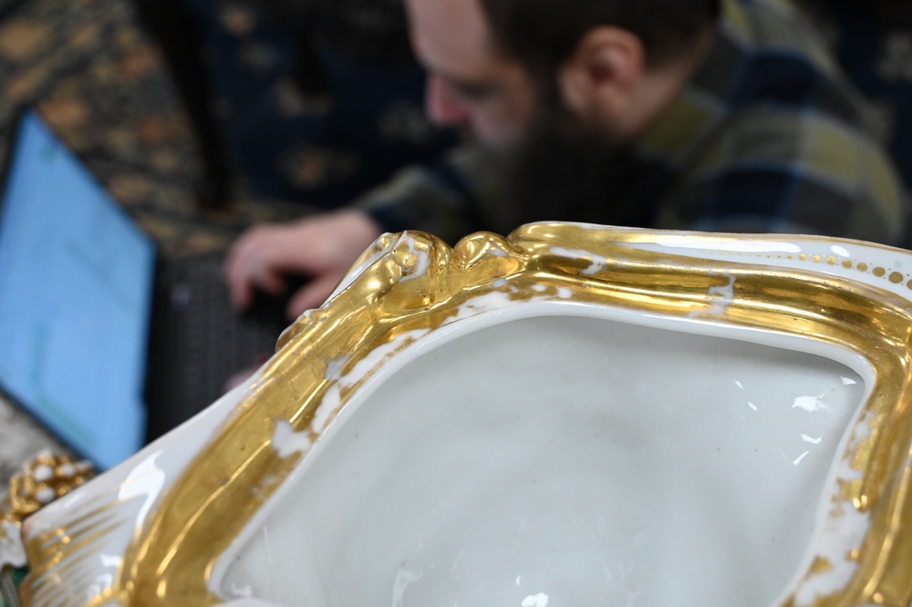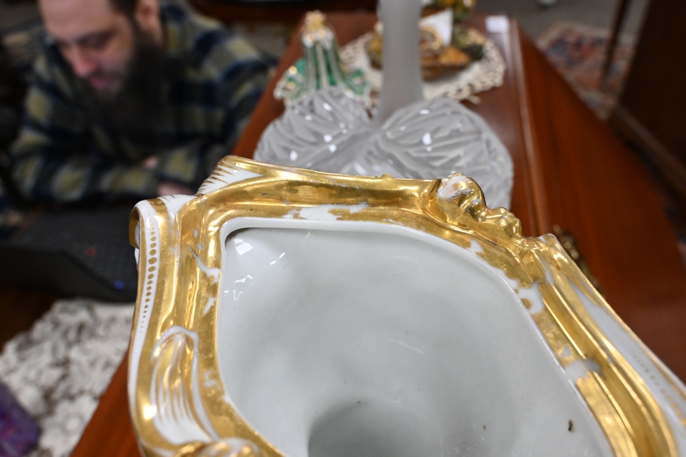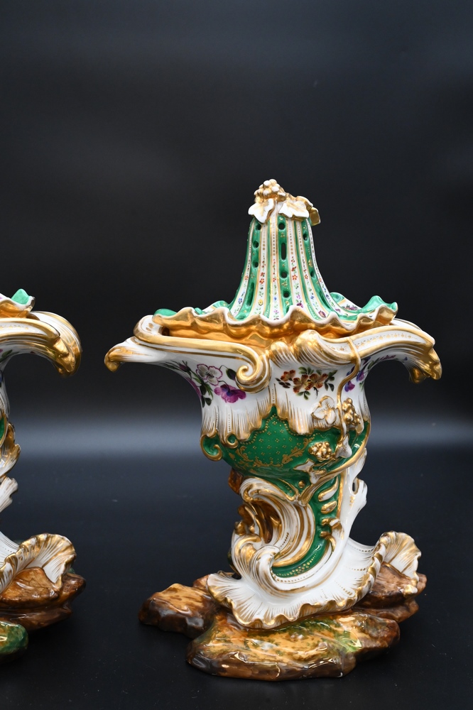 Pair of French Porcelain Potpourri Pots, Vaisseau a mat, having reticulated covers, highly decorated with scroll bases on rock style bottoms, each marked JP on bottom (possibly Jacob Petit 1796 – 1865), height 12 inches.
