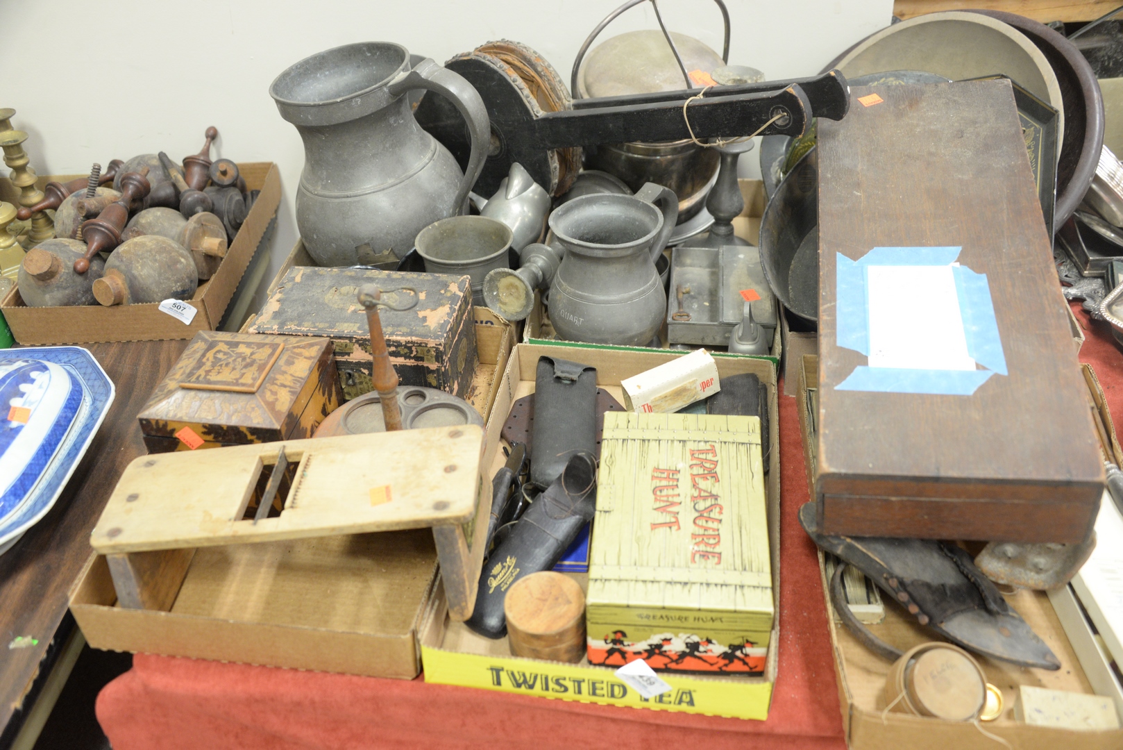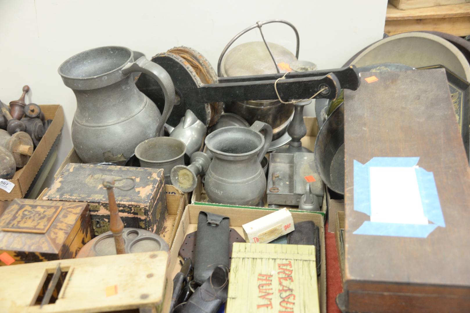 Lot 439: Six Tray Lots of Woodenware, to include two tea boxes inlaid with Indians and hunters, along with brownware, redware, wood shoes, pewter, tole, etc. Provenance: From a Newport, Rhode Island historic home, in the same family since 1761.