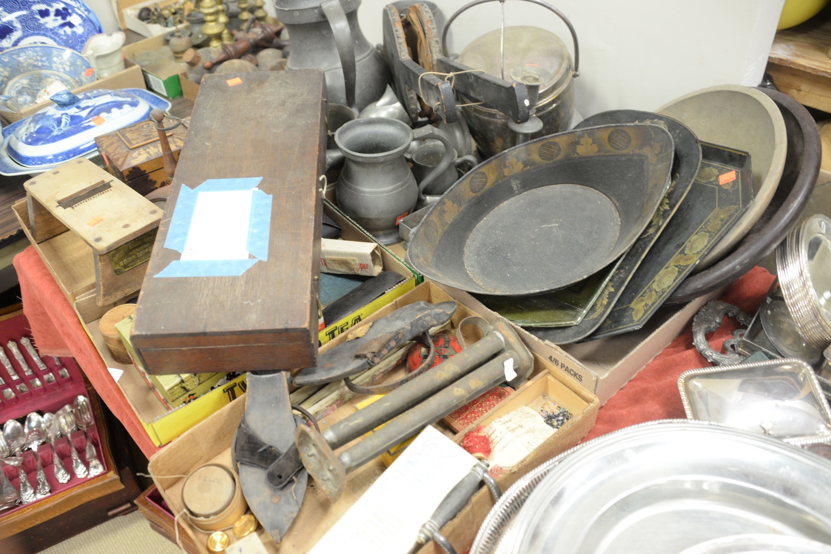 Six Tray Lots of Woodenware, to include two tea boxes inlaid with Indians and hunters, along with brownware, redware, wood shoes, pewter, tole, etc. Provenance: From a Newport, Rhode Island historic home, in the same family since 1761.
