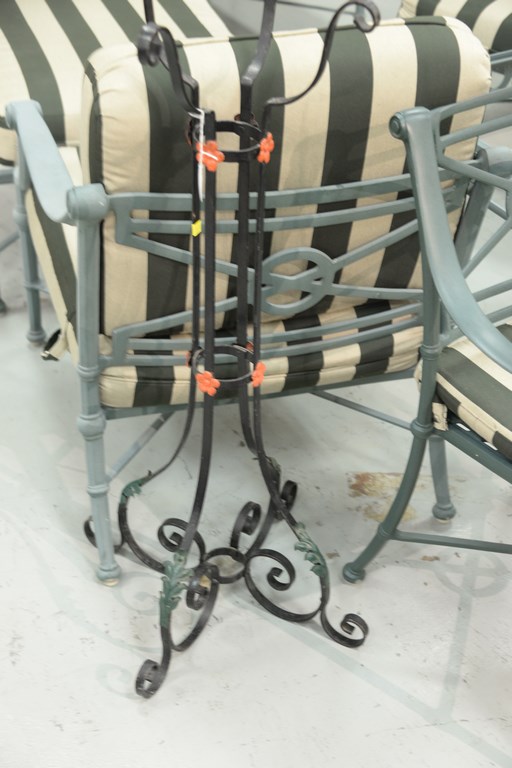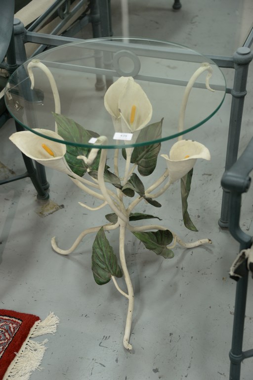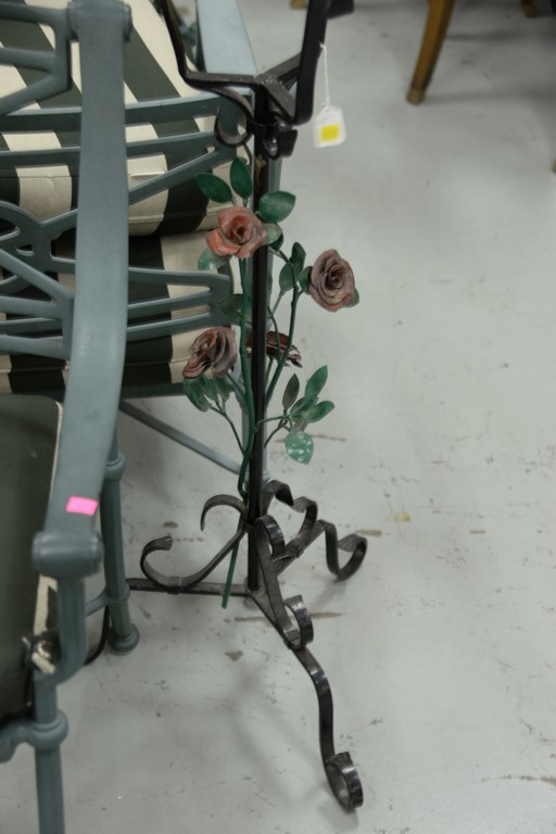 Lot 439: Three piece group including two iron plant stands and a tulip flower table with round top. ht. 24 in. dia. 20 in.
