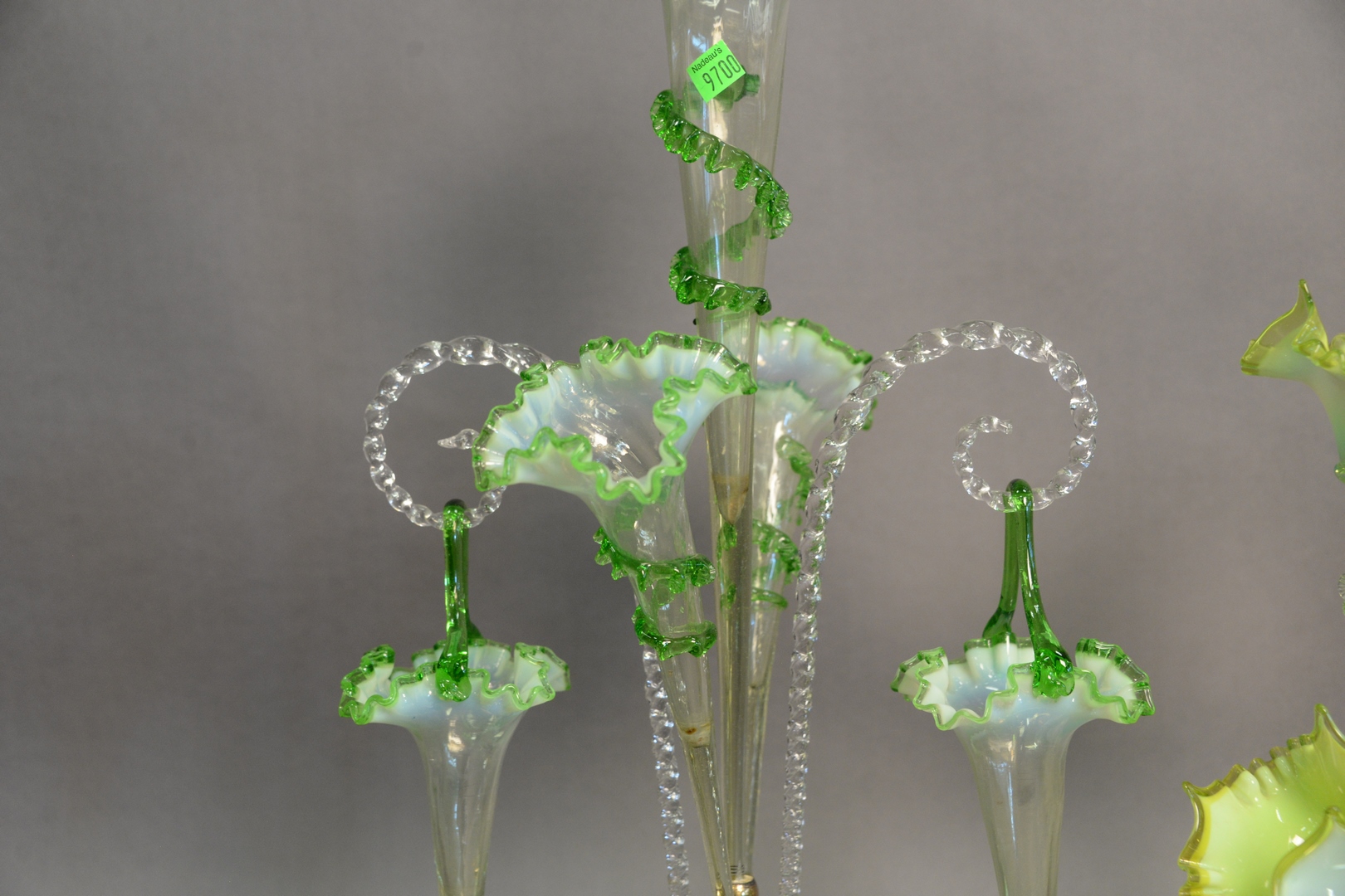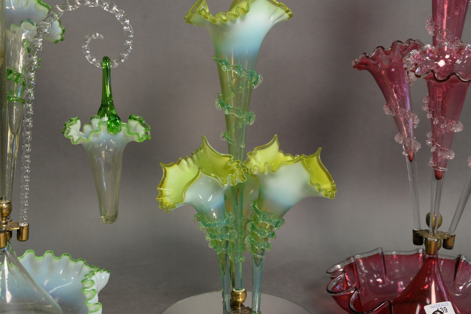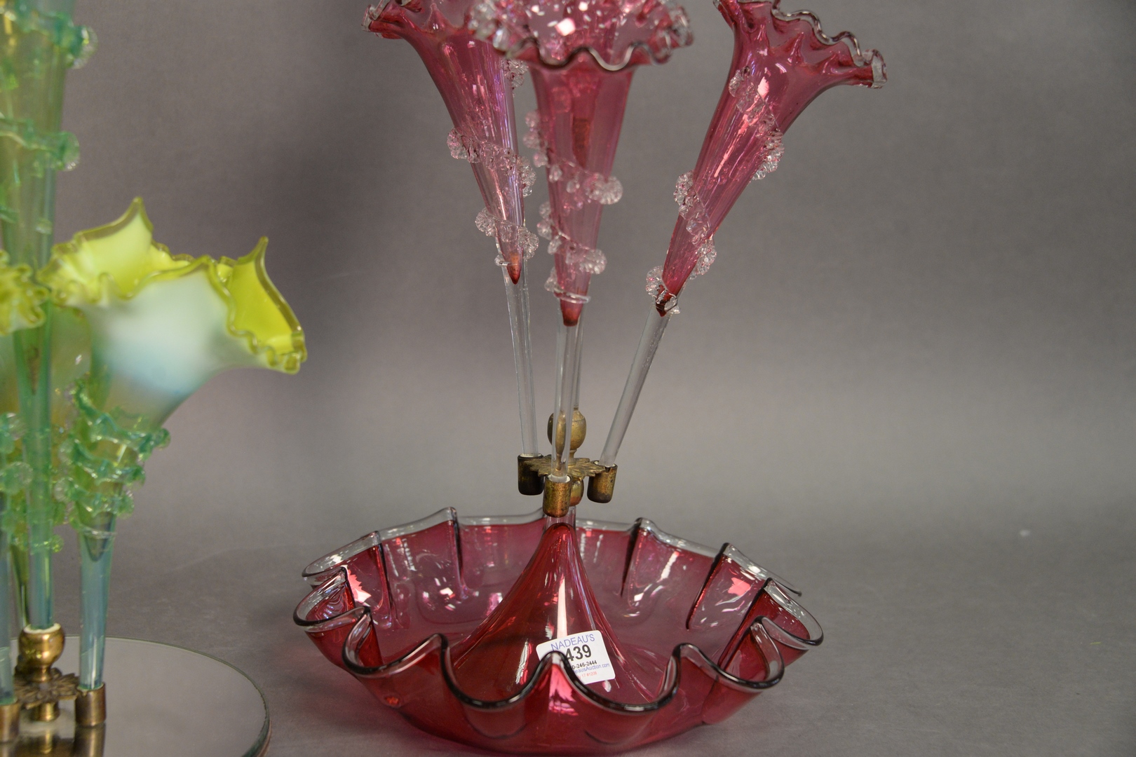 Lot 439: Three Victorian Epergnes, to include one cranberry, tallest height 23 inches. Provenance: Estate of James Wadhams
