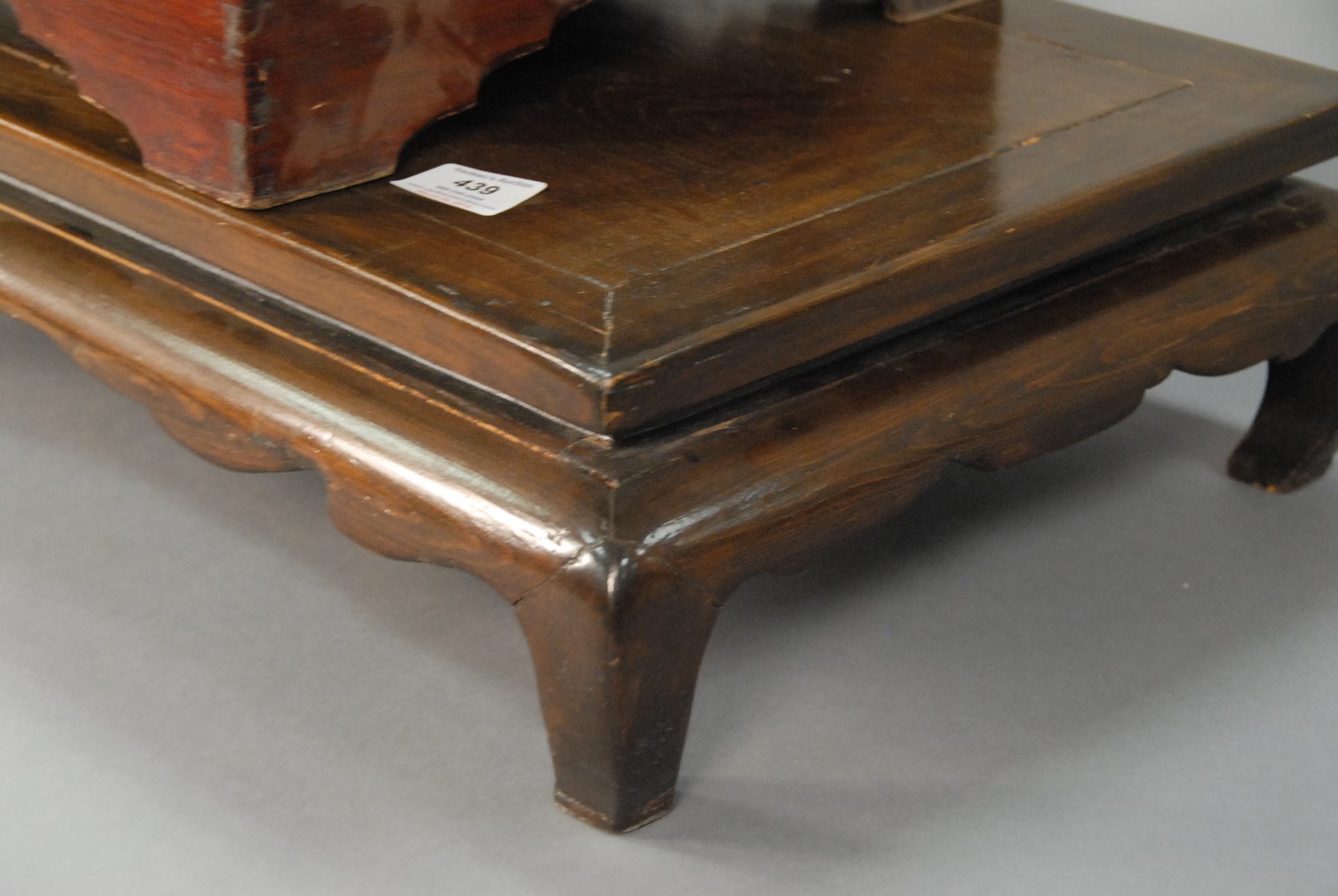 Lot 439: Two piece lot to include footed wooden tea tray/table, Korea, 19th century. ht. 5in. lg. 22in. wd. 14in. and a soft wood tray table.