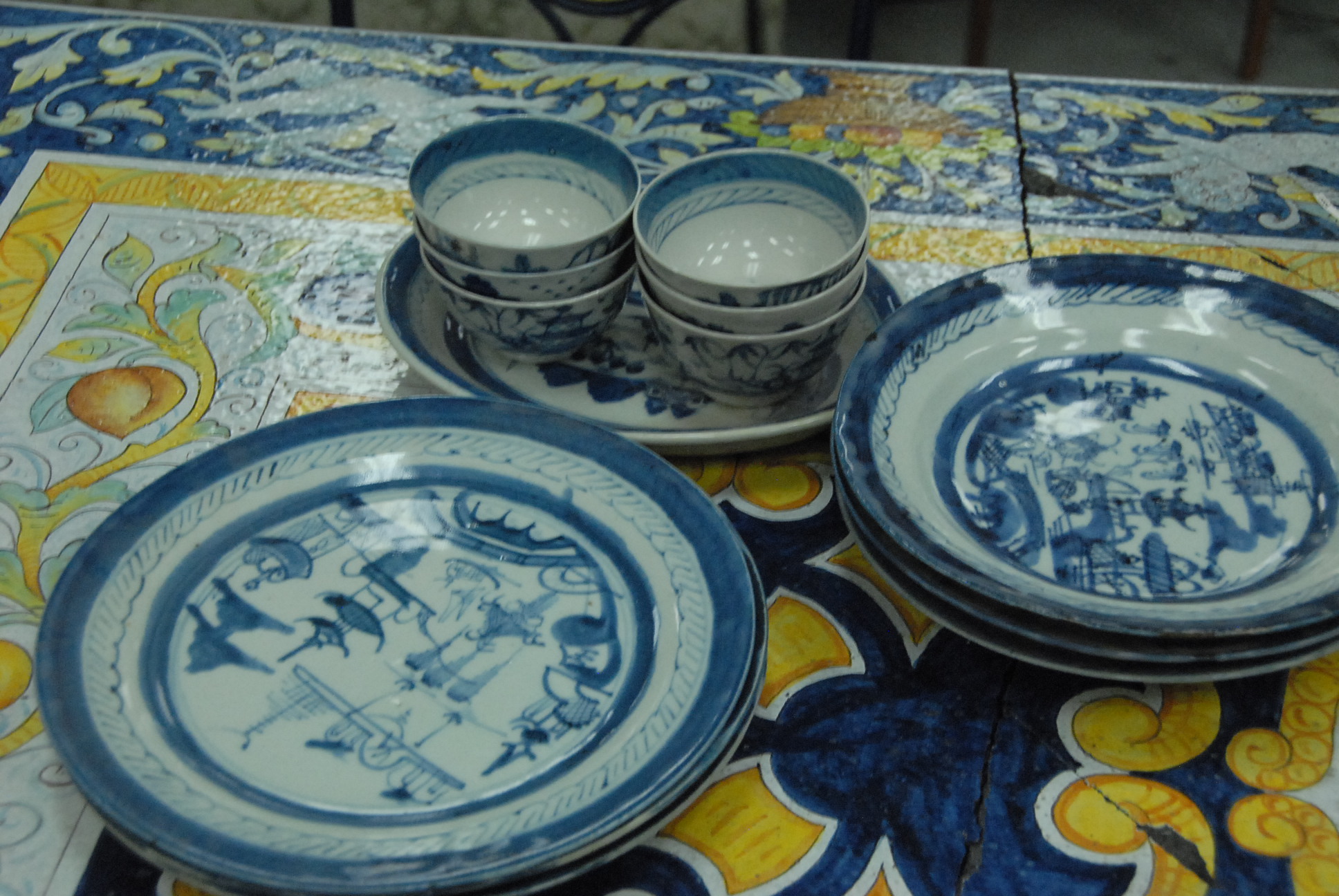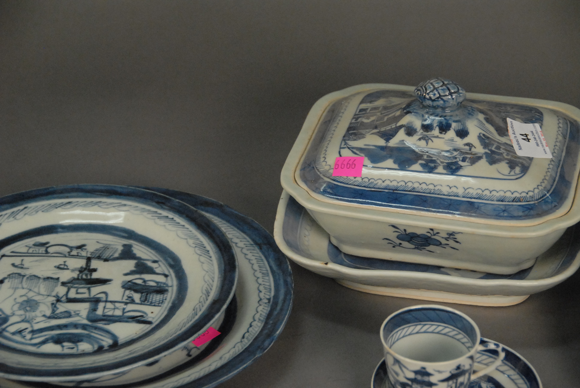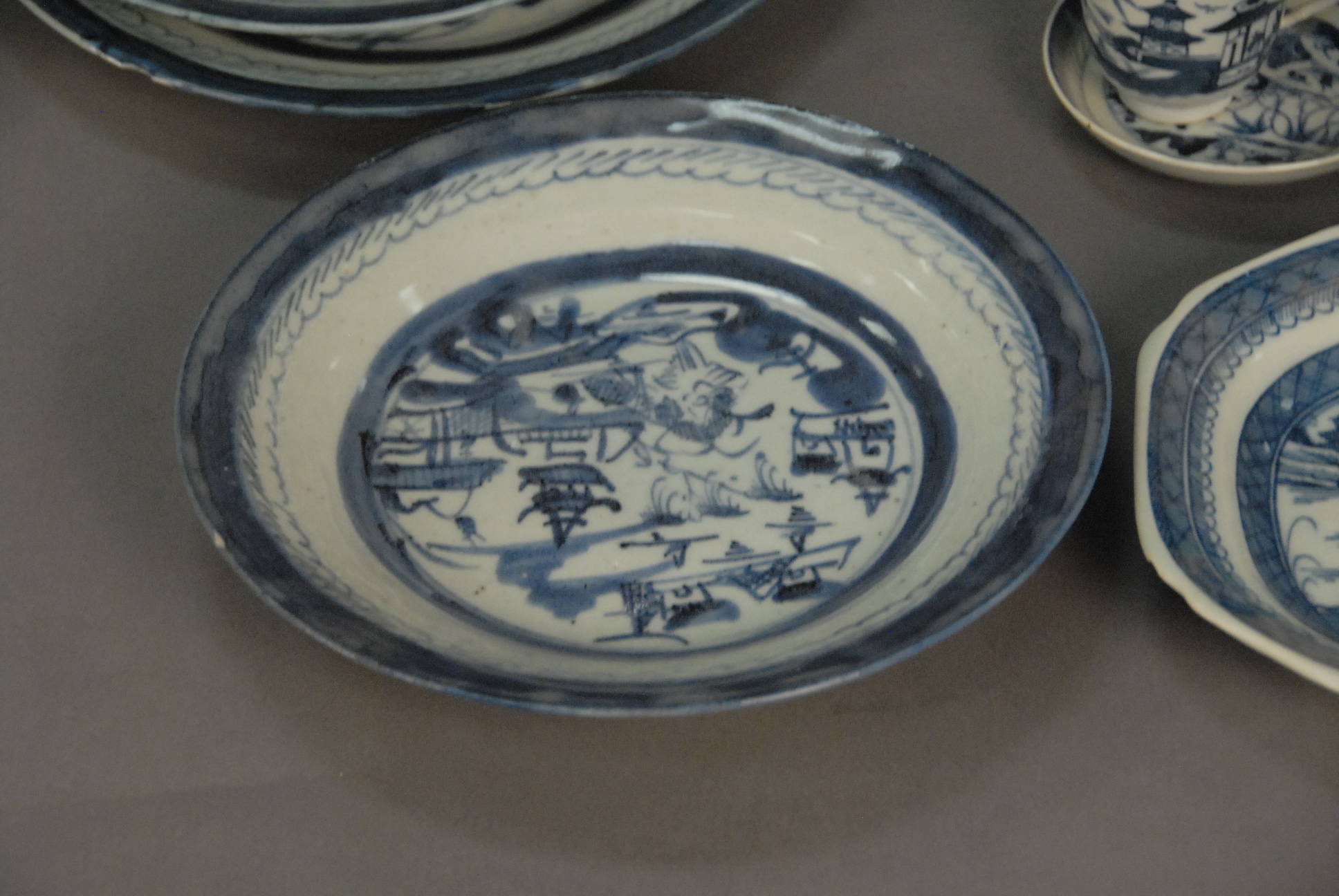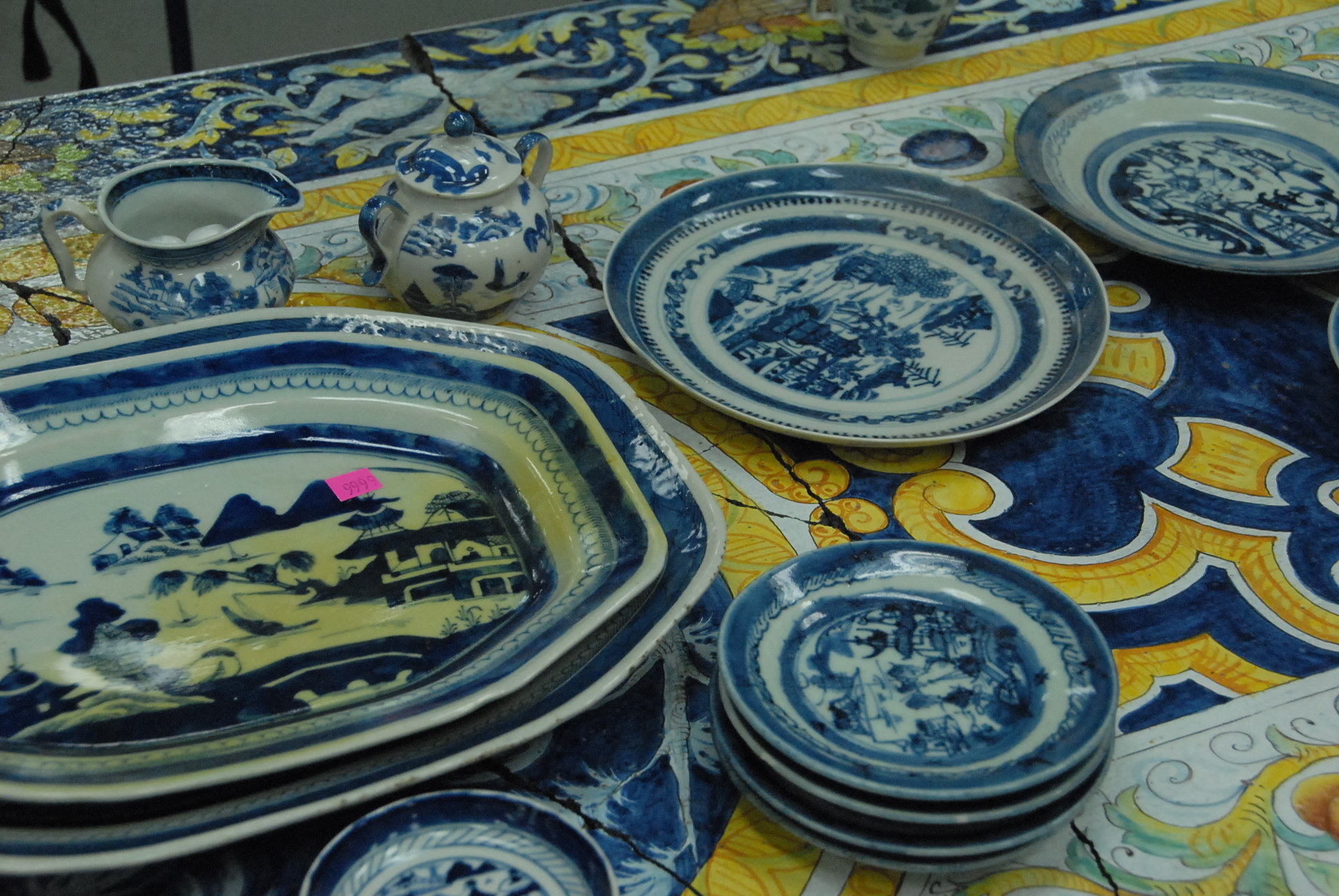 Canton lot with platters, vegetable dishes, various plates, cups, and bowls, 63 total pieces.