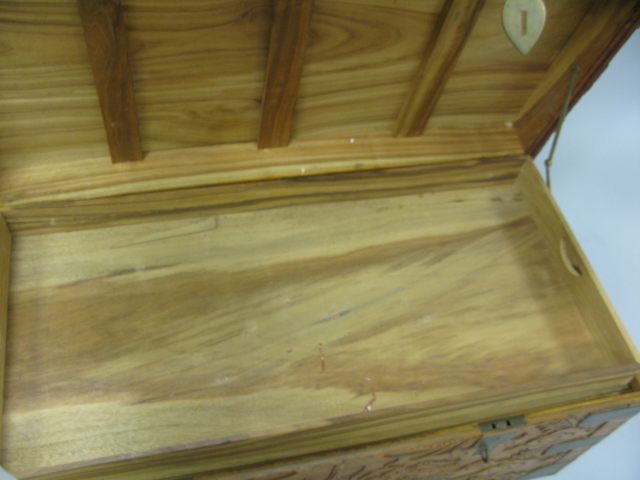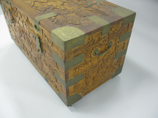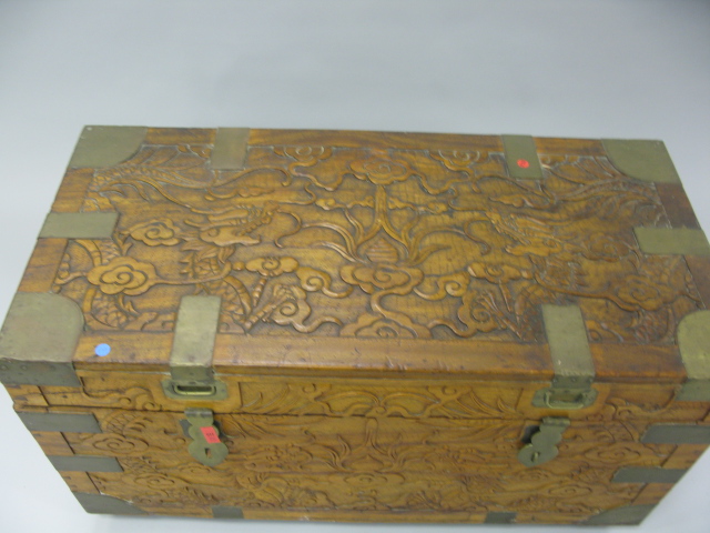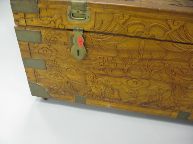 Carved camphorwood lift top chest with brass mounts from the estate of Broadway actress Leta Gold
