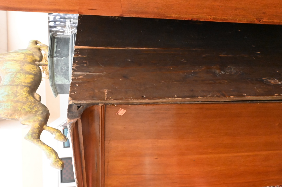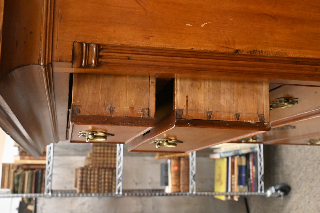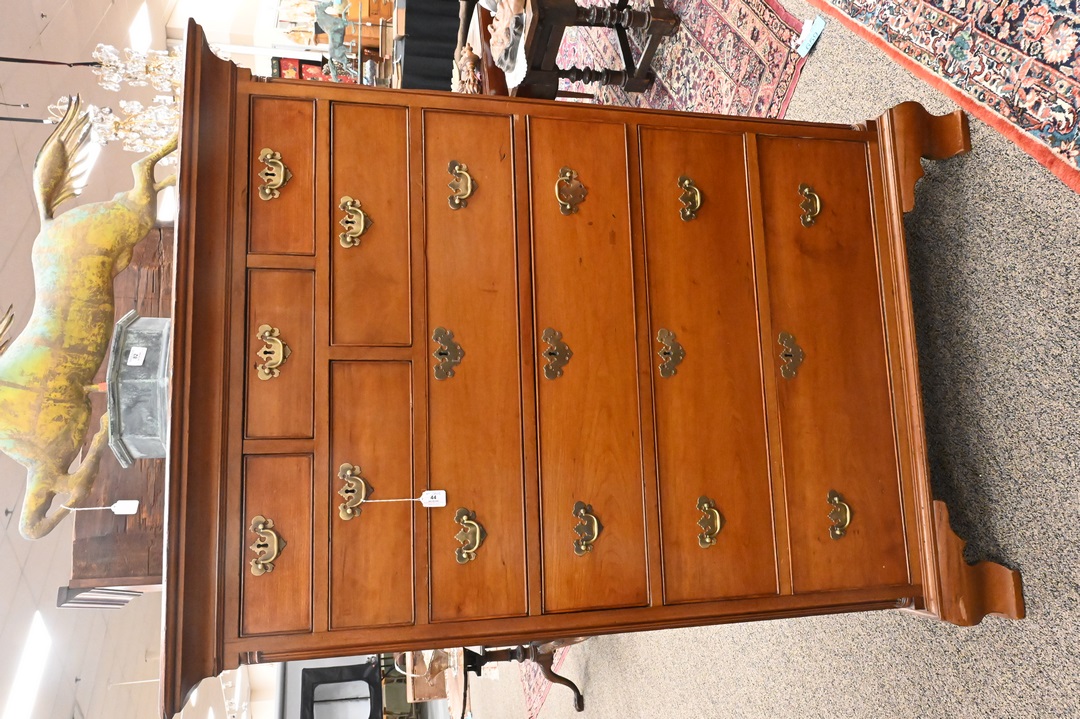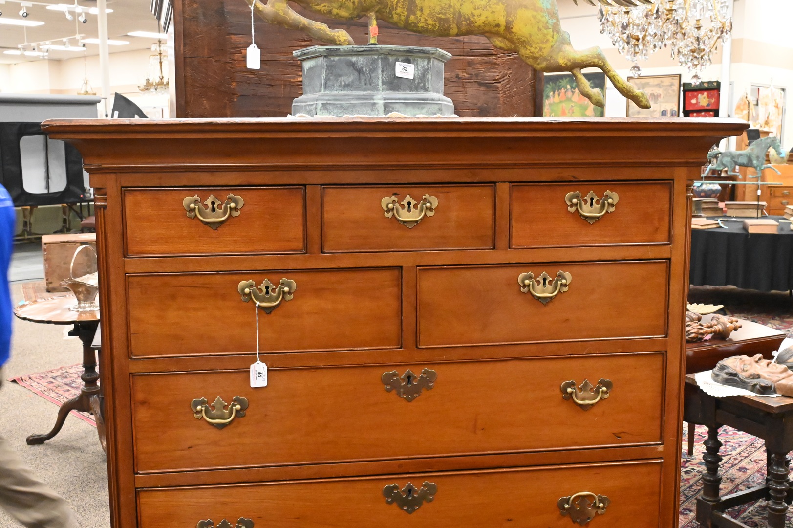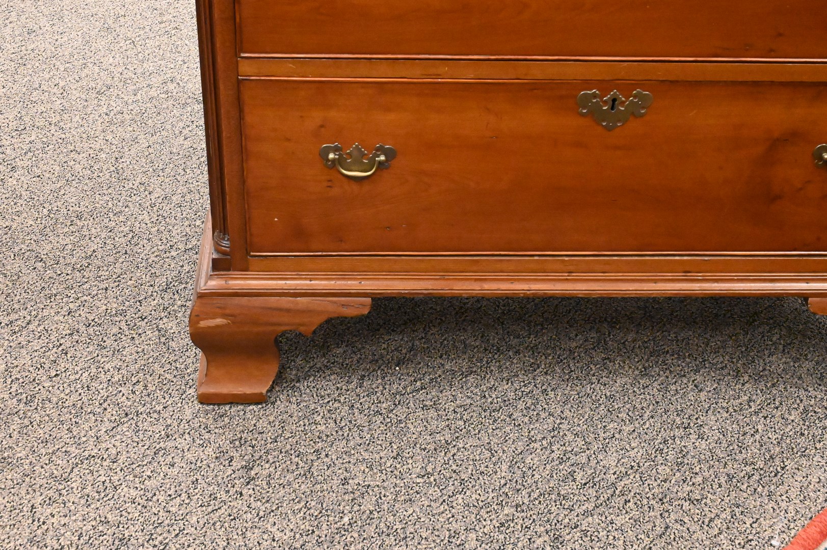Chippendale Cherry Tall Chest, having large cornice molded top over three short drawers, over two drawers, over four drawers, all flanked by fluted quarter columns, set on ogee feet, circa 1760, height 63 1/2 inches, width 40 1/2 inches, top 22″ x 45″.