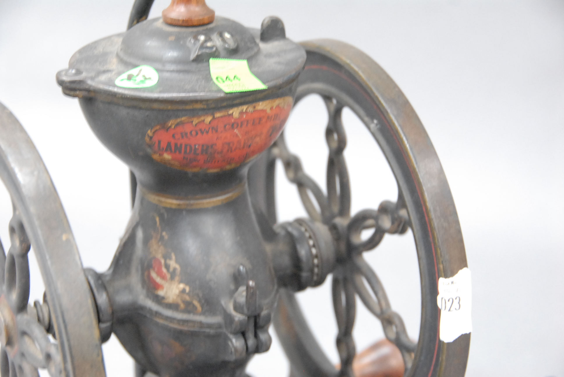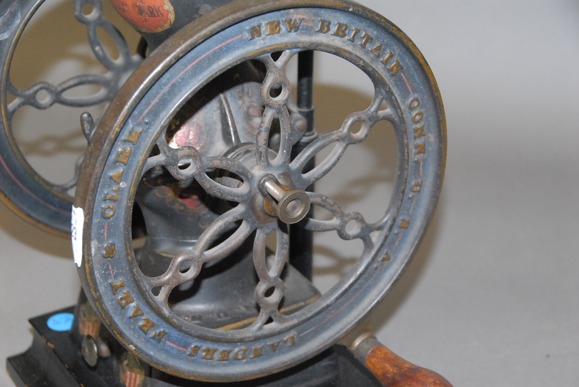 Early iron coffee grinder made into a lamp, not drilled, Lander, Frary & Clark ,New Britain, Ct in original paint.