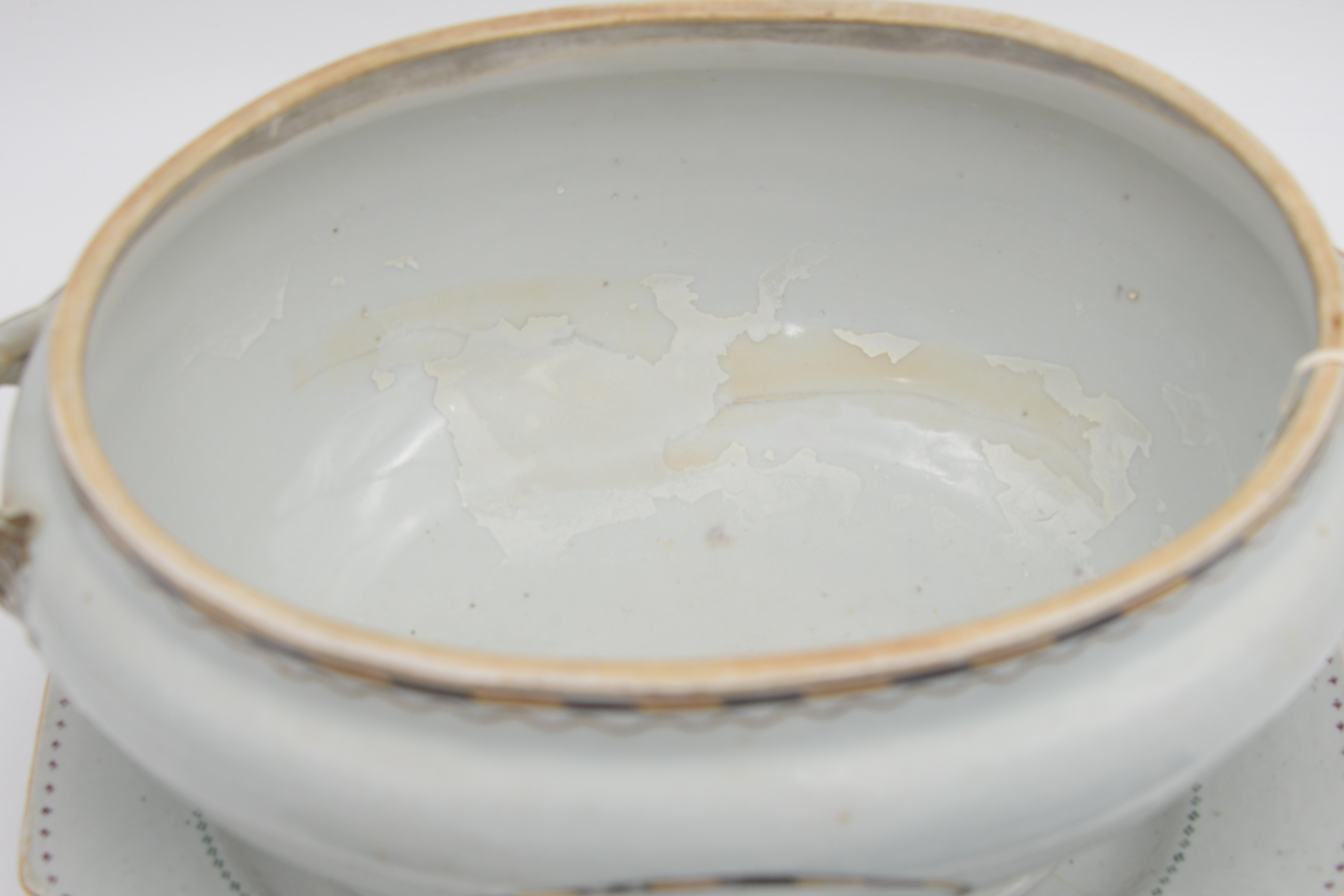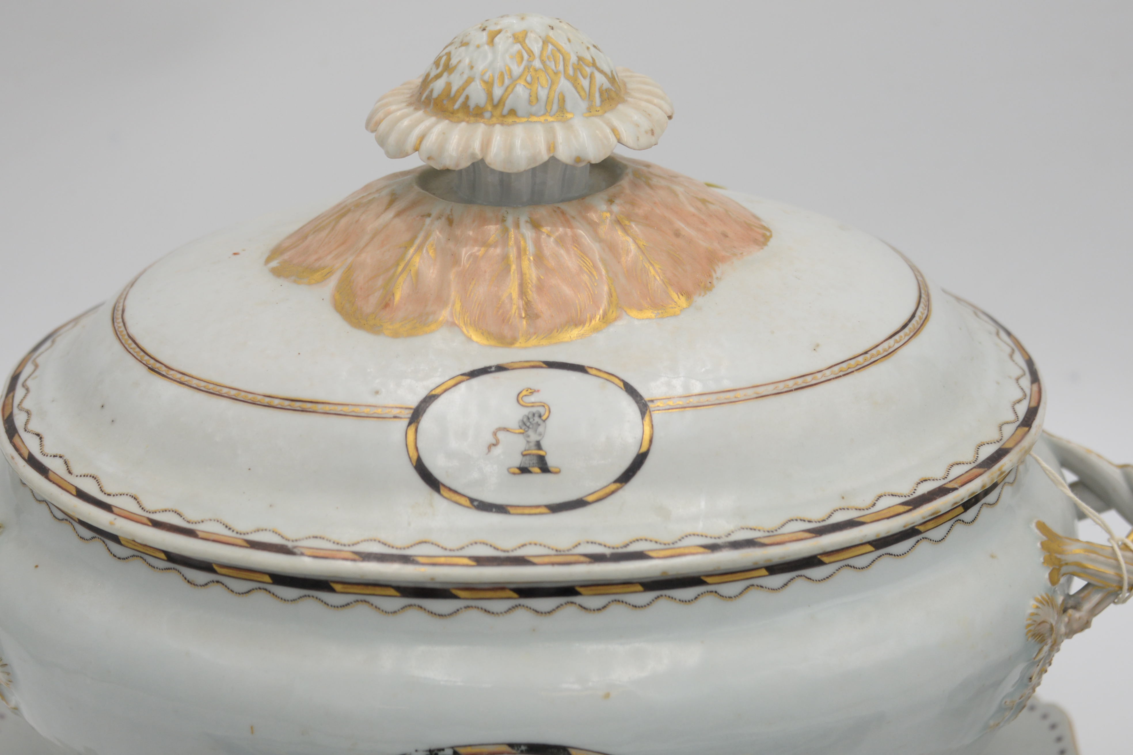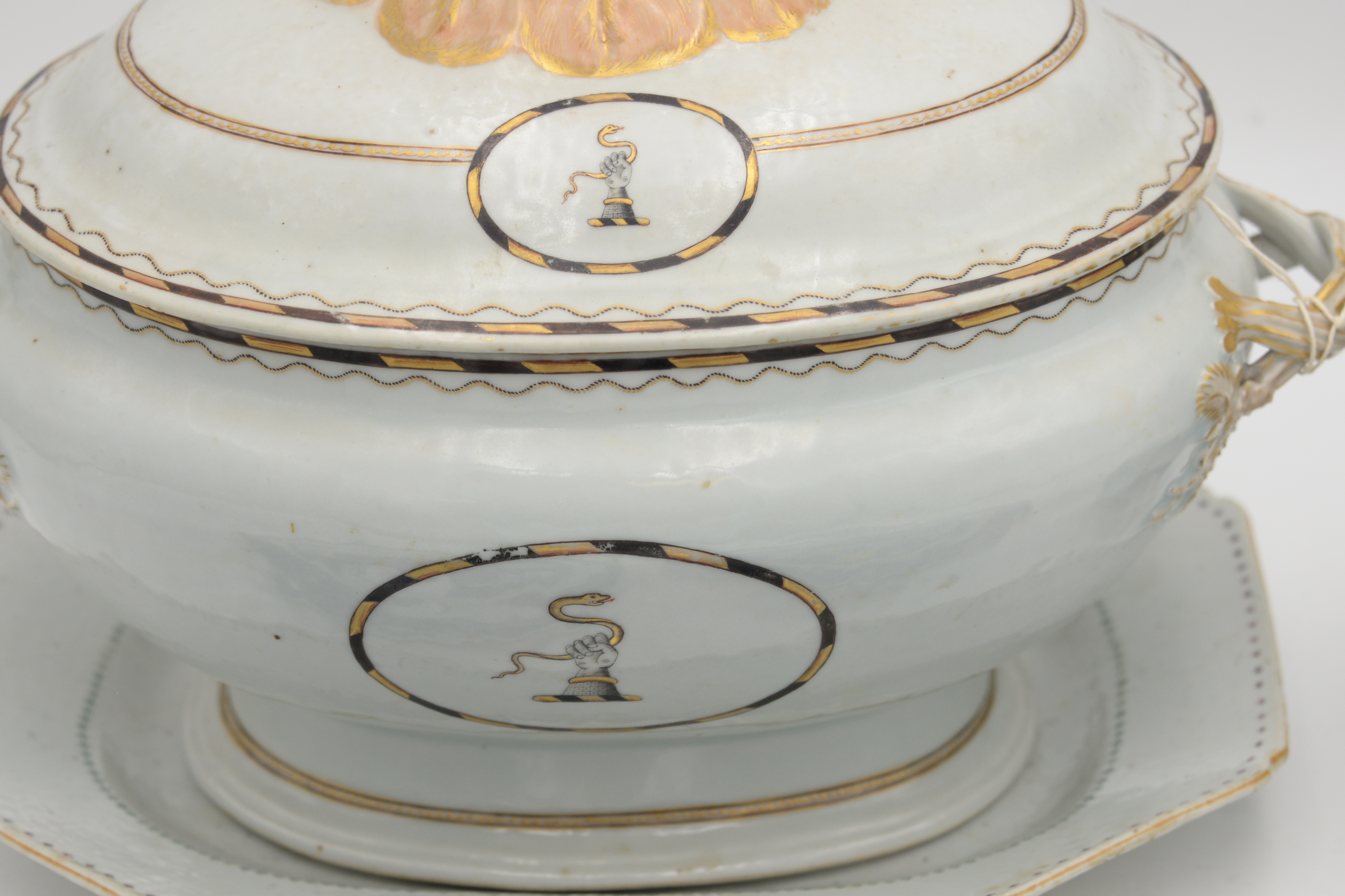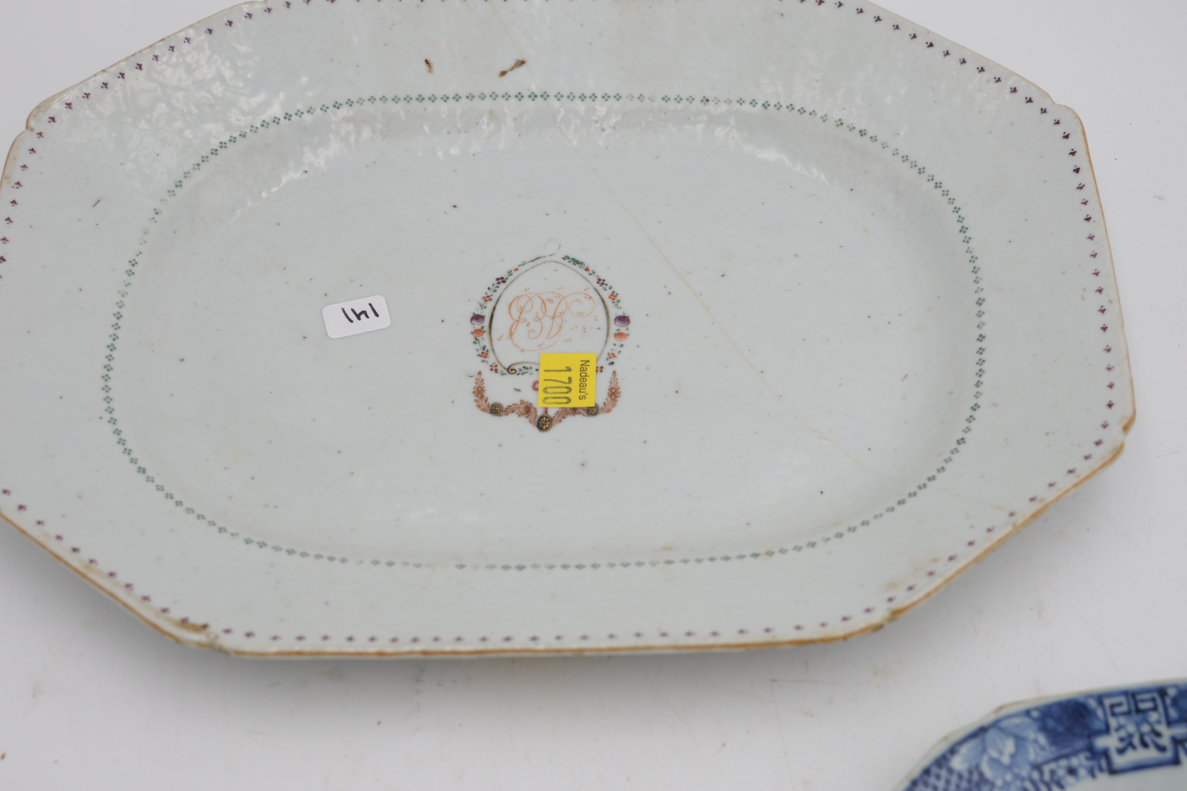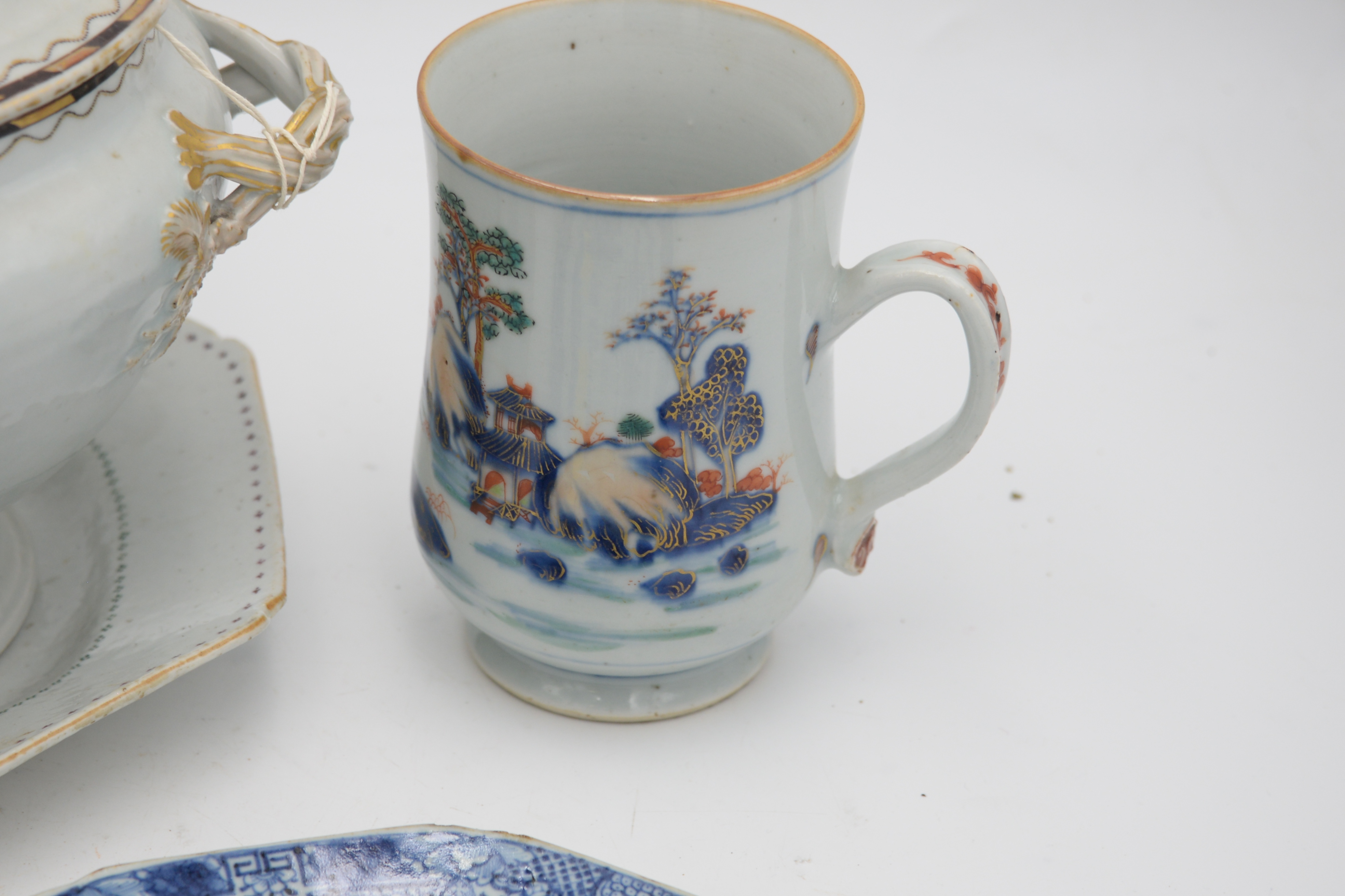 Five Piece Chinese 18/19 Century Export Group to Include, crested tureen and cover the crest of hand grasping snake, height 11 inches, length 14 inches, rectangular platter with monogram, length 12 1/2 inches, two black and white octagonal plates, diameter 9 inches, export mug circa 1720, Christies sold $750 October 3, 2012