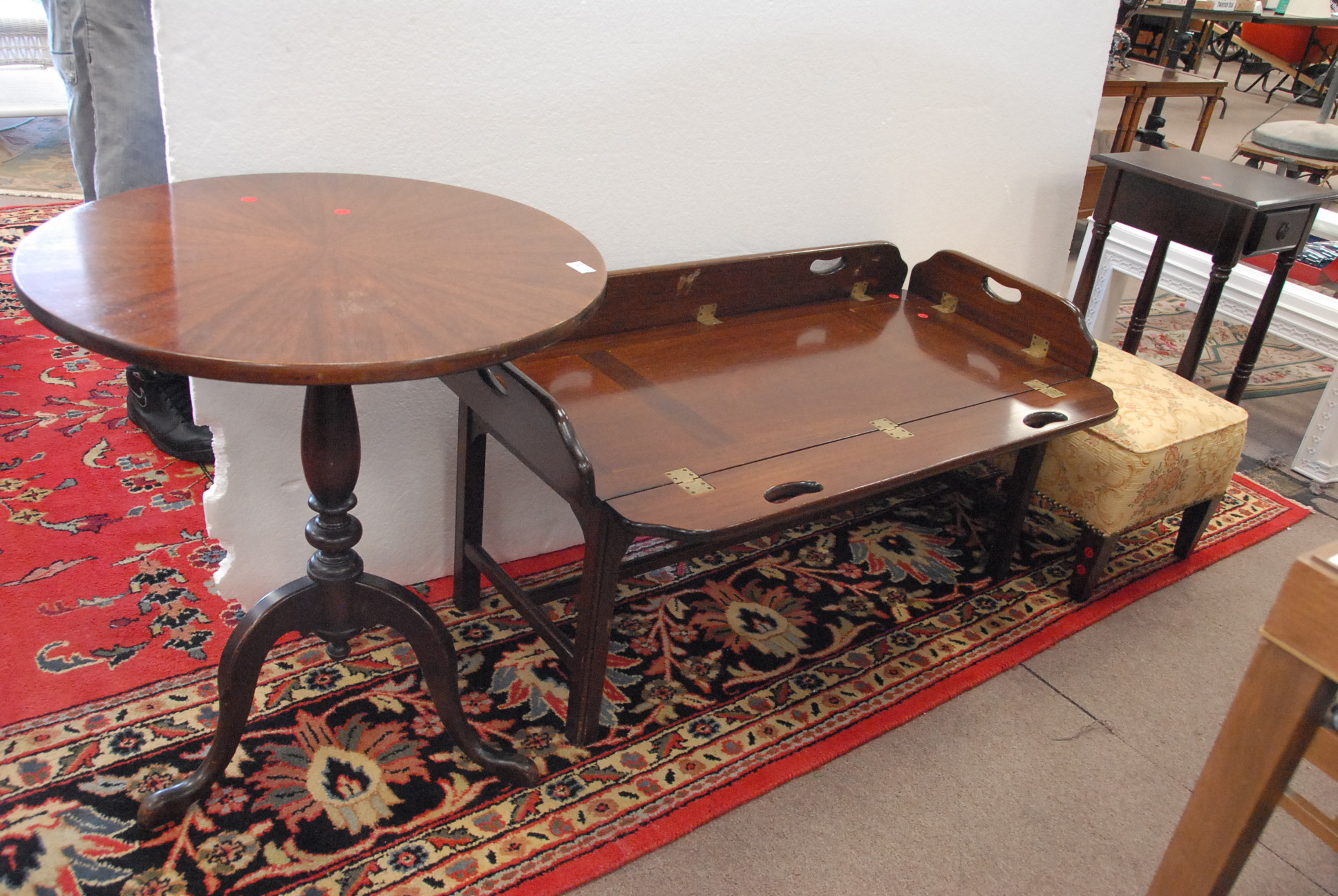 Four piece lot to include a tray top coffee table, round table, one drawer stand, and an upholstered foot stool.