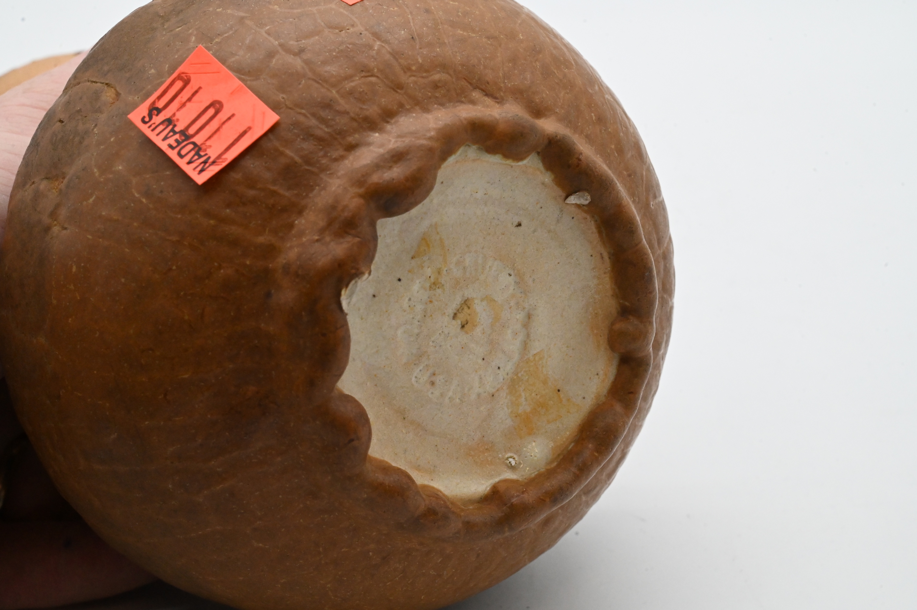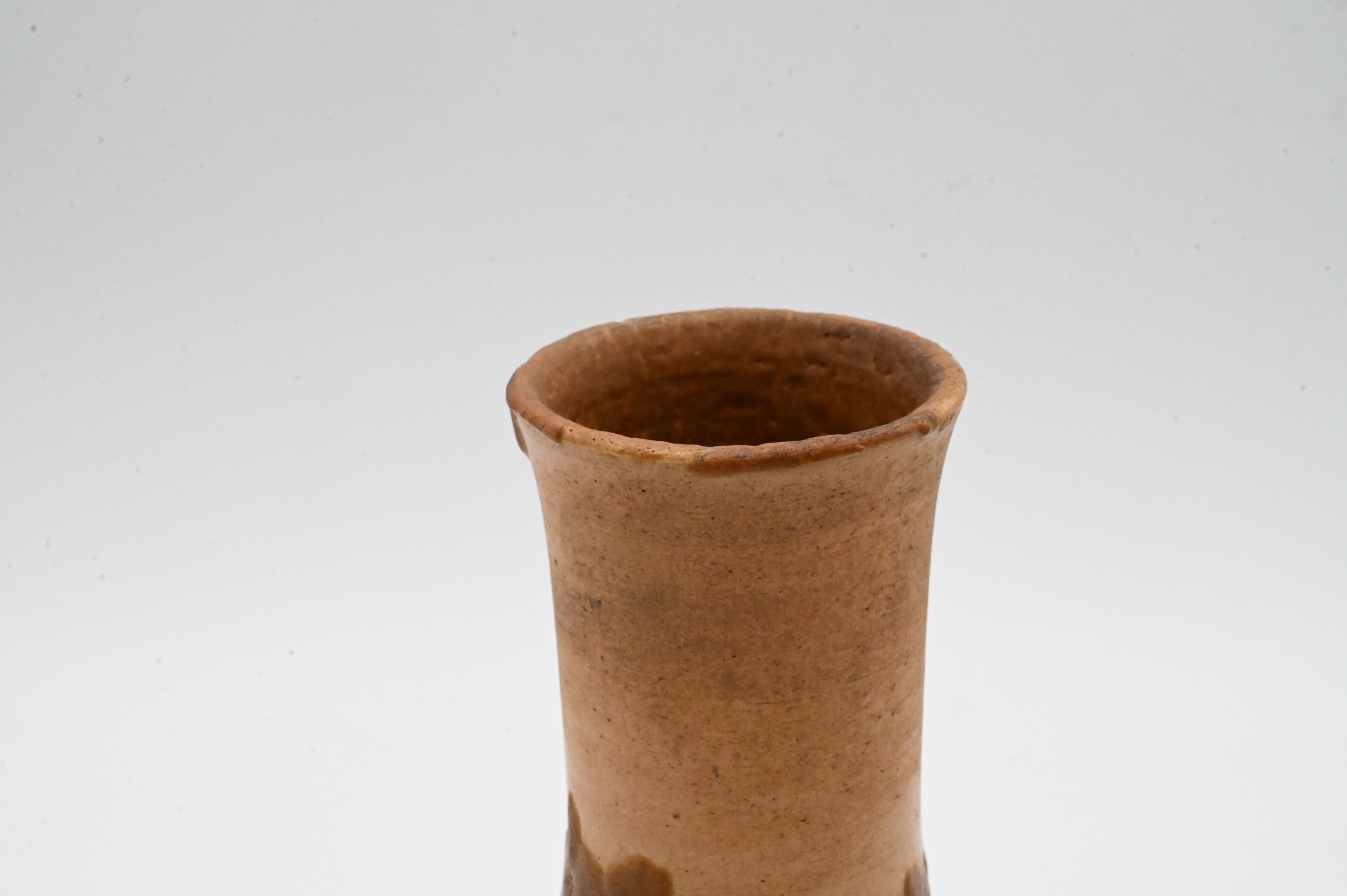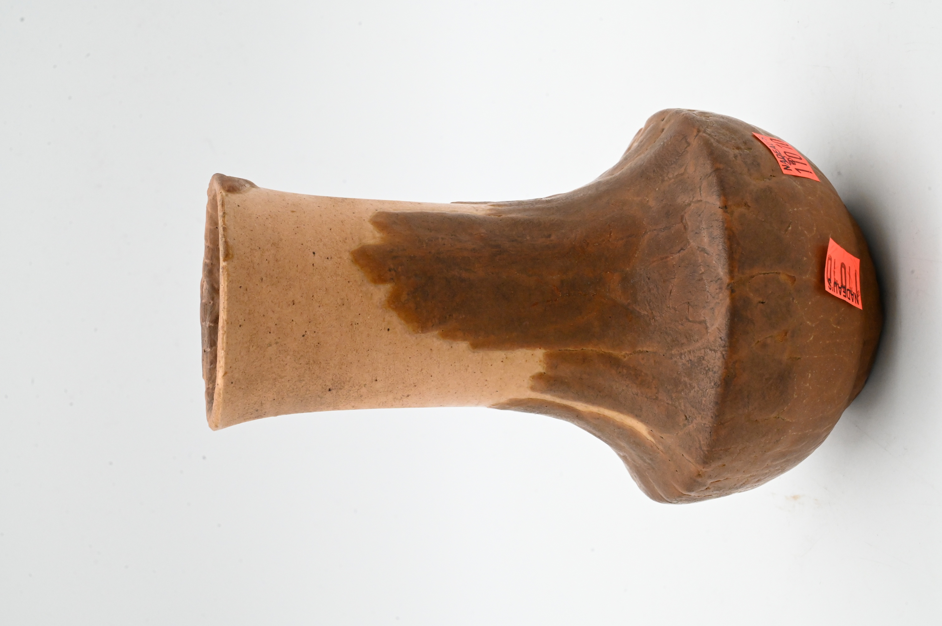 of tapering form in two tones, with leather glaze finish traveling down to squat body and organic rim foot, marked on bottom