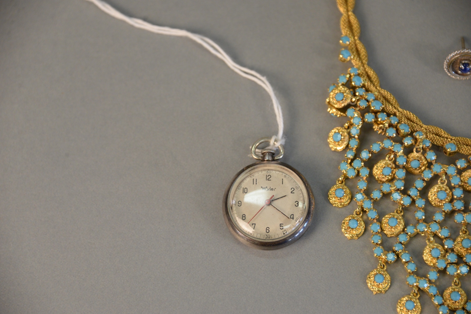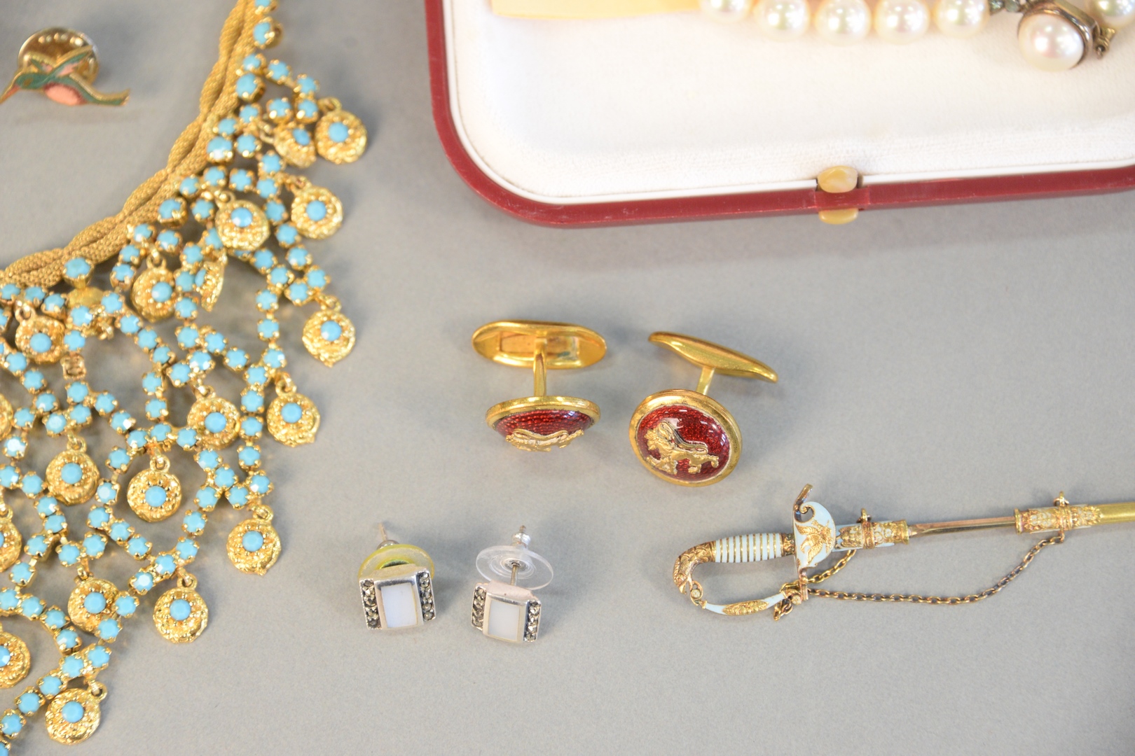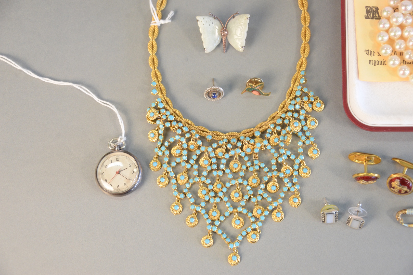 to include Majorica pearl necklace, bib necklace, cufflinks, sword pin watch, one sterling and hardstone butterfly pin