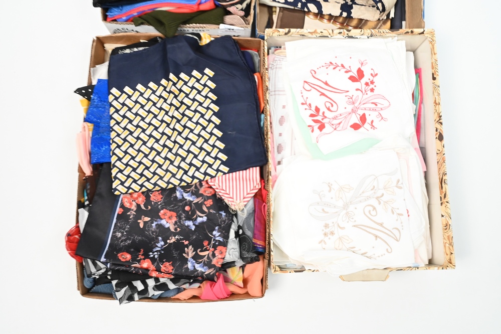 Large Lot of Scarves, to include mostly silk from various designers, small and large squares, plain and printed, along with designer monogrammed hankies and colorful bandanas, monogrammed “N” on hankies, some spots, condition consistent with normal wear.
