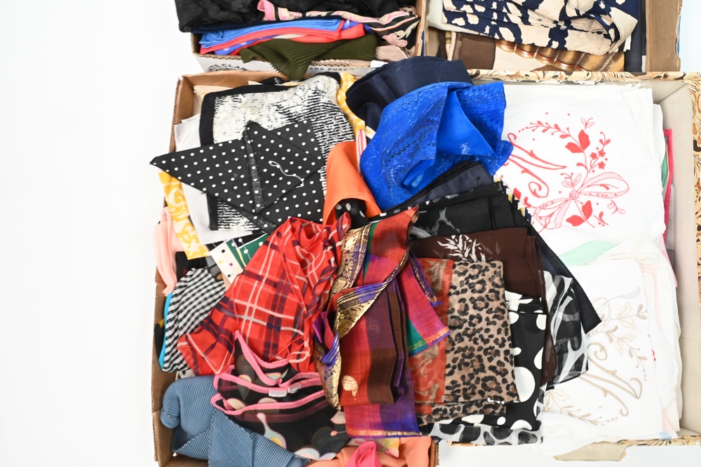 Lot 44: Large Lot of Scarves, to include mostly silk from various designers, small and large squares, plain and printed, along with designer…