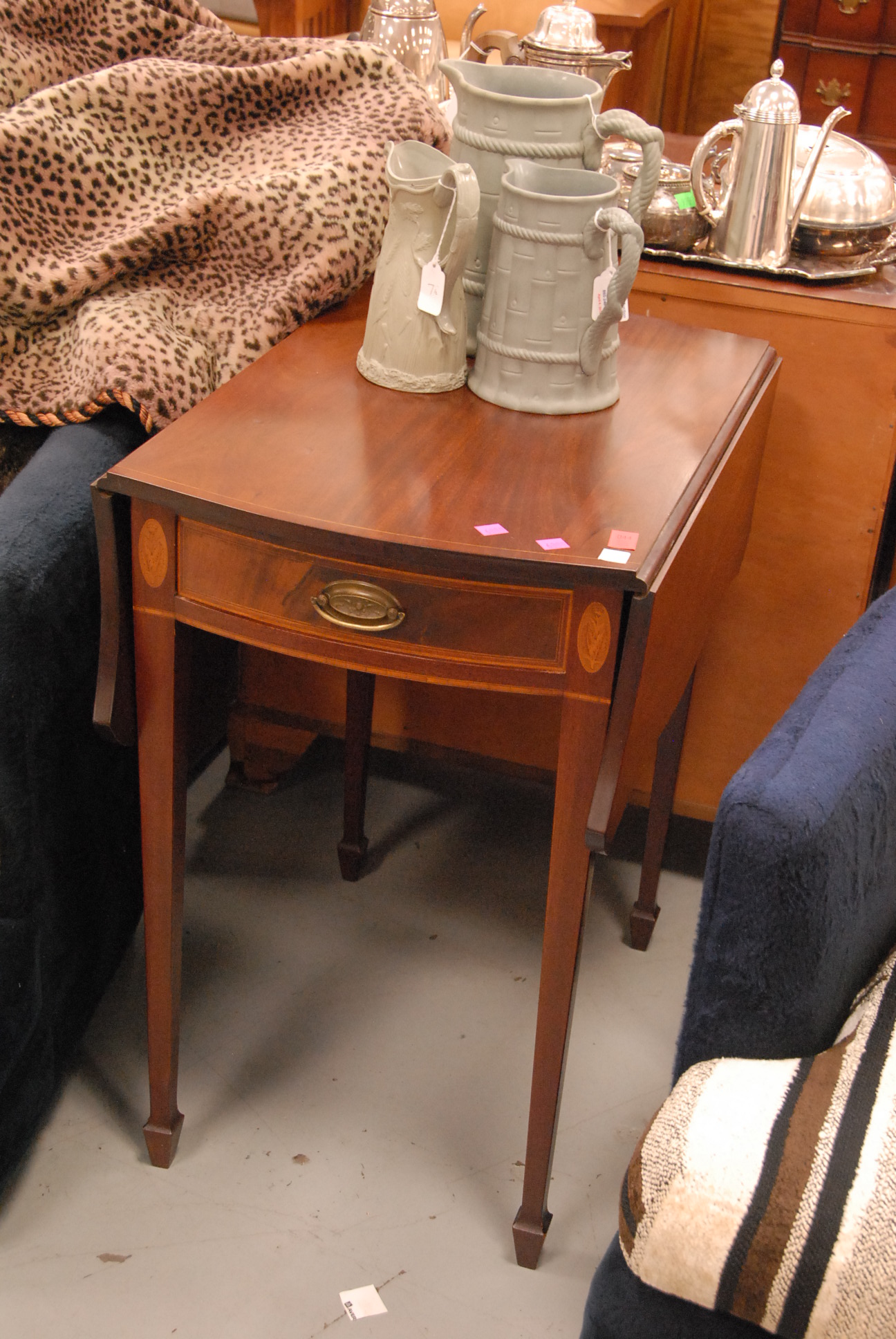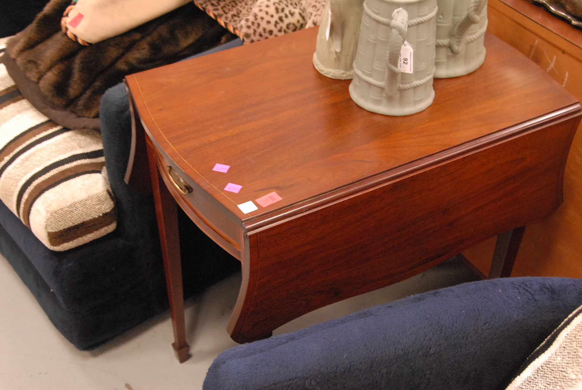 Margolis mahogany inlaid Pembroke style drop leaf table.