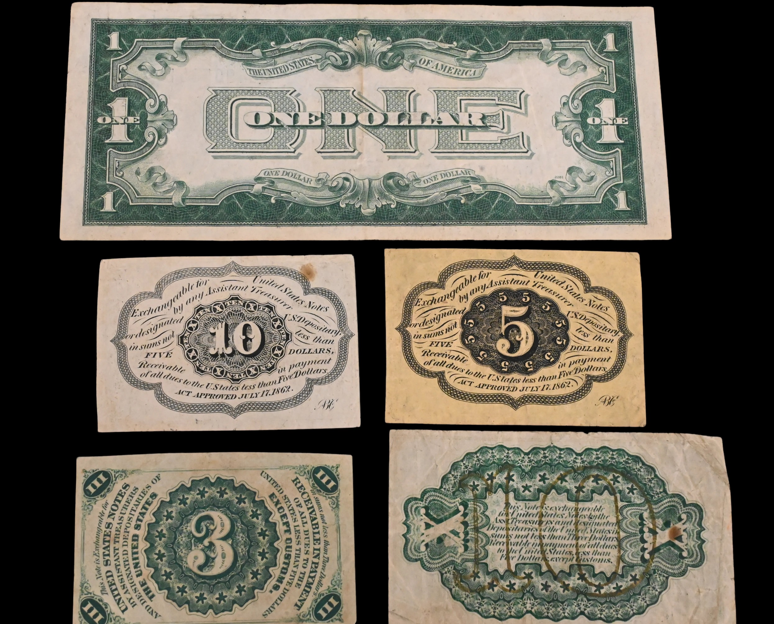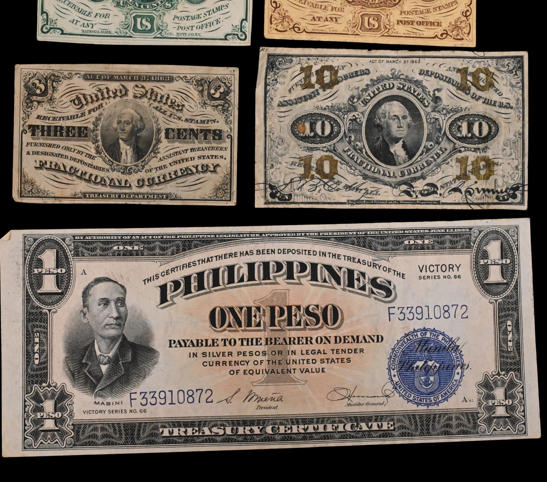 10 Cent third issue, 3 cent third issue, 5 cent first issue, 10 cent second issue, along with one $1 silver certificate and one Philippines $1 peso, total six notes, VG to XF