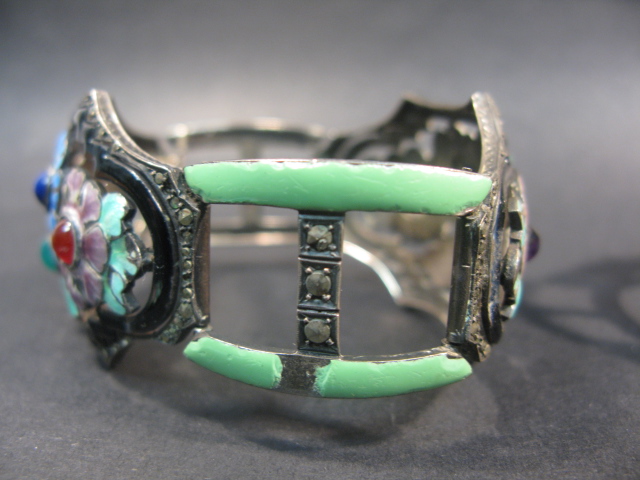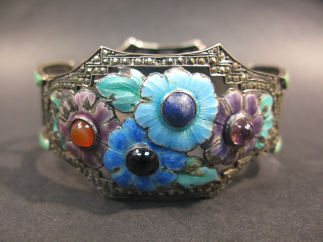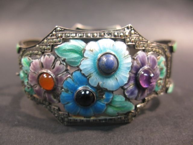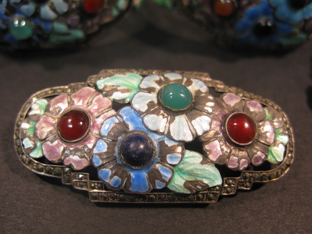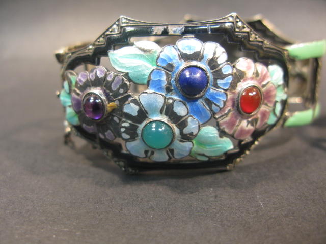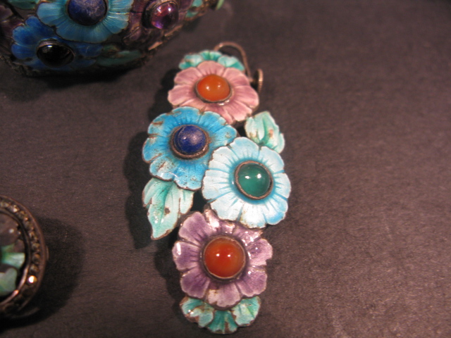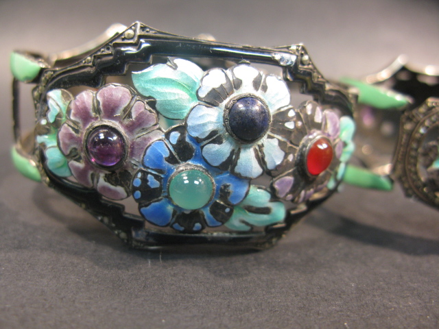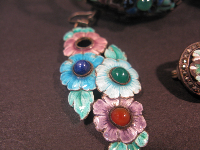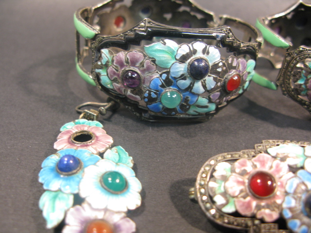Pair of enameled bracelets along with earrings and matching pin of enameled flowers set with cabochon cut stones, minor chips, one stone missing.
