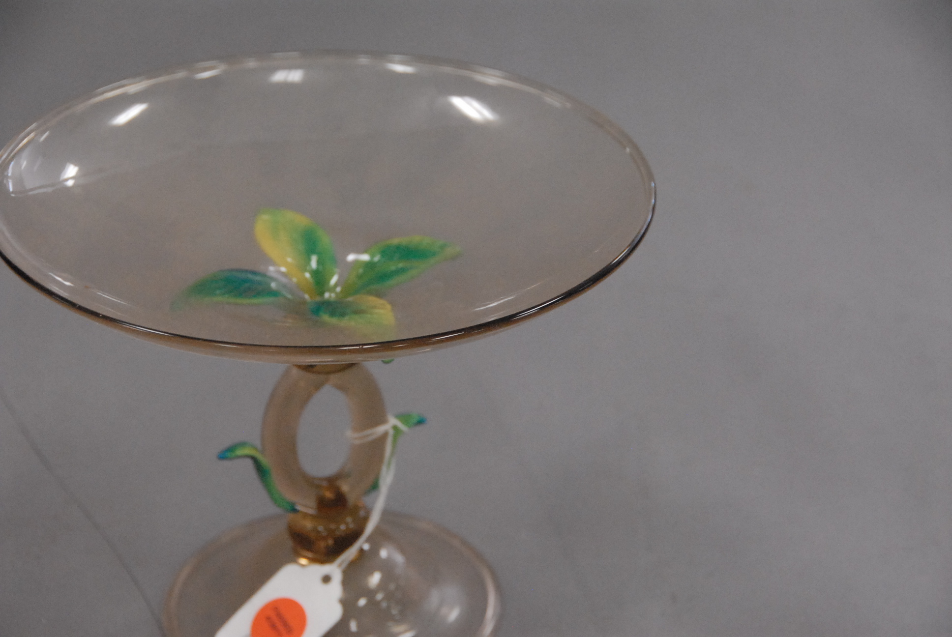 Pair of Venetian glass compotes, light brown mounted with deep green leaves.