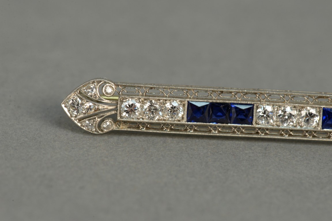 Platinum diamond and sapphire bar pin with twenty-one diamonds and six sapphires.