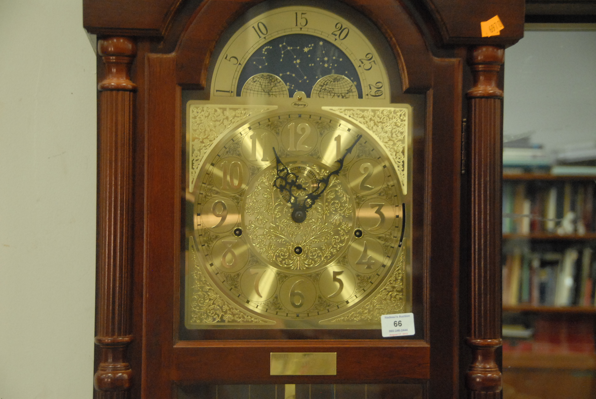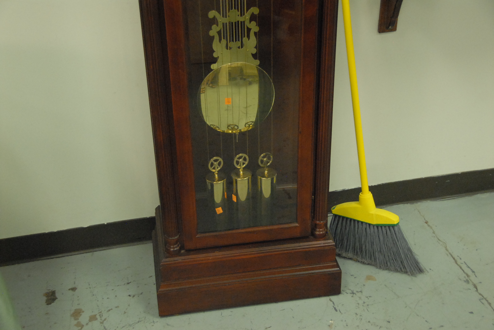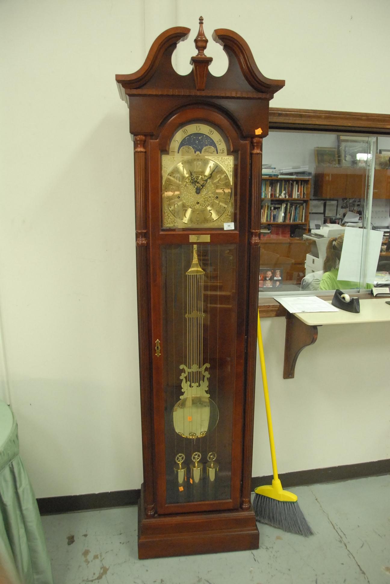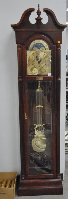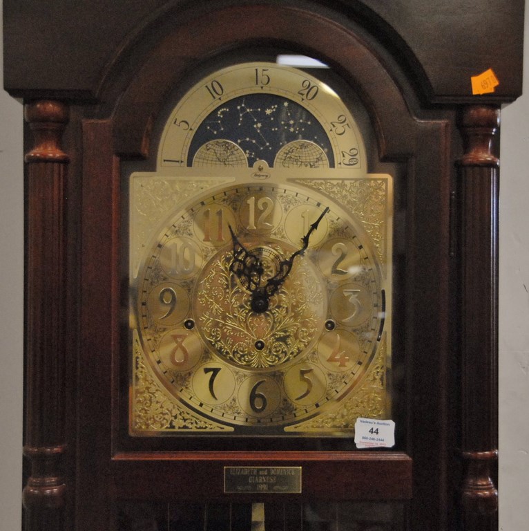 Lot 44: Ridgeway tall clock with brass weights and pendulum, ht. 7’1.