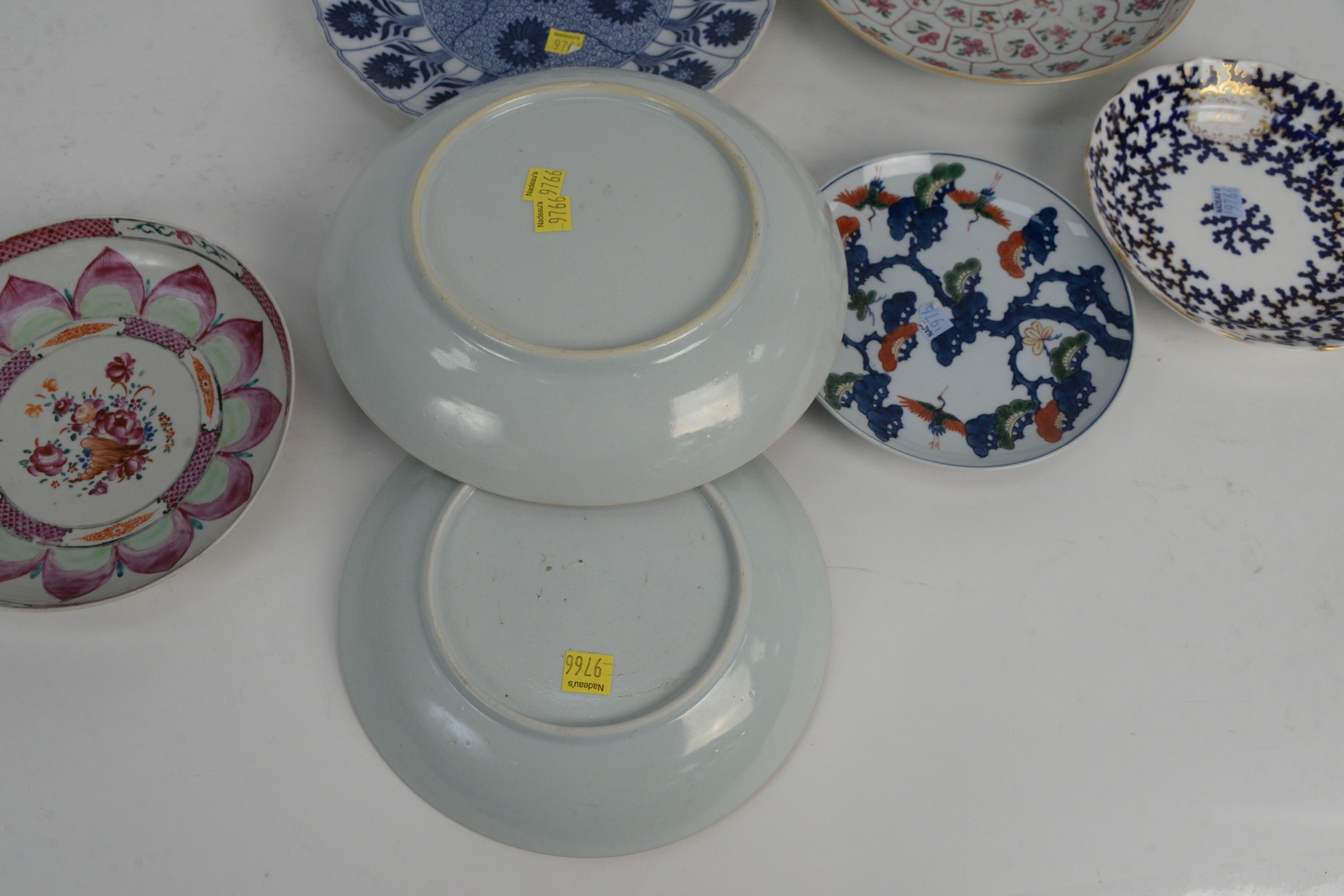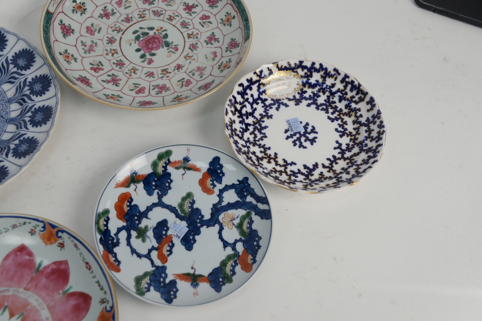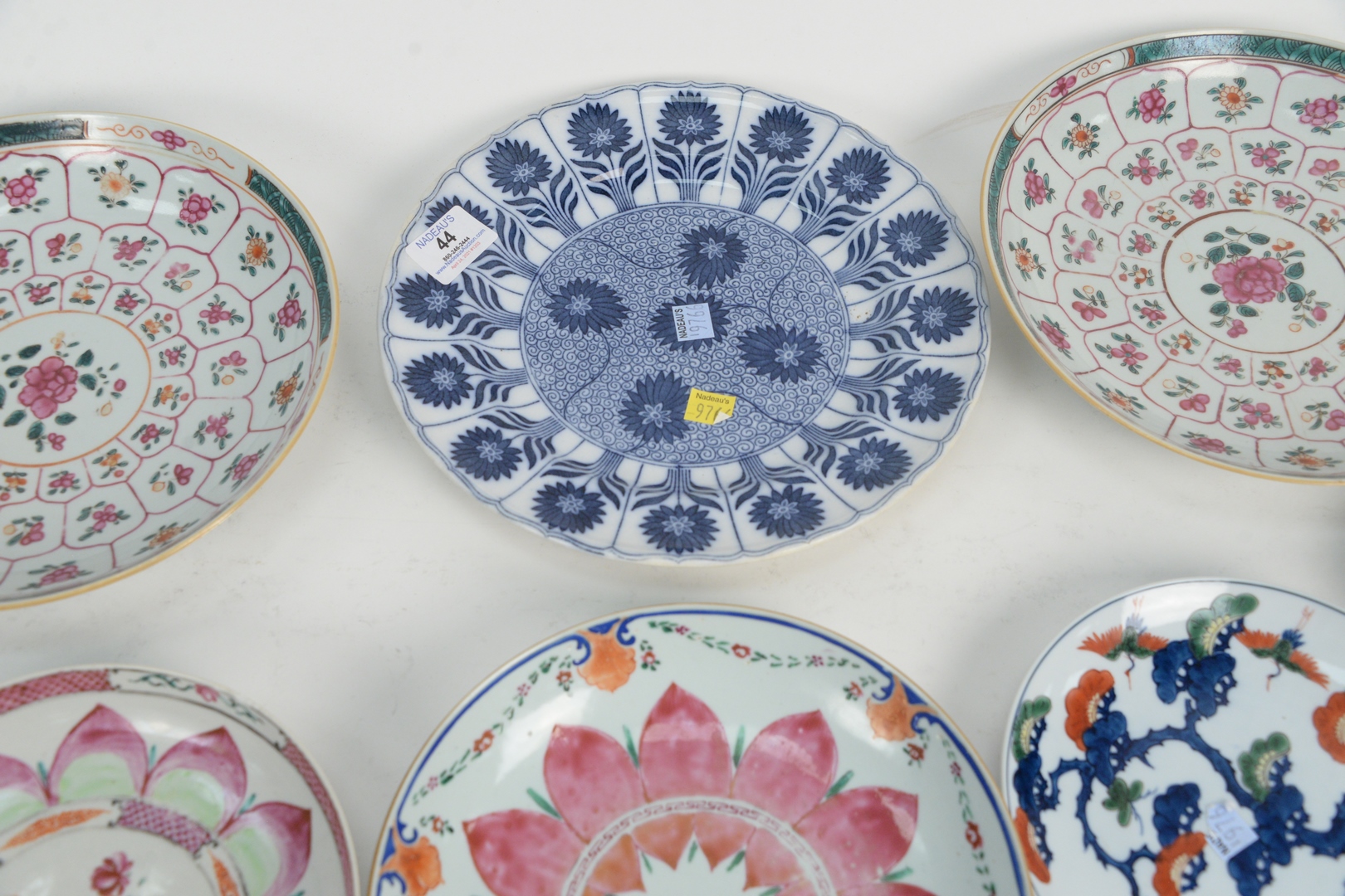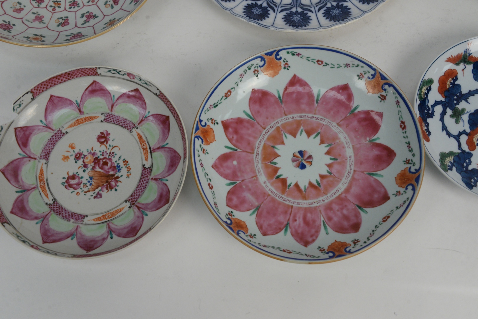 Lot 44: Seven Porcelain Plates to include Chinese Famille Rose saucer plates, a pair decorated with lotus form cartouches with flowers, two with large pink lotus petals, along with 3 other plates, diameters 7 1/4 – 9 1/2 inches.
