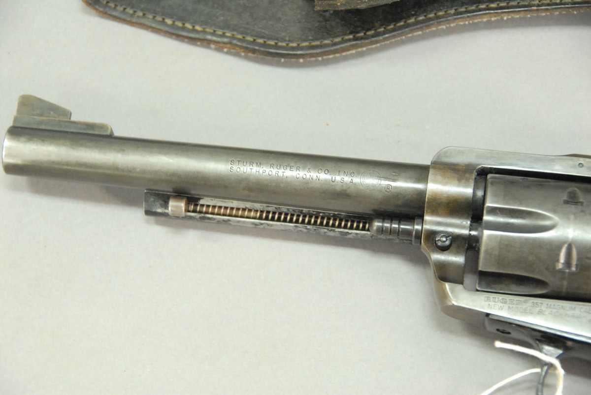 Stoum Ruger Blackhawk, revolver 357 magnum new model 6 1/2 barrel with leather holster. 213 SN-32-64297