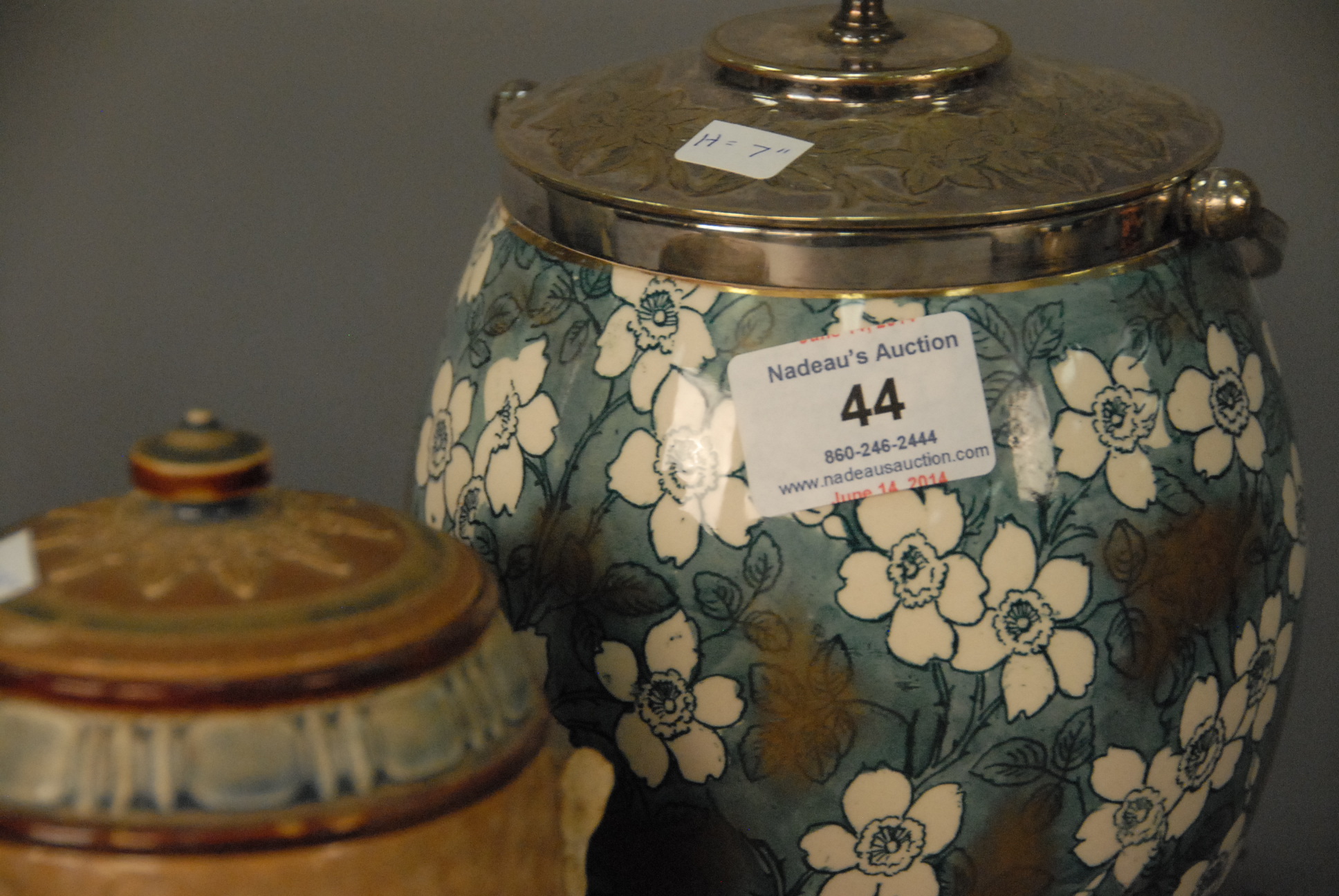 Lot 44: Three Doulton pieces to include Doulton lambeth jar with cover ht. 5 1/2in., Doulton biscuit jar ht. 7in., and Royal Doulton pitcher…