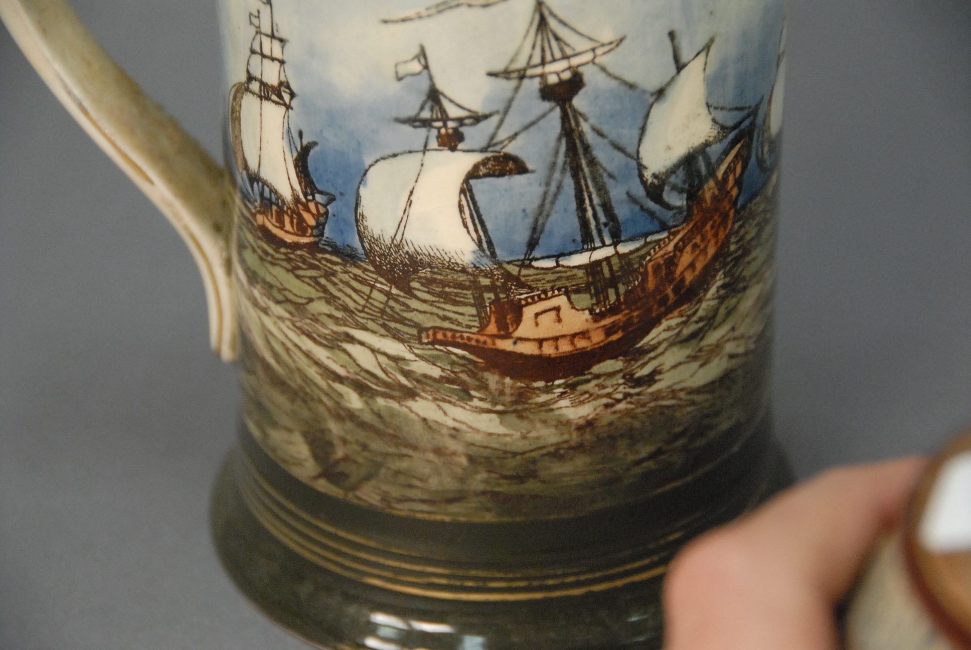 Three Doulton pieces to include Doulton lambeth jar with cover ht. 5 1/2in., Doulton biscuit jar ht. 7in., and Royal Doulton pitcher Galleon ht. 8in.