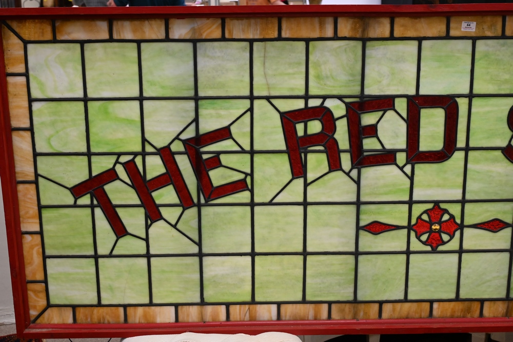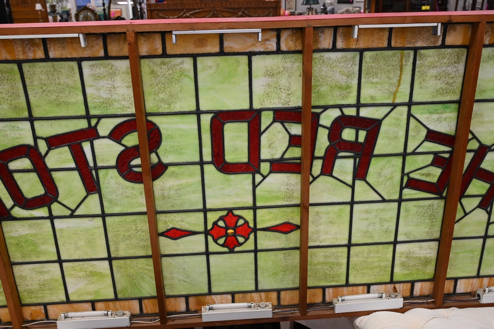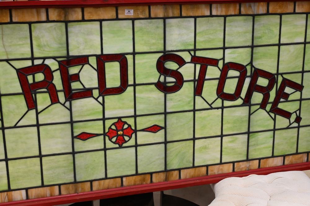 Lot 44: Three Leaded and Stained Glass Windows, one to include a lighted center having “The Red Store” logo, center 38 x 97 1/2 inches, each side 39 x 25 inches.