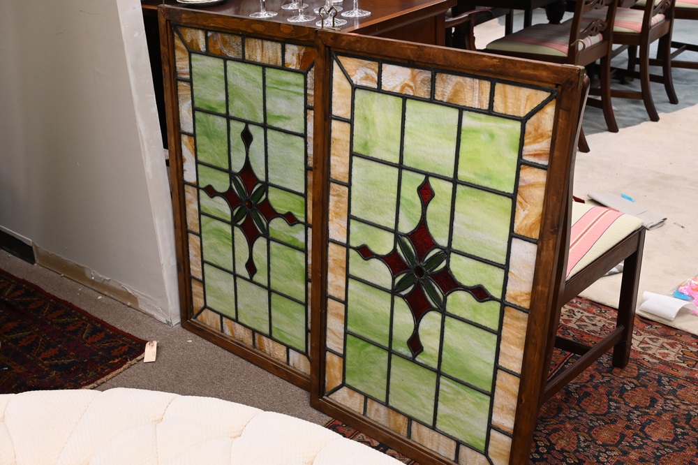 Three Leaded and Stained Glass Windows, one to include a lighted center having “The Red Store” logo, center 38 x 97 1/2 inches, each side 39 x 25 inches.