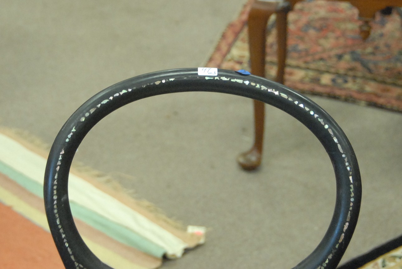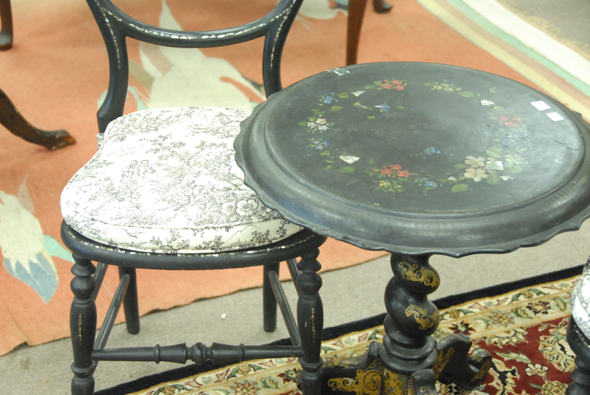 Three piece lot to include two mother of pearl inlaid side chairs with rush seats and mother of pearl inlaid paper mache table chip on table.
