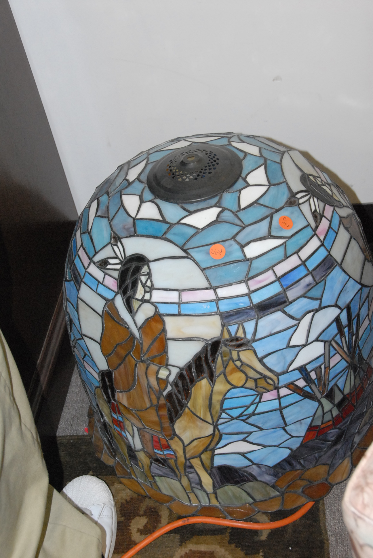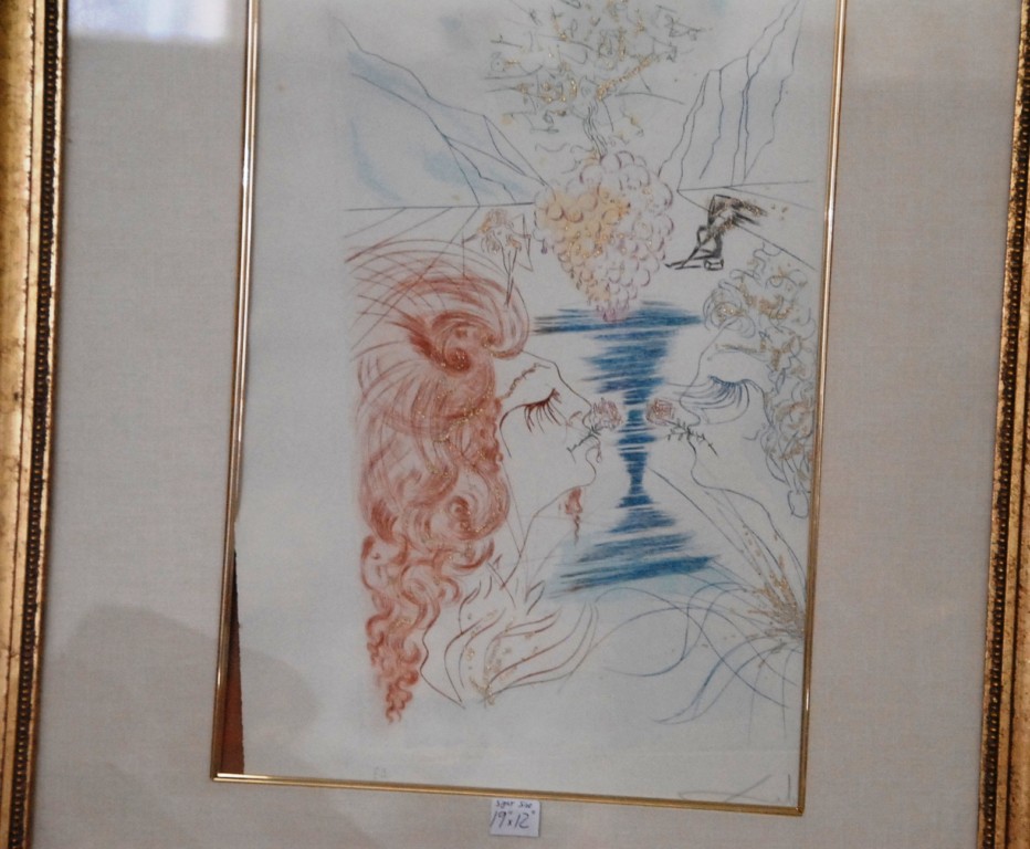 Three piece lot two pencil signed prints, one is Salvatore Dali pencil signed lower right, 19 x 12 along with a leaded lamp shade.