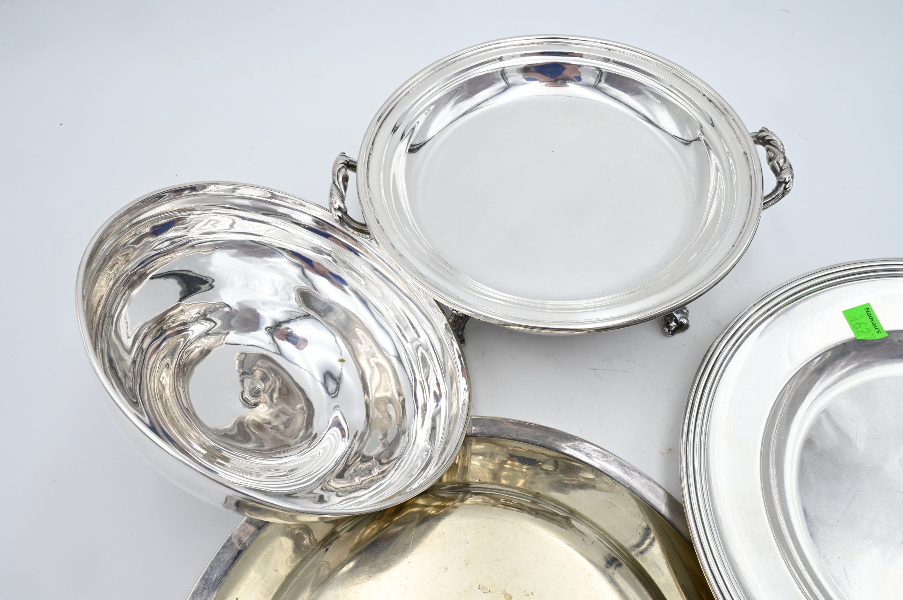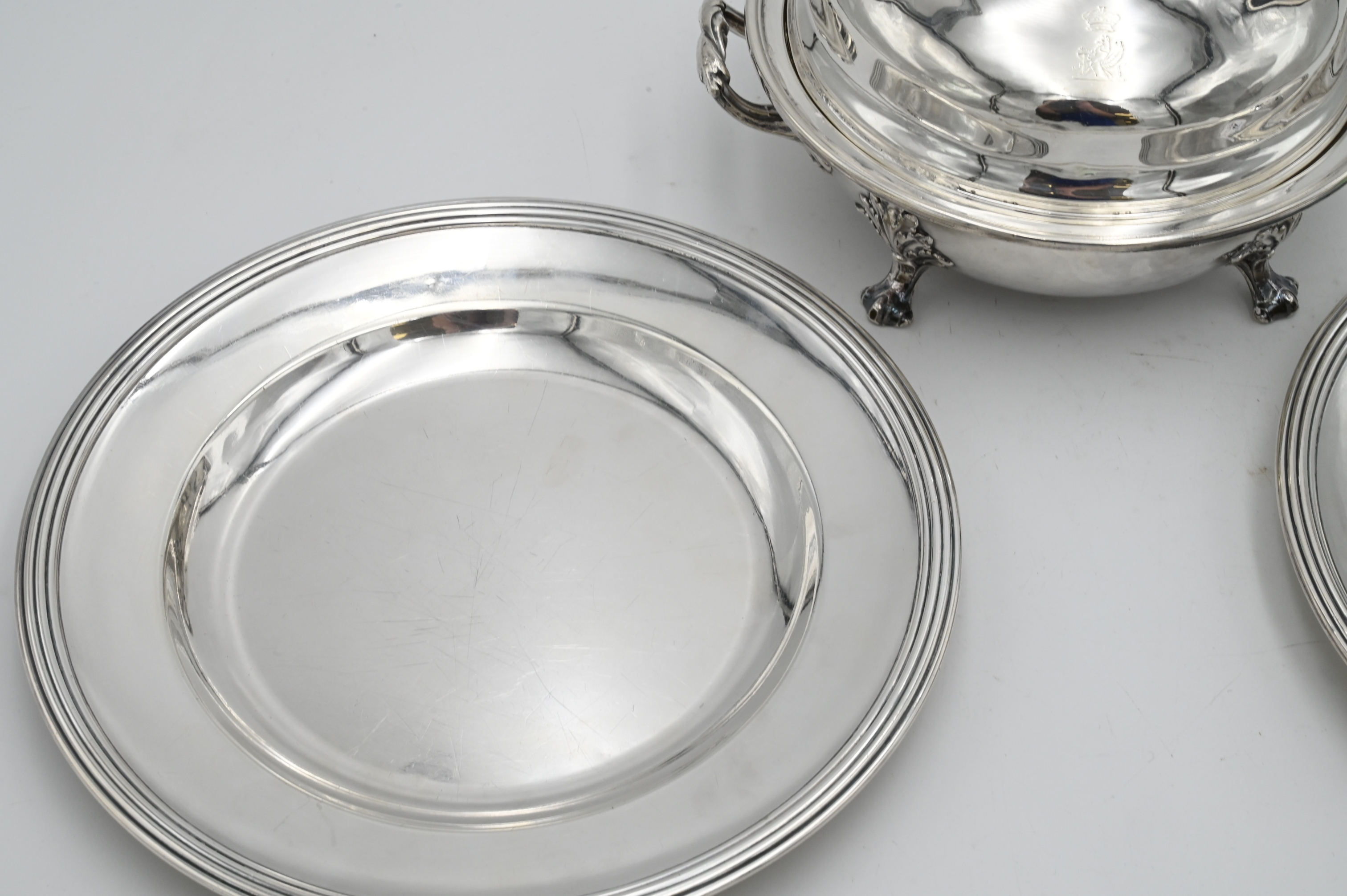 Three Piece Silver Plate Lot, to include two Christofle plates, along with sterling plate covered dish, plates diameter 10 5/8 inches.